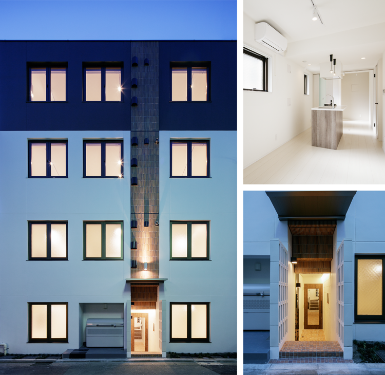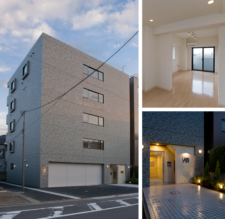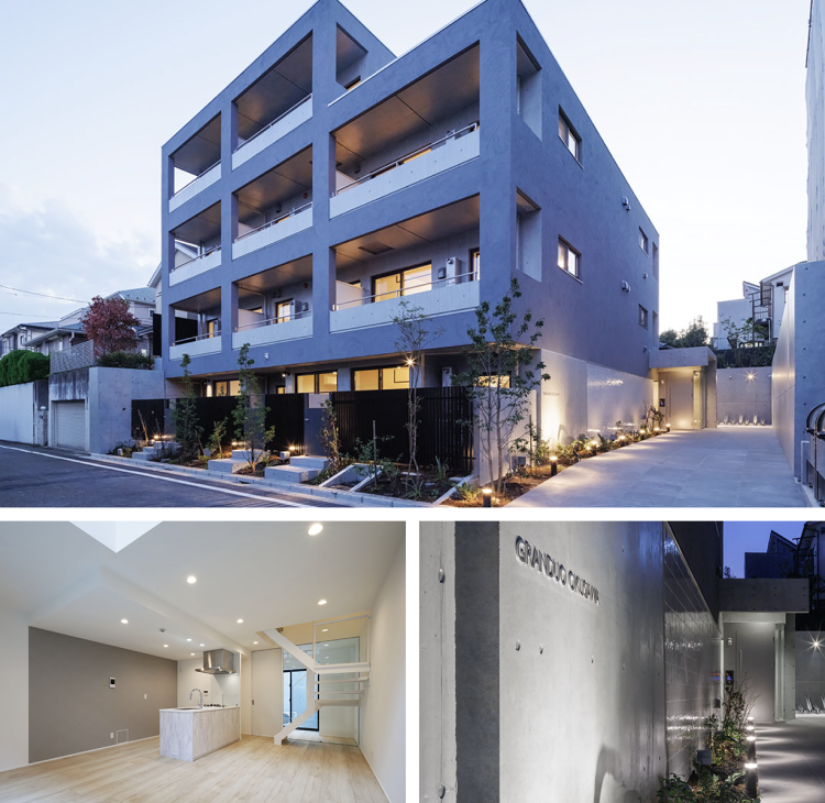 GranDuo 田園調布は、自由ヶ丘と田園調布の中間に位置し、1階は店舗、2〜5階はワンルーム14戸、最上階に1LDKが1戸の建物です。前面道路は都市計画道路のため、6mほど後退した配置となりました。外観はグレーのタイル貼り。正面は各階一か所、両袖引き窓を中央に配置し、対称的な外観としました。内装は白を基調とし、明るくナチュラルな印象で、南に開けたバルコニーからは、田園調布の街並みを見ることができます。また、クローゼットは、可動式のものとし、入居者が自由に配置することができます。