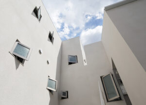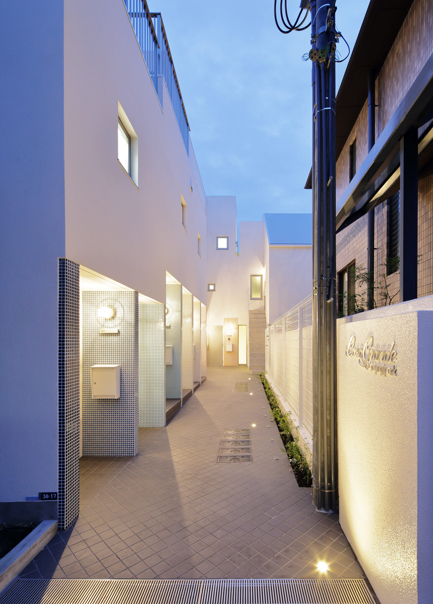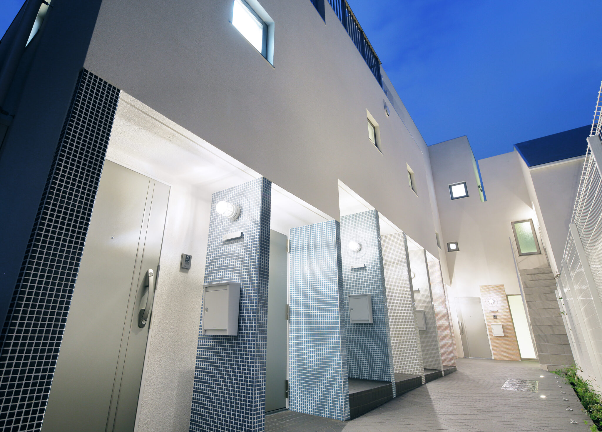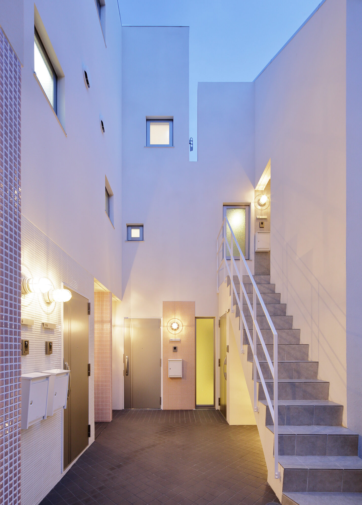 敷地入口から正面に見えるスリットや正方形の窓に加えて、各住戸の玄関が路地に並ぶことを利用して、それぞれの玄関に青・白・ピンク・オレンジのモザイクタイルを袖壁を設けました。