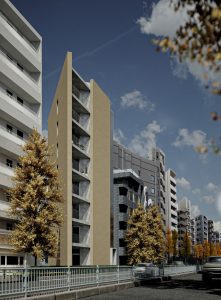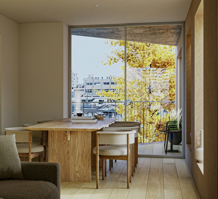 駅から敷地まではサクラ並木、イチョウ並木と都会にいながらも季節を感じる豊かな環境にあり、一方で目黒通りに面し、交通量が多く、騒音や視線の解消等、都会に住む際の避けては通れない問題がありますが、三角形という敷地形状や周辺環境、コンテクストを読み解くことで、環境と共生する魅力的な建物を目指します。