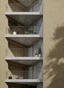 大通り沿いの交通量の多い道路に面し騒音や視線の解消など都会では切り離せない要素ではあるが、周辺環境やコンテクストをしっかりと読み解き、壁を配置することによって内部環境を整え、都心でありながらも、視線の抜けや風や光の通り抜ける豊かな住環境を目指します