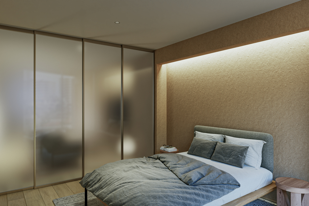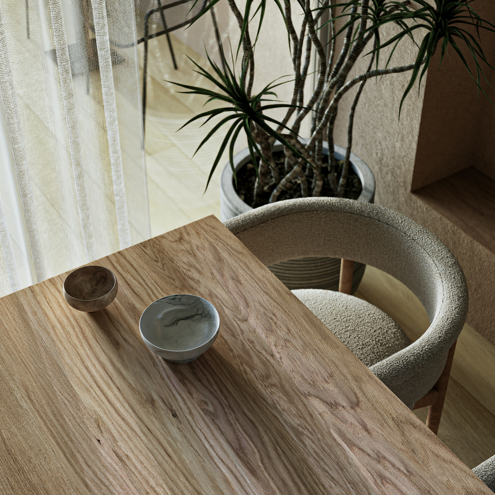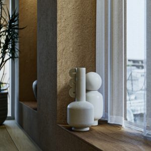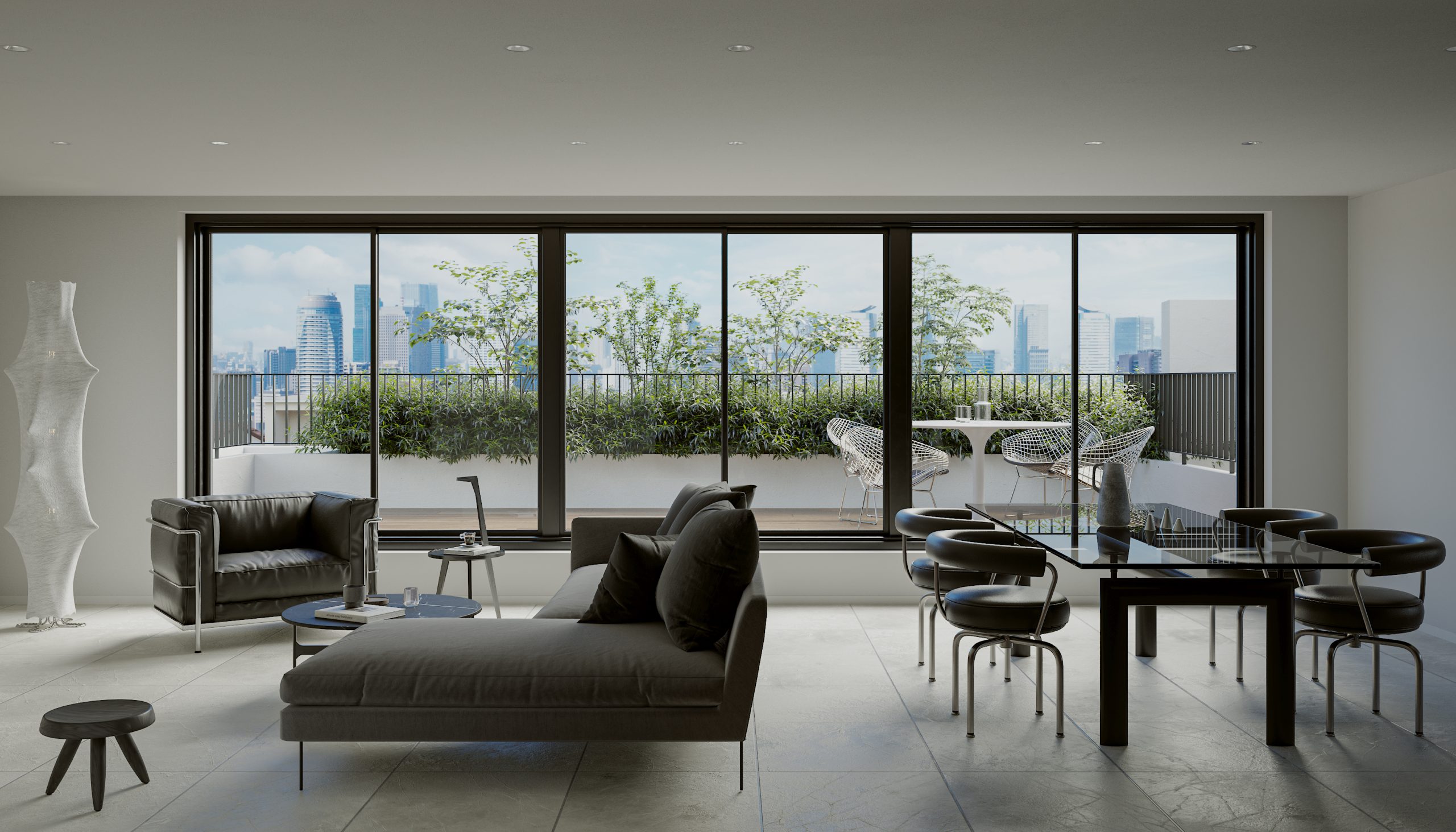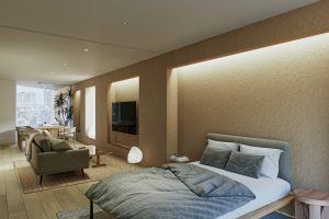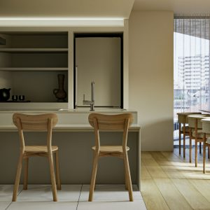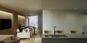 1フロア1住戸であることから、共用部から居住空間にグラデーショナルに空間を連続させる計画とします。水廻りとEV コアをひとまとまりとすることで、L 字に抜ける大きなワンルーム空間を実現します。キッチンとエントランスを一体的につくることで、南北に繋がる空間の自由度を高めます。また、各角へ向かって開口部を設け、光や風の流れ、視線の抜け、プライバシーを確保します。