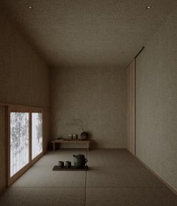 LDKを直線的に連続させることで「長さ」を強調しつつ、ギャラリー・茶室・日本庭園・アウトドアリビングを有機的に連続させることでシーケンシャルで「奥性」を共存した空間としました。二層メゾネットとしつつ高度斜線によって切り取られる斜めの空間を生かした吹抜けをつくることで「高さ」を表現した印象的な空間としました。吹抜けの空間に沿って日本庭園を配置することで、板張り勾配屋根の軒先によって切り取られる印象的なシーンを生み出しています。勾配屋根・和室・縁側・縦格子といった和の要素を取り込むことで、さまざまな距離感を表現した他に類を見ない空間を創り出しました。