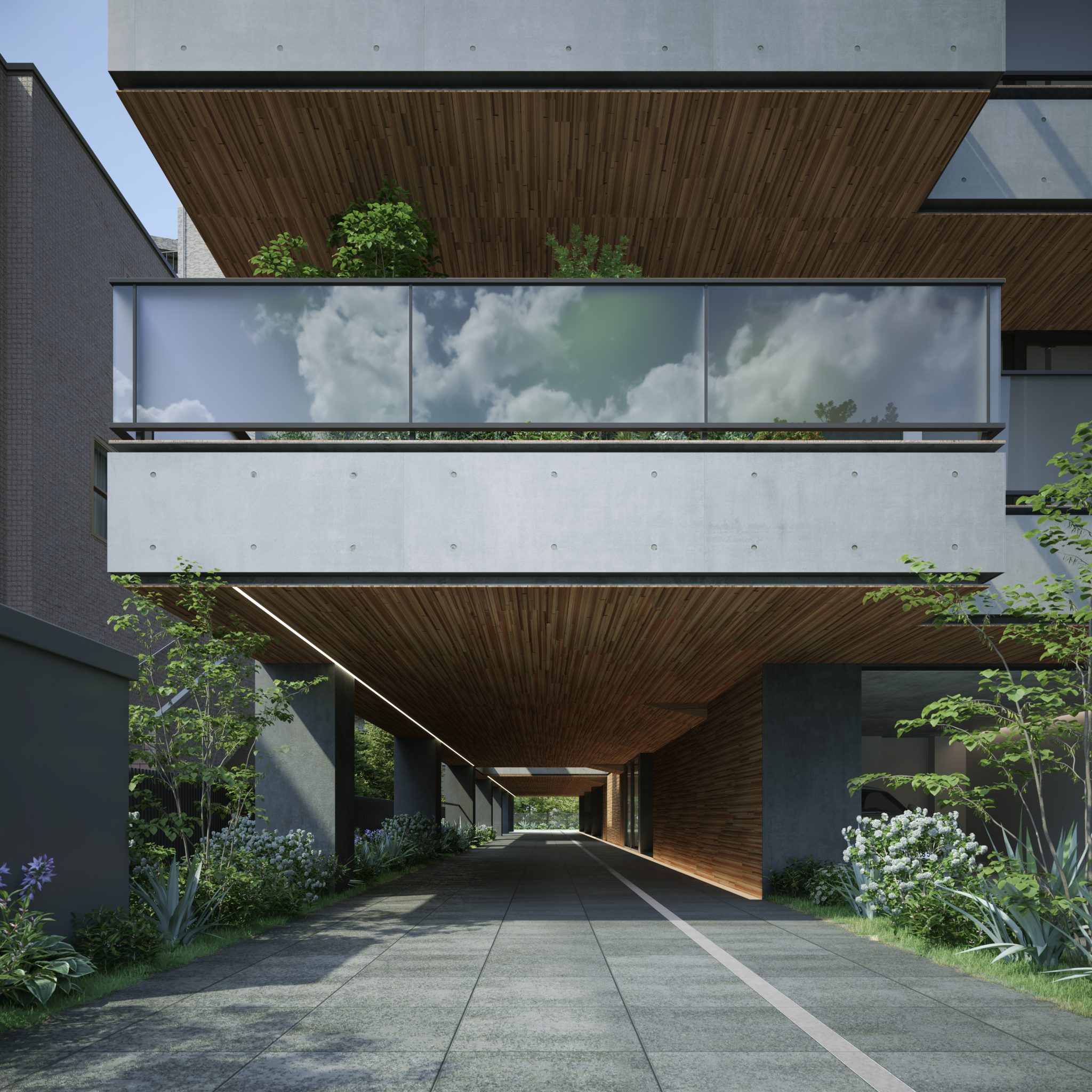 奥行50m幅12mの細長い敷地特性を活かし、長さや距離感をテーマにしてデザインすることで、この場所にしかない建物としました。敷地形状に合せて、長さ46m厚さ900mmのコンクリートスラブをシンプルに6枚重ねる事で建物を構成しています。車路と歩道を兼ねる長さ50mの通路をメインエントランスとすることで、敷地特性を活かした奥行のあるデザインとしつつ、ライン照明や板張りの軒天によって、より軸線や長さを強調したデザインとなります。長さ50mのコンクリートの荒々しいイメージと軒天を板張りとすることによるサスティナブルなイメージの対比によって違和感と調和をデザインしています。