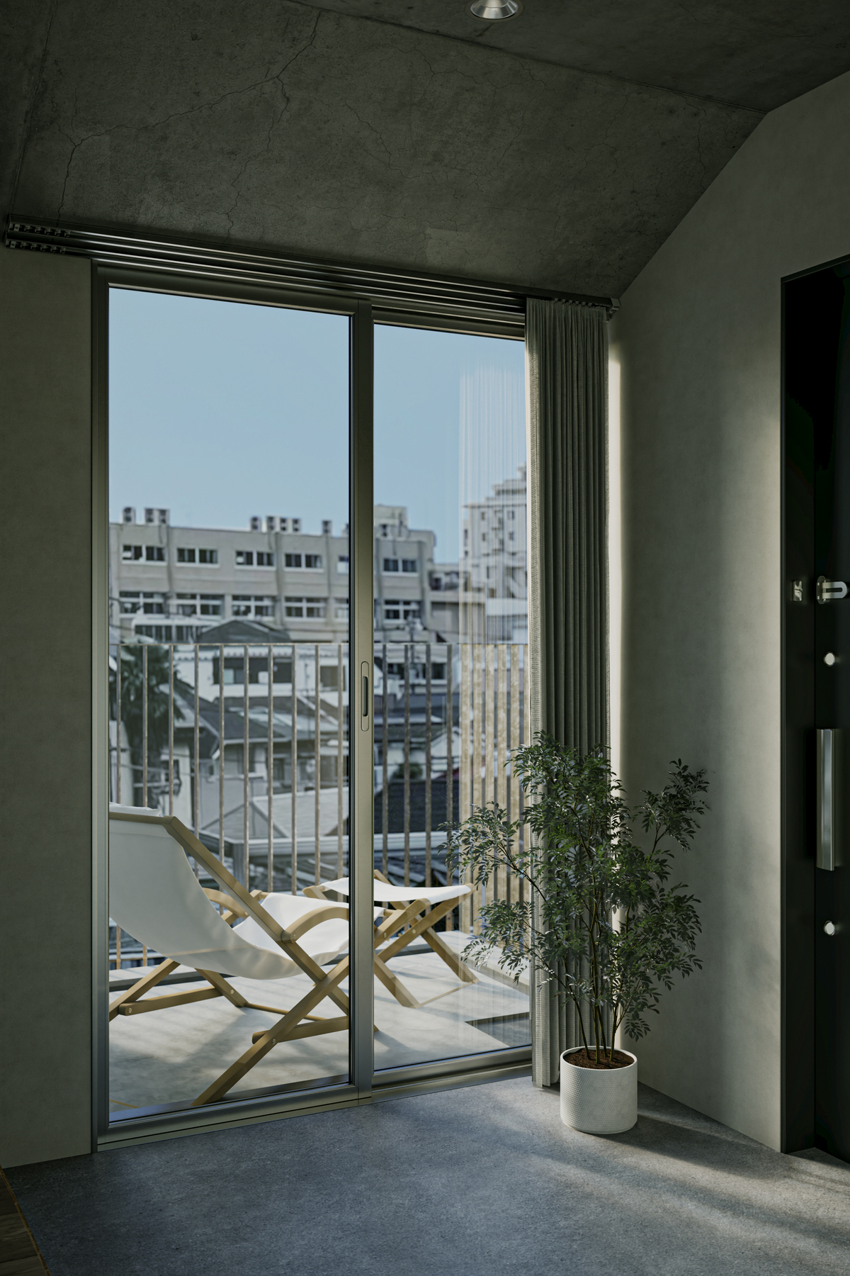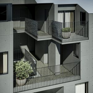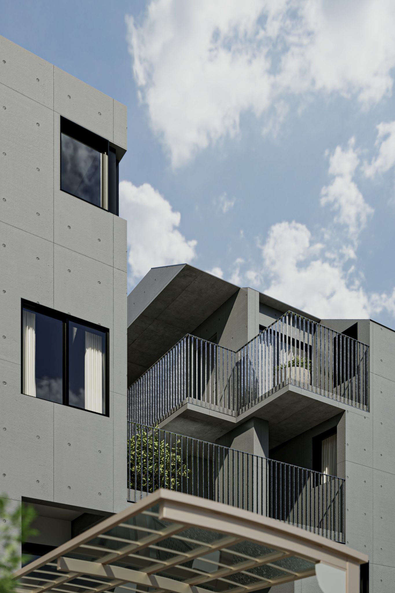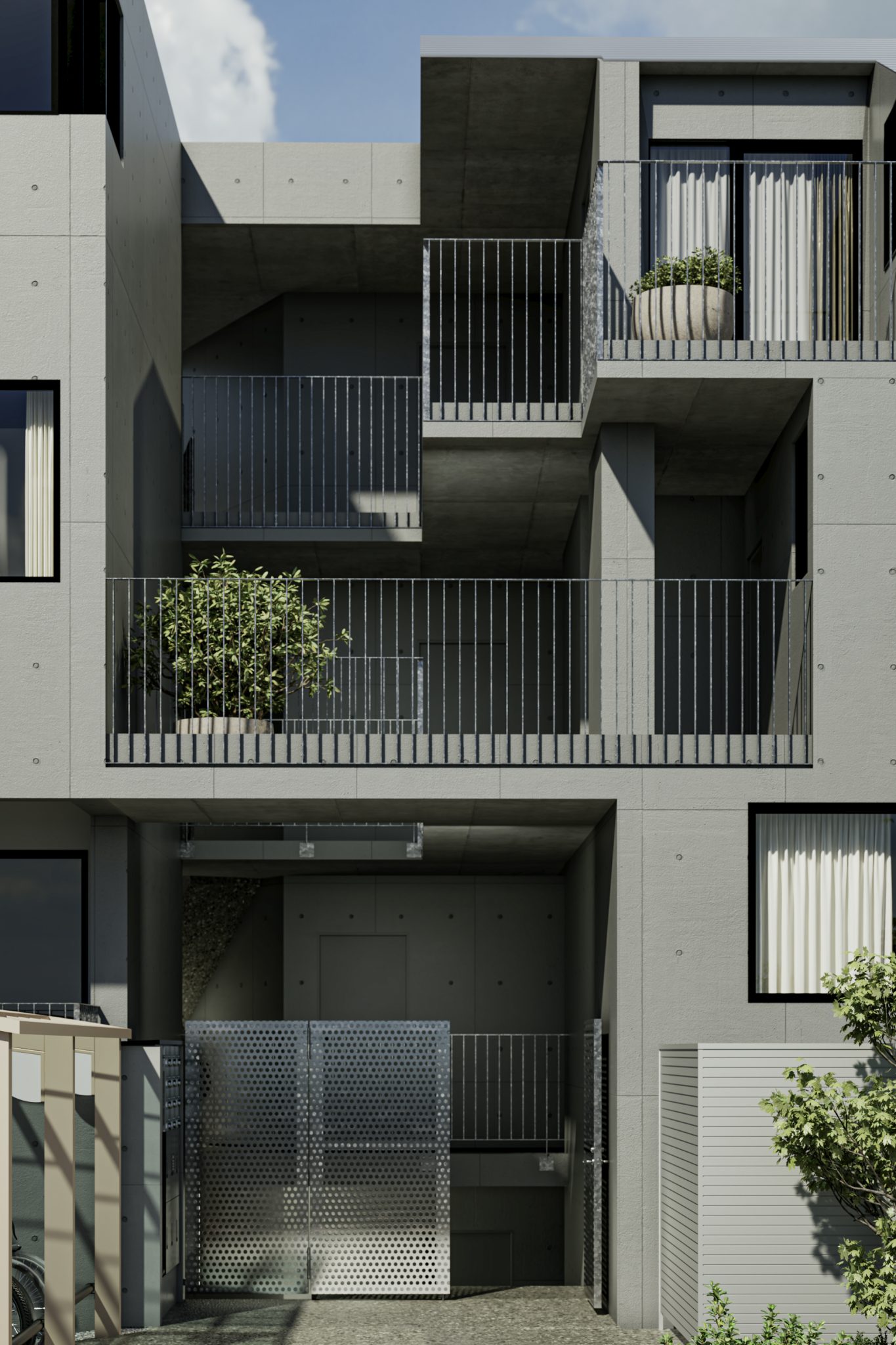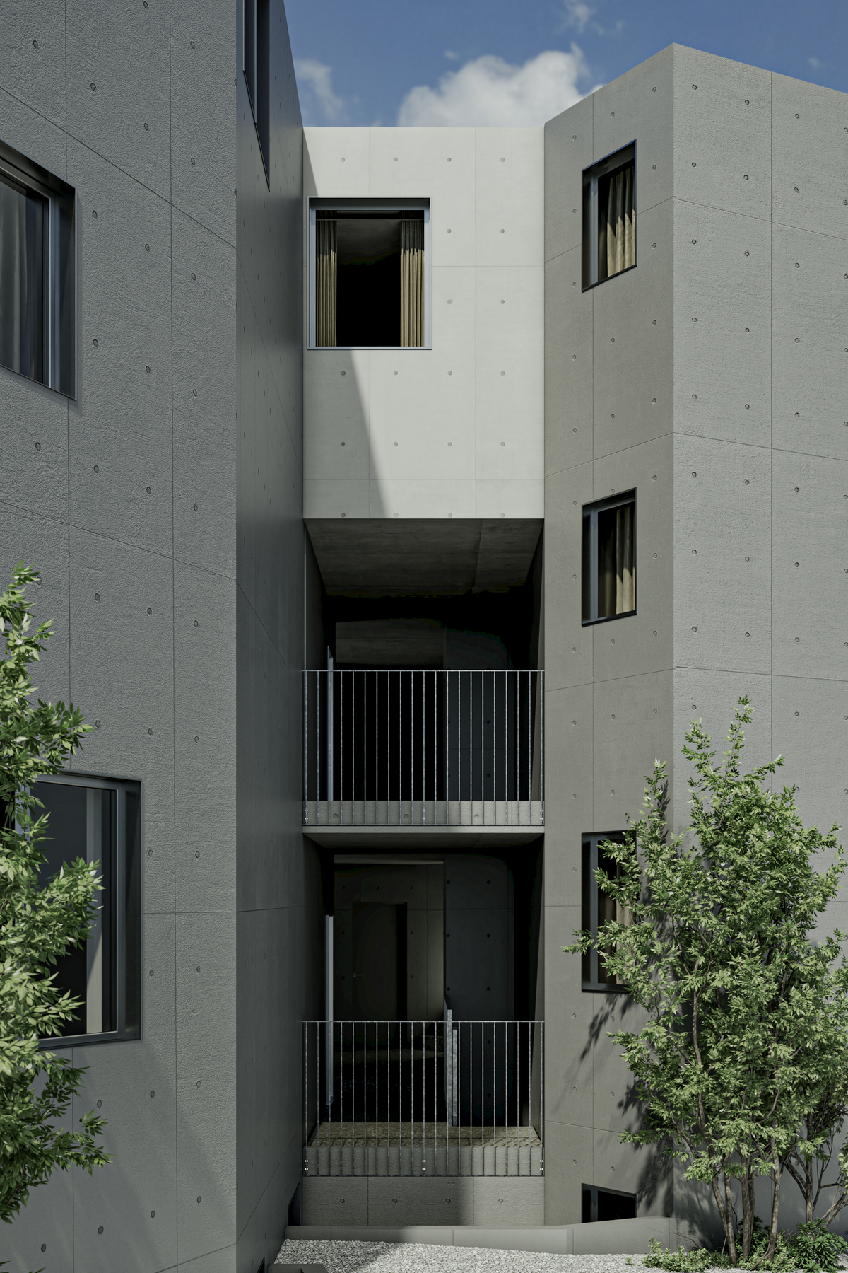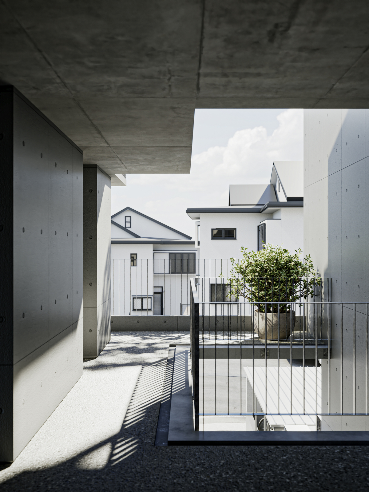 居住空間としてのプライバシーを確保しながら、賃貸集合住宅特有の閉鎖性を解消することを目指しました。道路から連続した前庭、街を立体的に引き込む共用部に加え、「+α」と名付けた公私の中間的な空間を設けることで、ここでの暮らしが意識的に街に開かれることを目指しています。