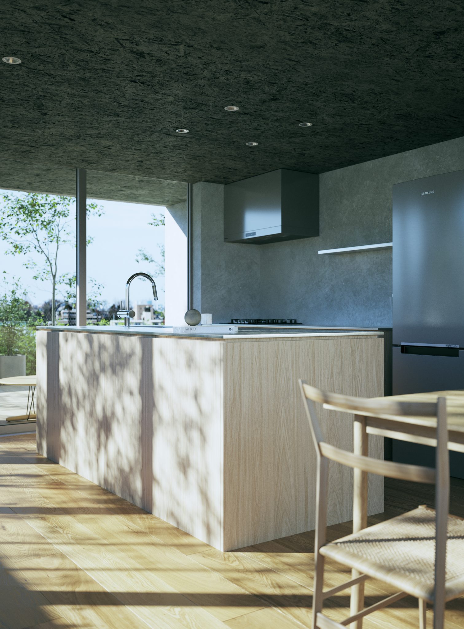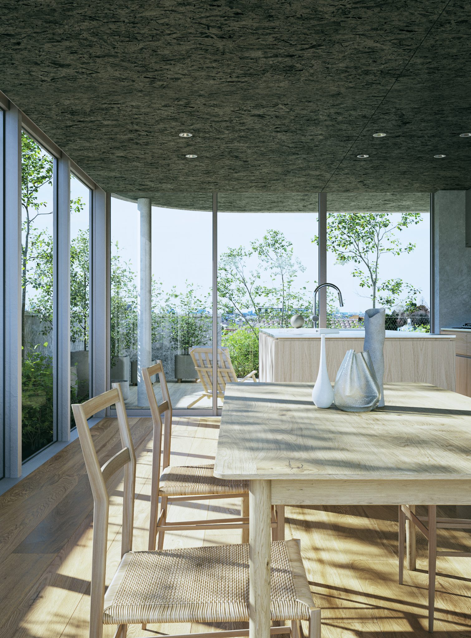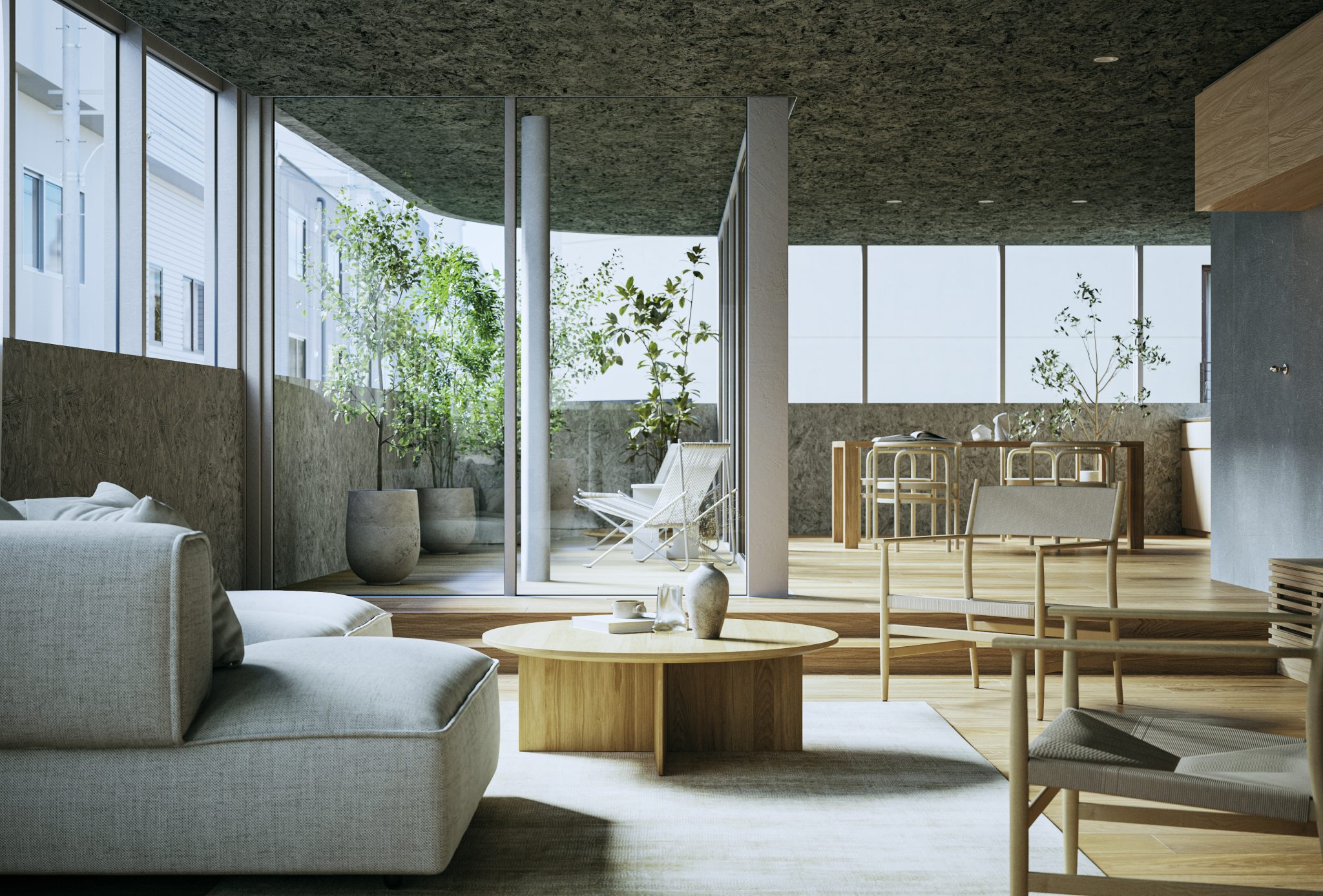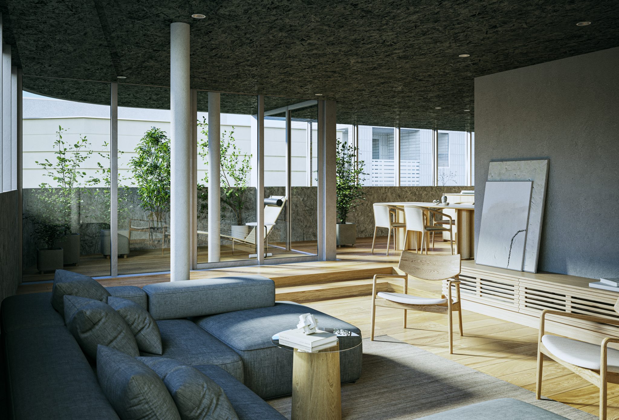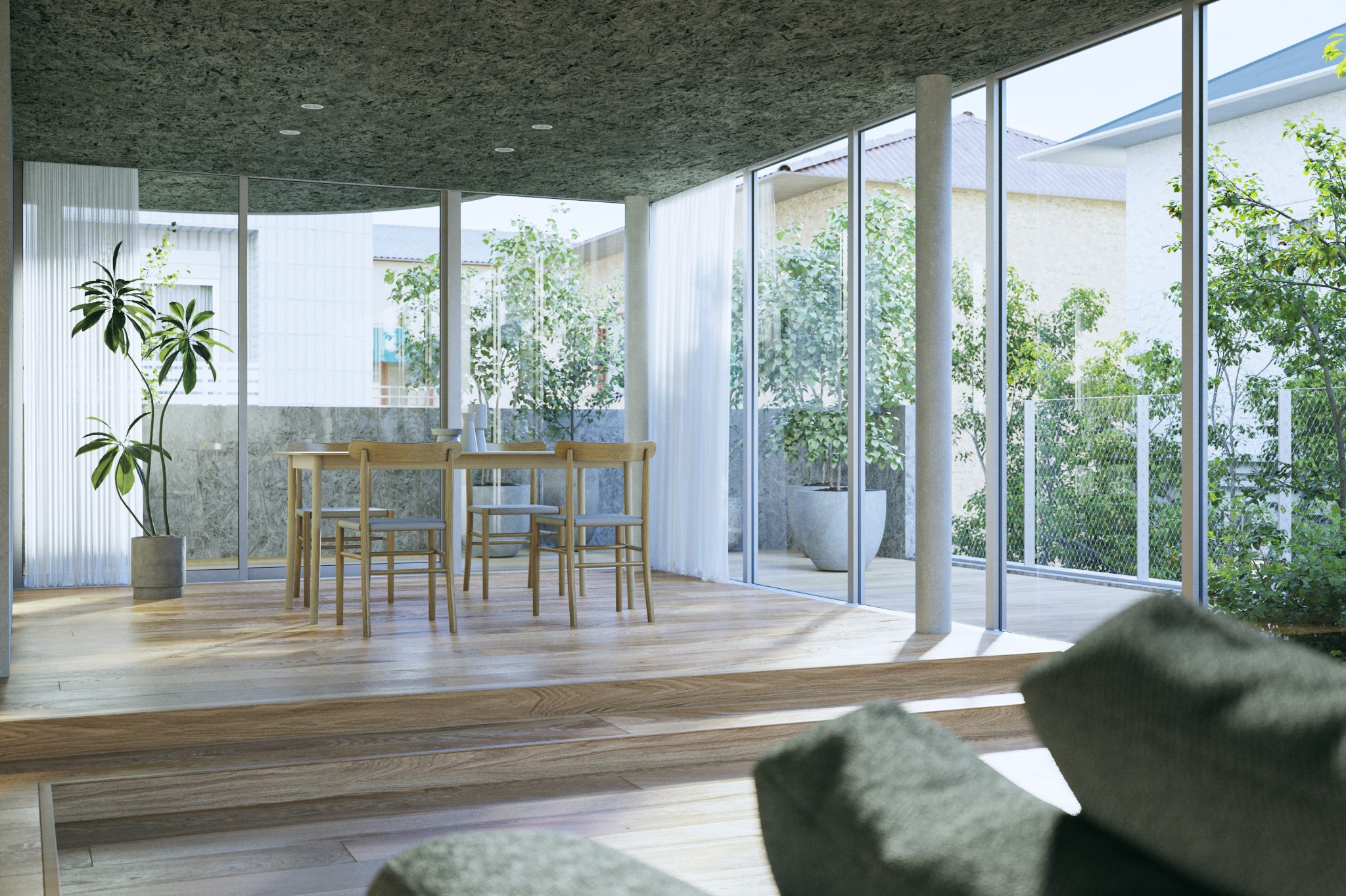 駅前から続く商店街に位置する立地。まるでバルコニーにいるように街の気配を感じながら開放的に暮らす家を目指しました。建物中央に設けた構造コアによって建物全体を支えることで周囲に大きく開けた構成としました。賑わう街の気配や、ルーフテラスに広がる緑豊かな植栽、窓から見上げる開放的な青空など、様々なものをパノラミックに感じられる住まいです。