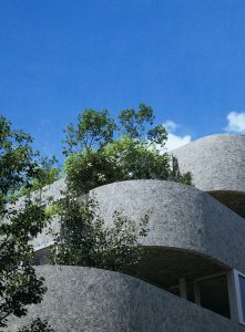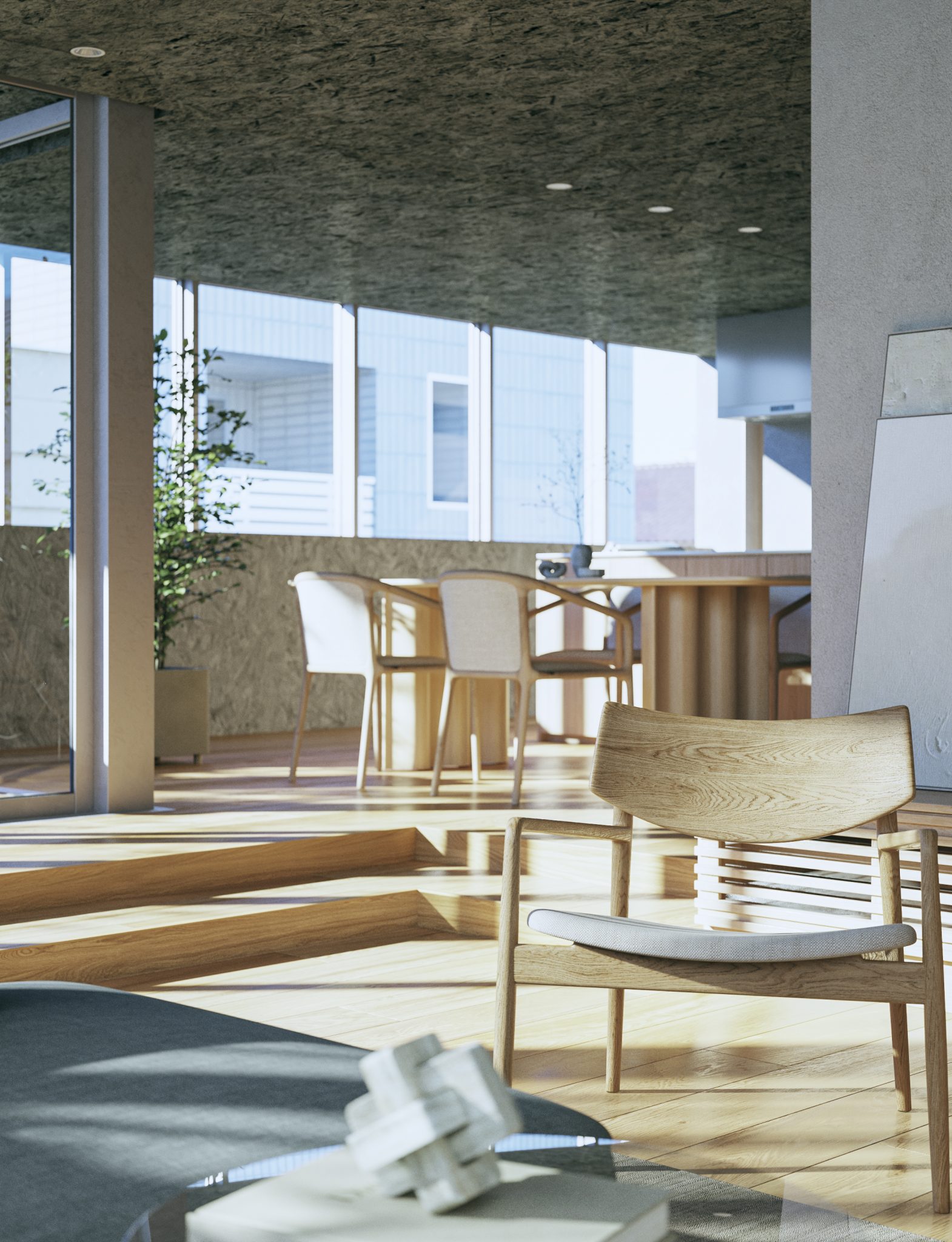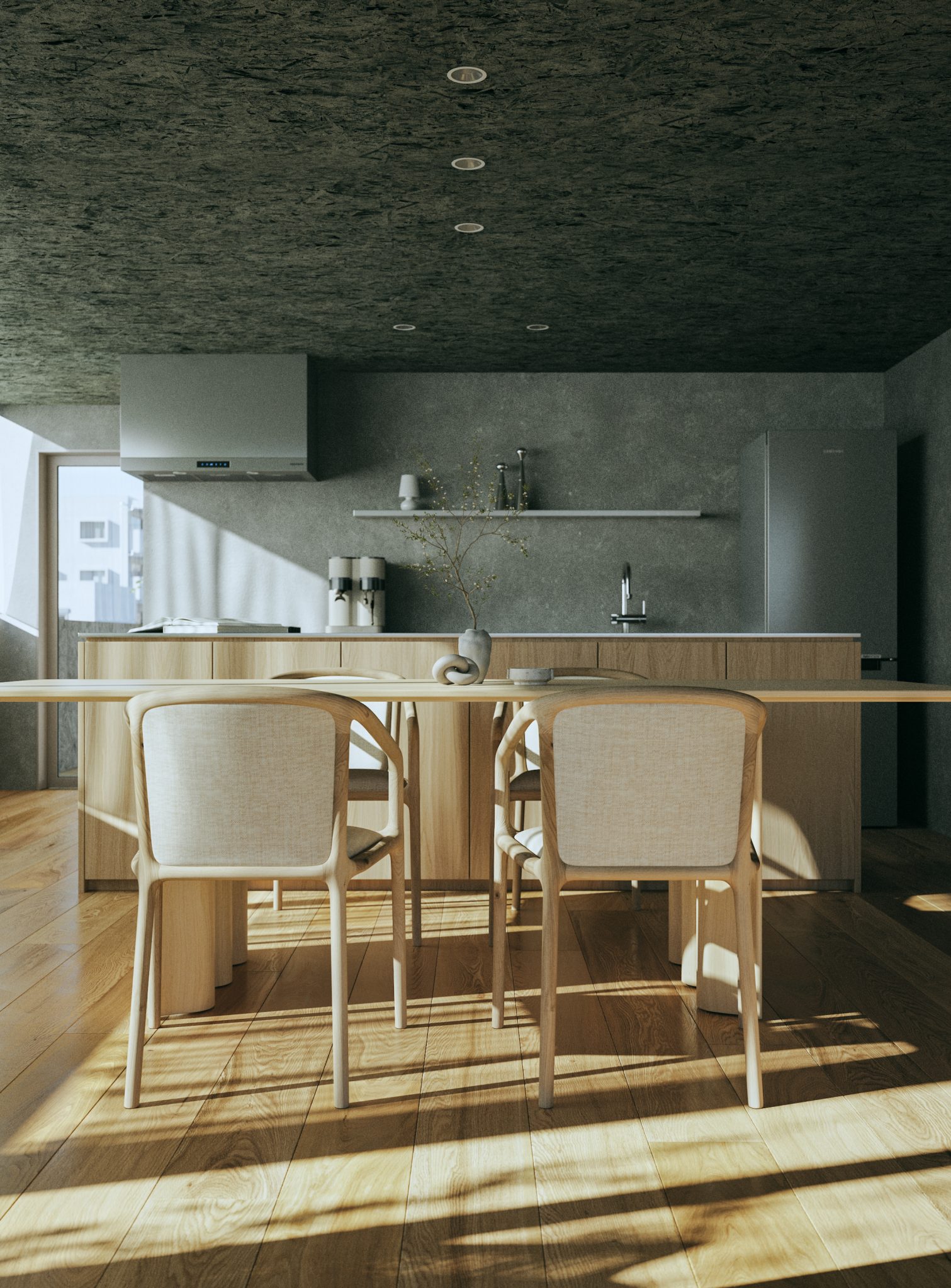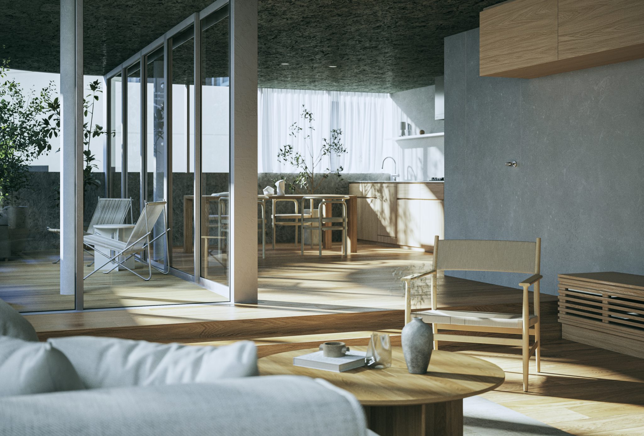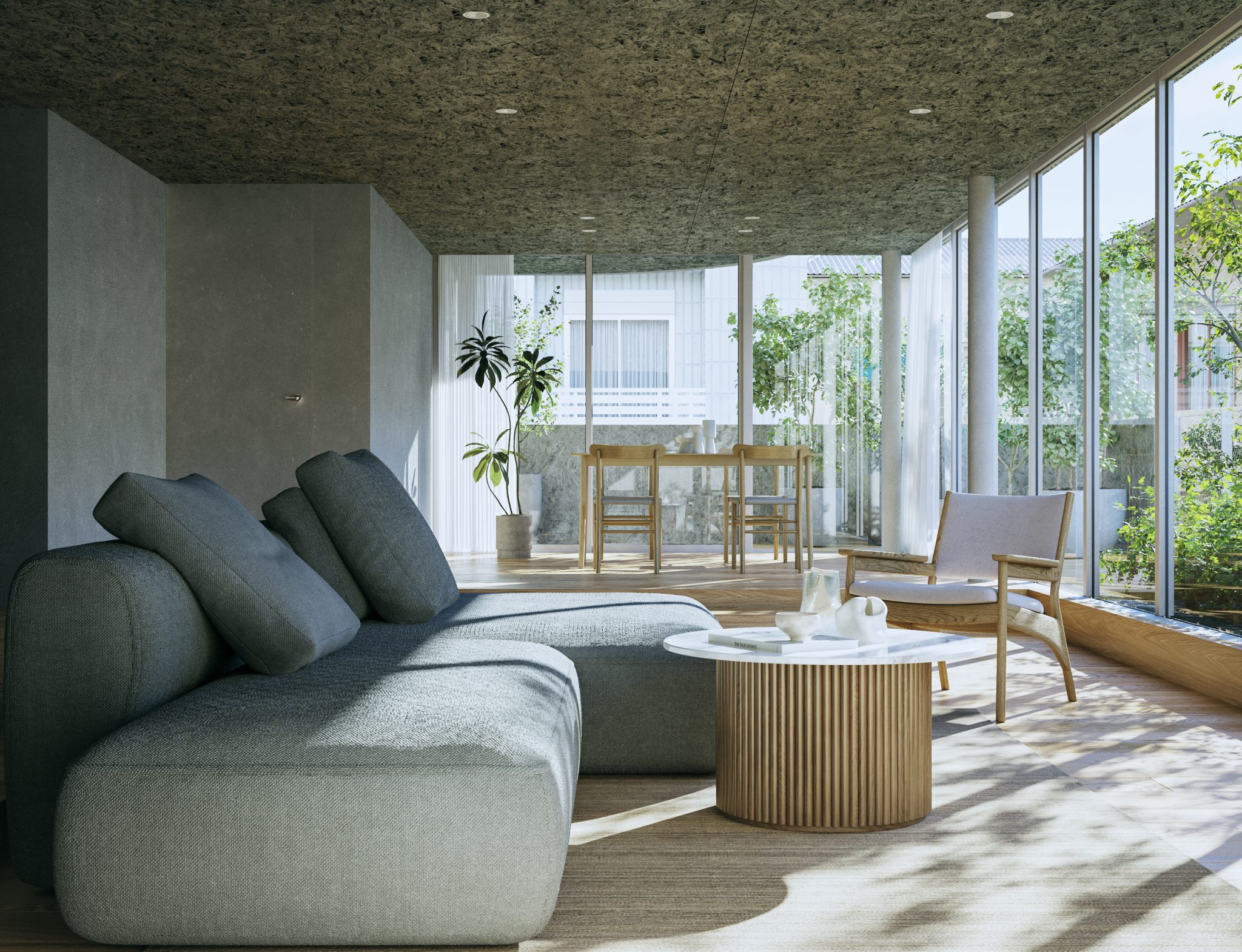 駅前から続く商店街に位置する立地。まるでバルコニーにいるように街の気配を感じながら開放的に暮らす家を目指しました。建物中央に設けた構造コアによって建物全体を支えることで周囲に大きく開けた構成としました。賑わう街の気配や、ルーフテラスに広がる緑豊かな植栽、窓から見上げる開放的な青空など、様々なものをパノラミックに感じられる住まいです。