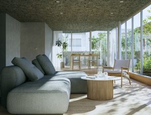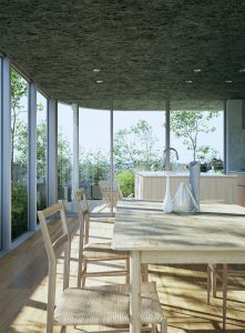 建物中央に設けた大きな構造コアが建物を支持することで、腰壁と窓が連続した開放的な外壁面とすることができ、街に向かって大きく開いた住戸となっています。遮る構造体がほとんどなく、パノラマビューが広がる室内は、大きなバルコニーのような開放感を得られる住戸空間となっています。