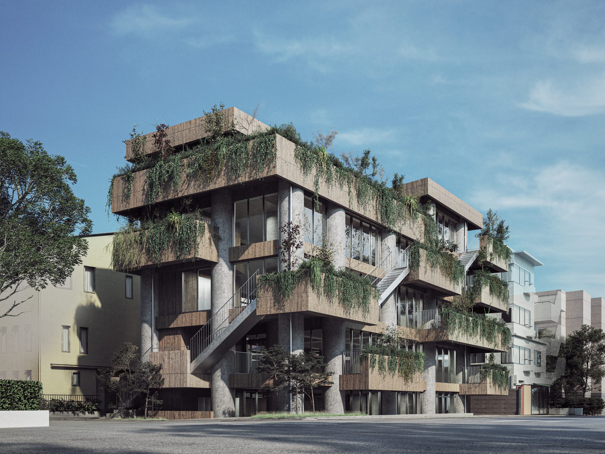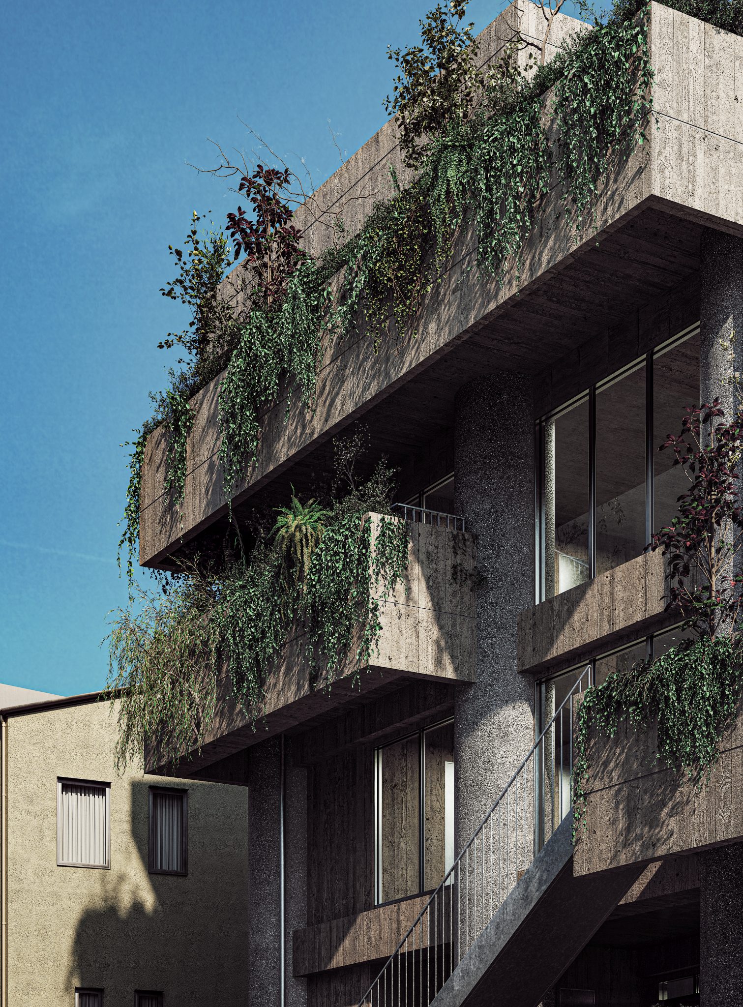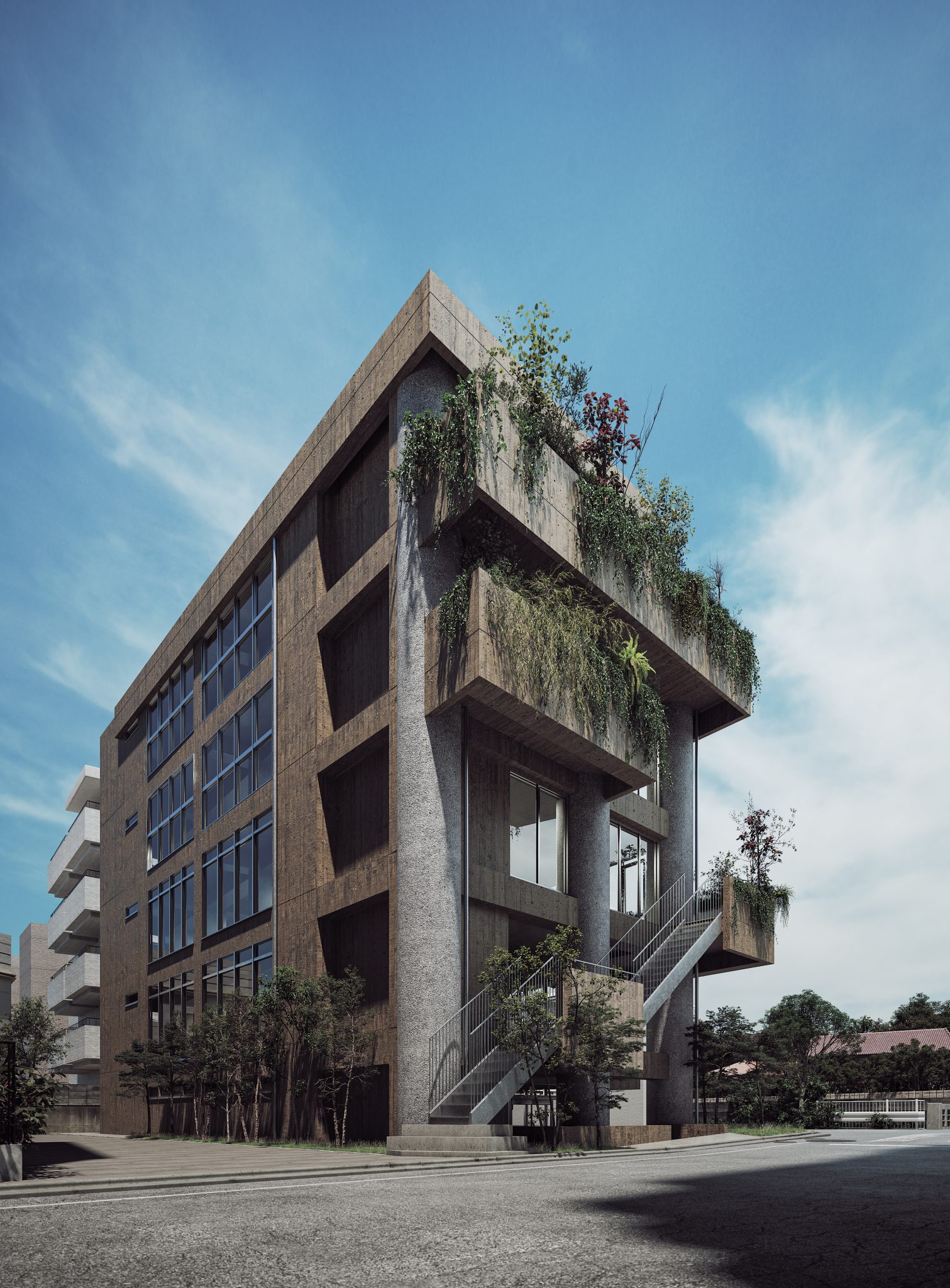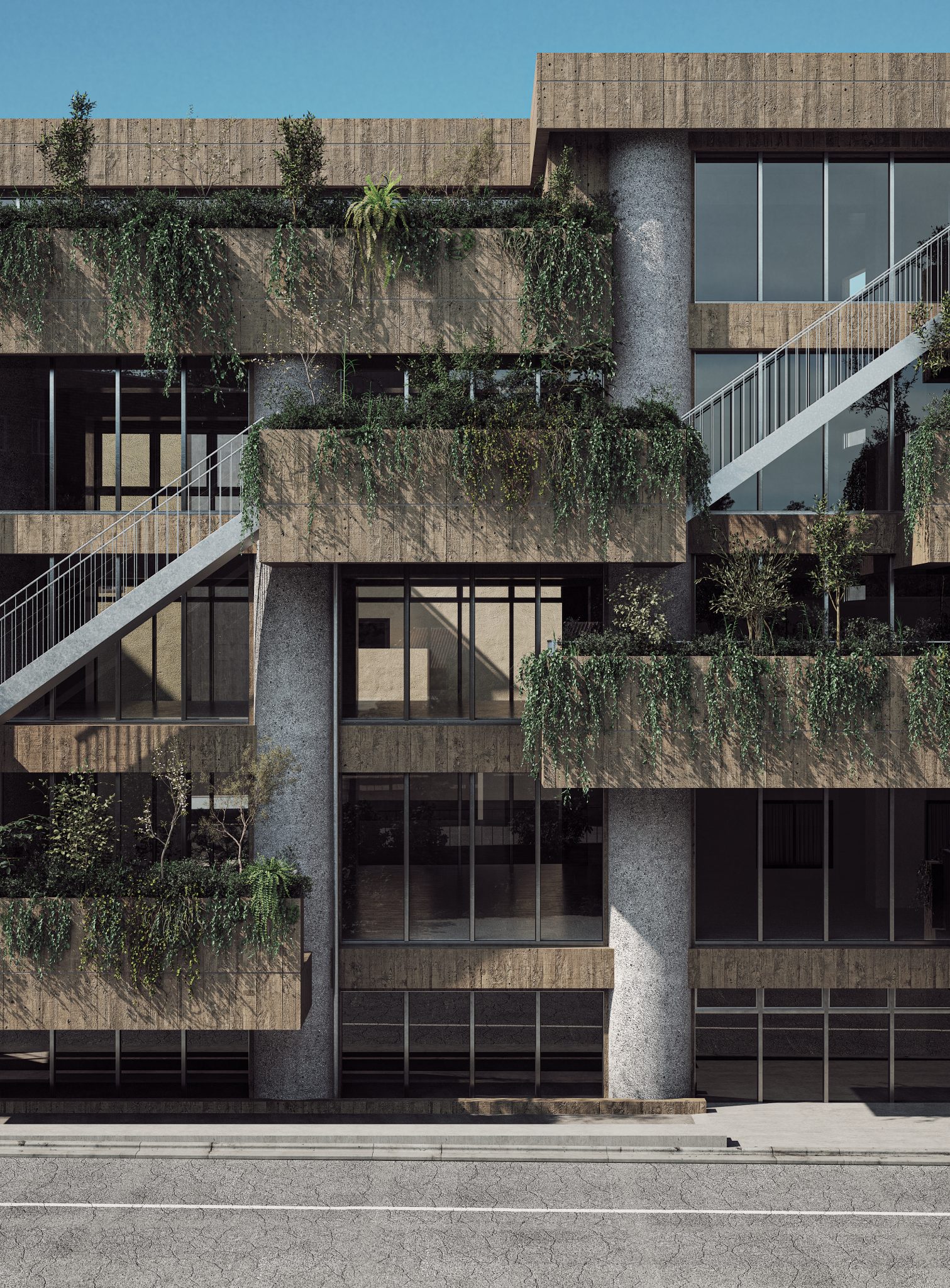 都市と自然が交わる場所で共生を目指し、相反する要素が調和する空間を創出しています。「建築」と「植物」、「内部」と「外部」が繋がりを持ち、オフィスとカフェ、室内とテラスが互いに価値を高め合う場として機能します。時間の経過とともに変化し、周囲と共鳴しながら、地域の豊かな風景と共に育まれる建築を提案します。