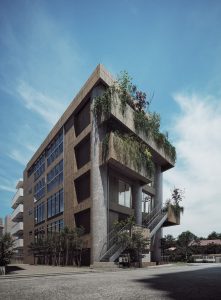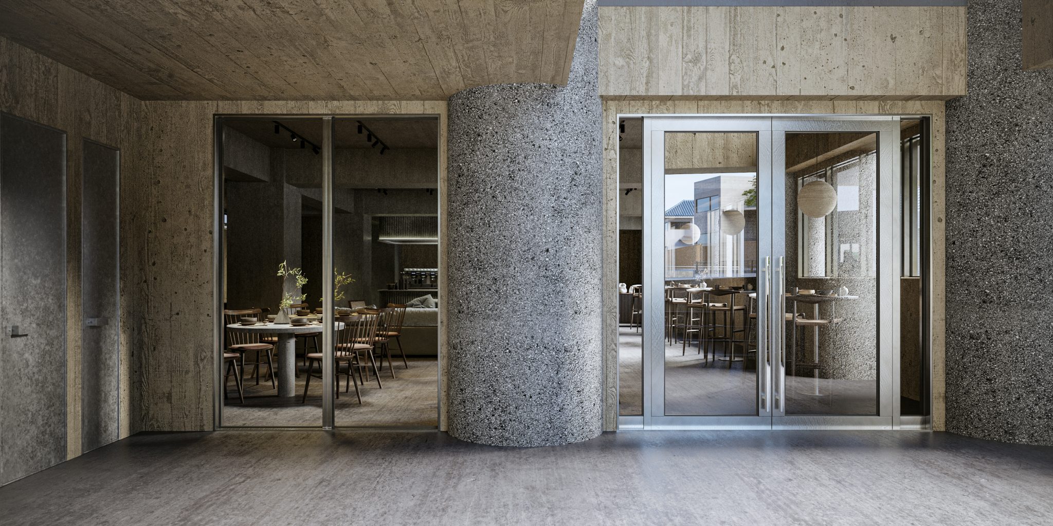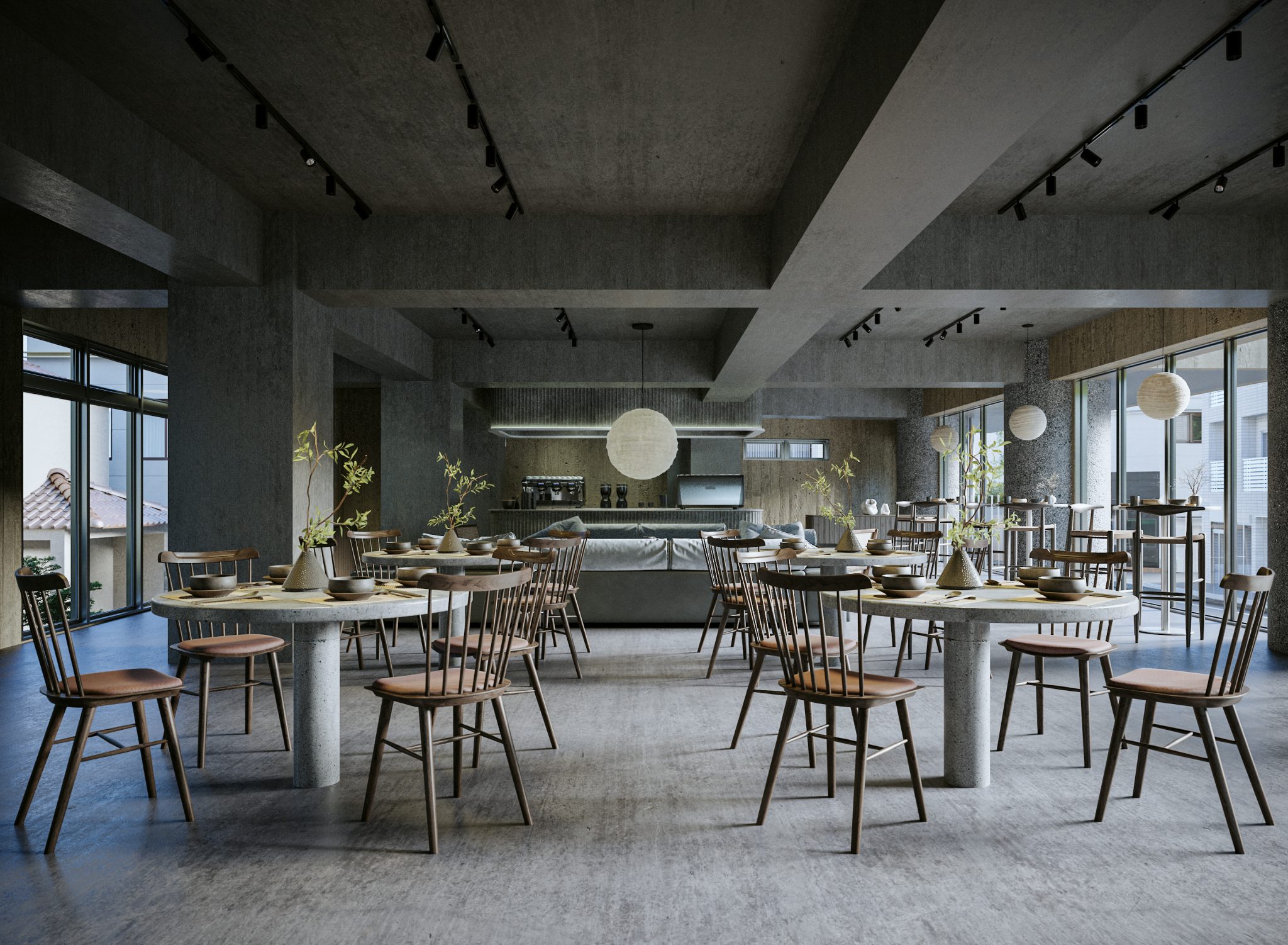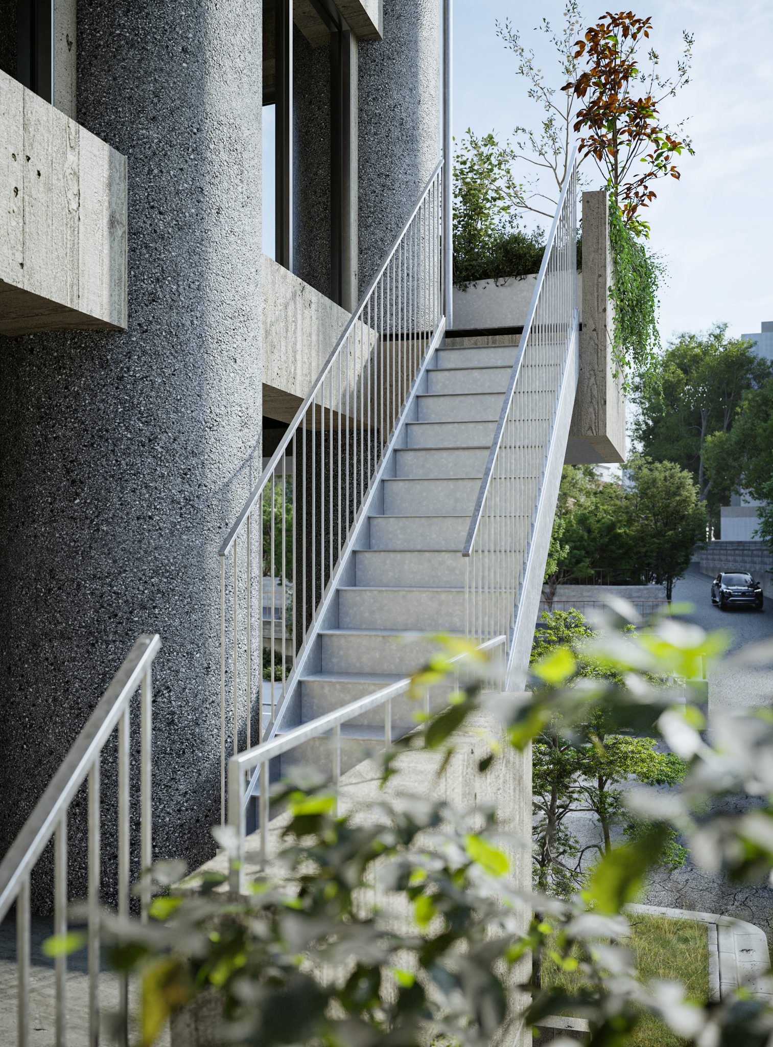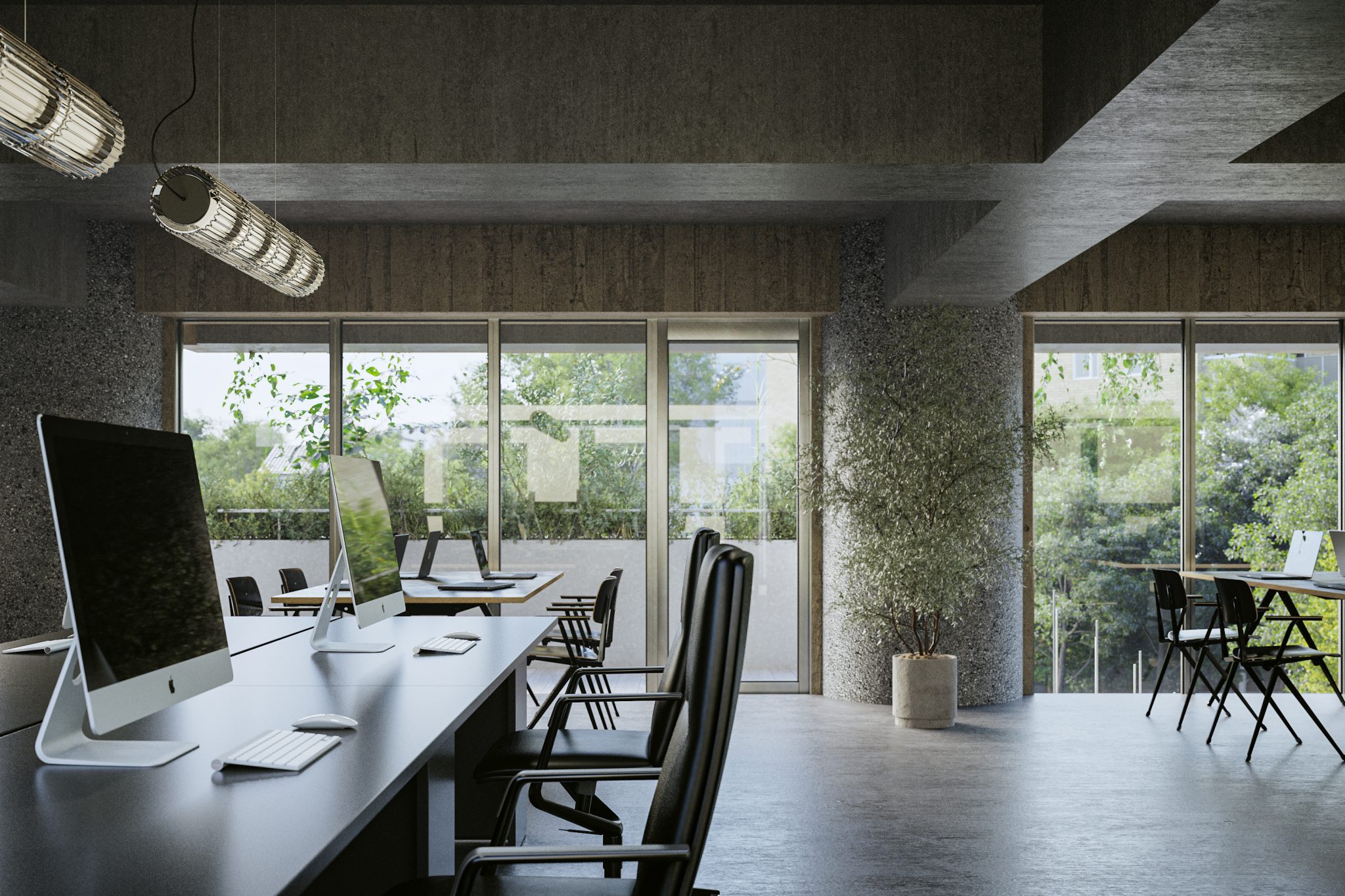 都市と自然が交わる場所で共生を目指し、相反する要素が調和する空間を創出しています。「建築」と「植物」、「内部」と「外部」が繋がりを持ち、オフィスとカフェ、室内とテラスが互いに価値を高め合う場として機能します。時間の経過とともに変化し、周囲と共鳴しながら、地域の豊かな風景と共に育まれる建築を提案します。