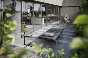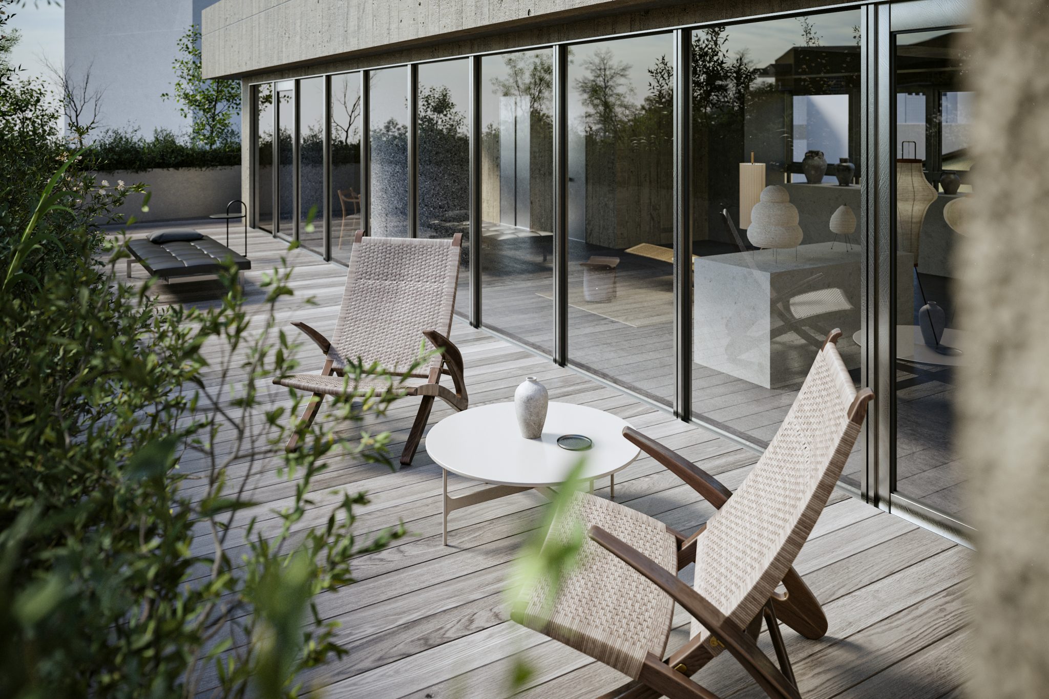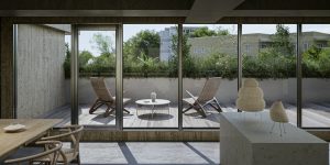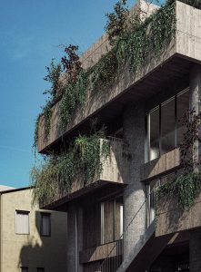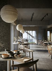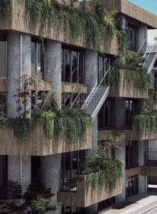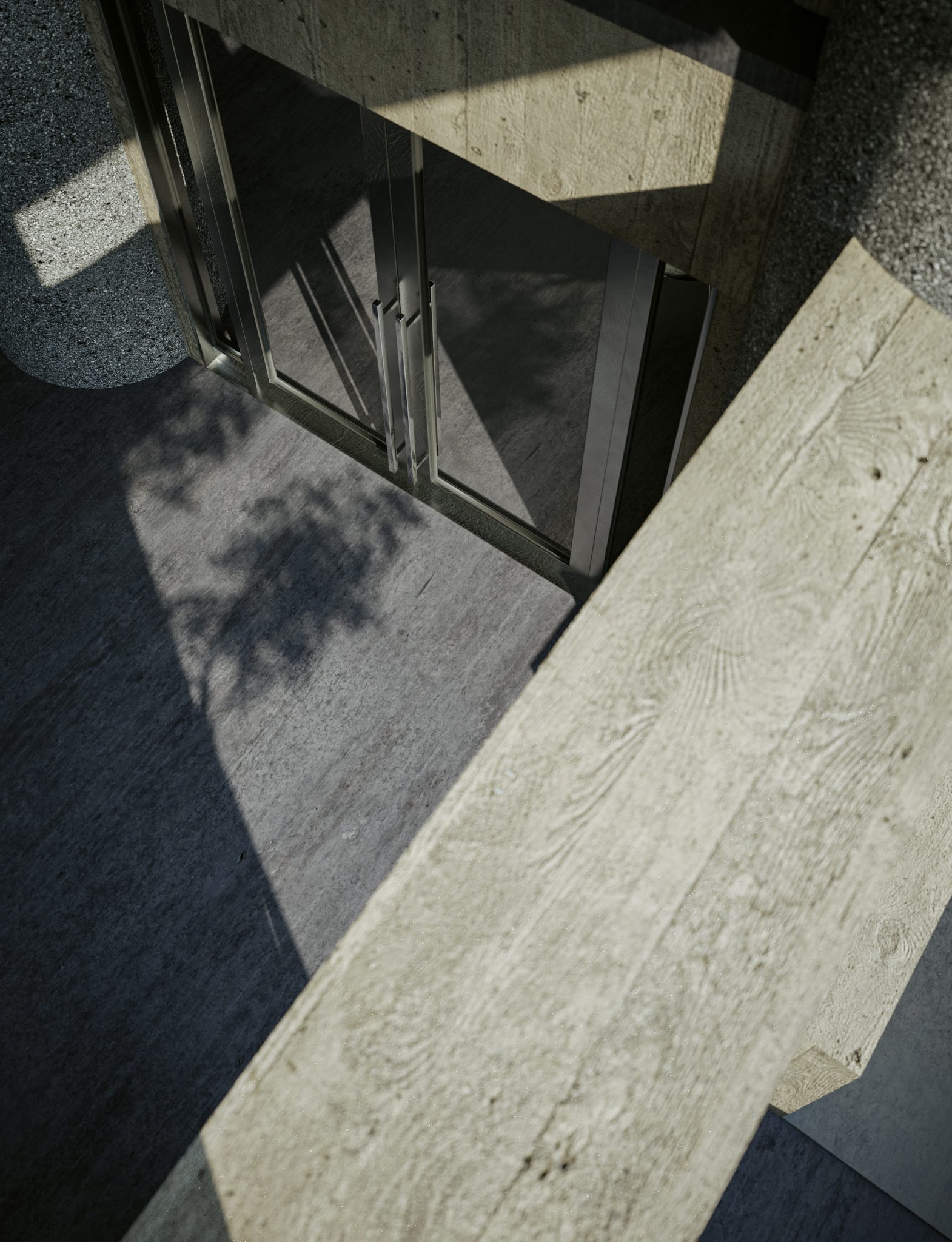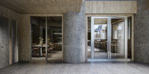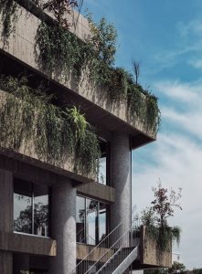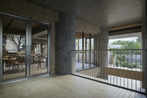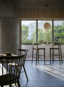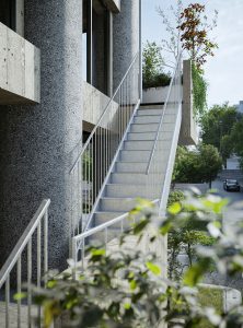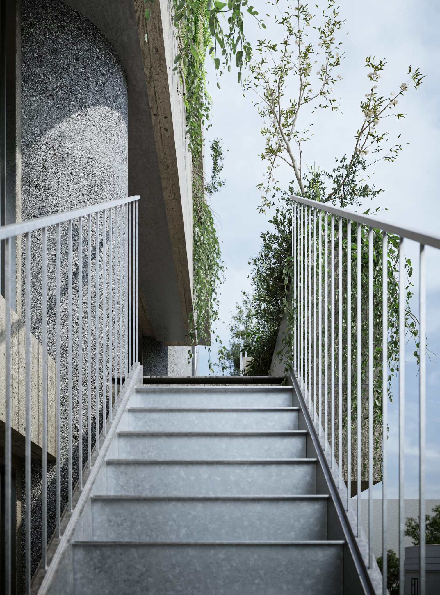 建築の素材として選ばれた植栽やリタメイト(洗い出し)は、建物と自然、外部と内部の境界を曖昧にし、自然との一体感を強調しています。これらの素材は、時間の経過とともに変化し、建物に生命を吹き込むとともに、周囲の環境とも共鳴します。