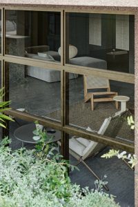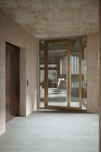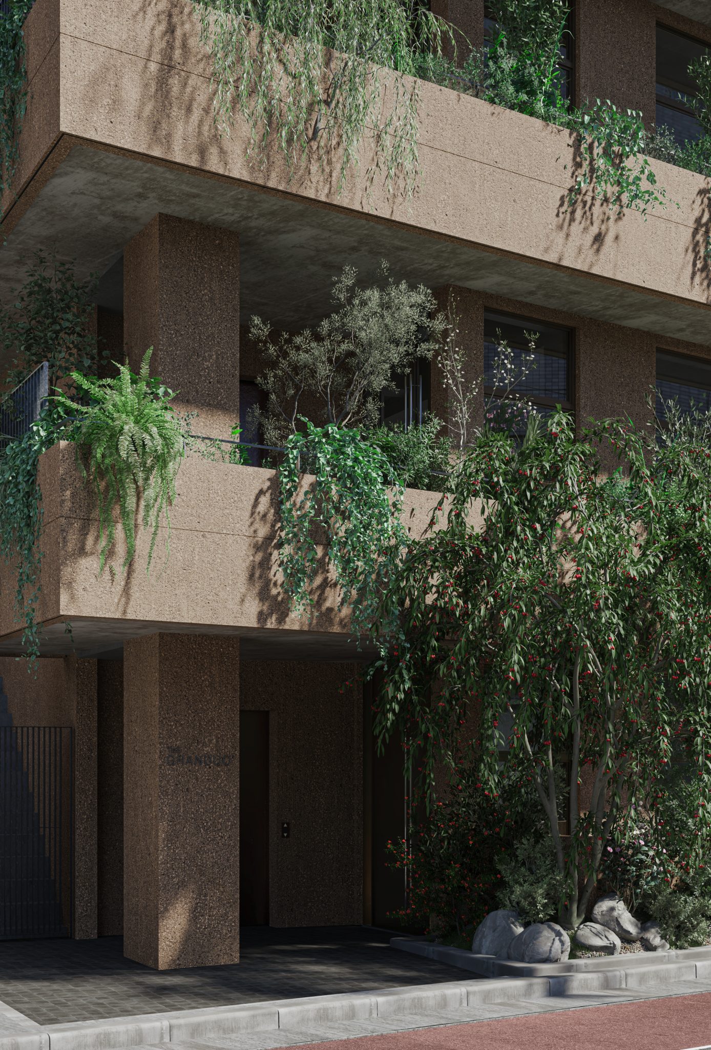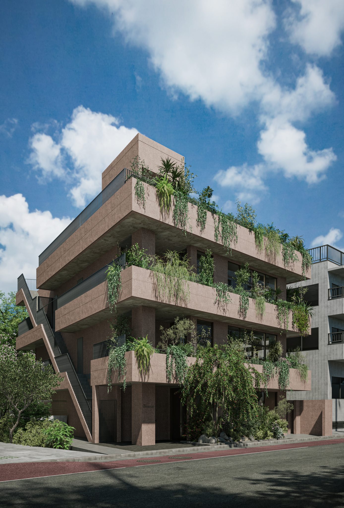 建築を作ることで、自然を街に還元していくというコンセプトに沿ったマテリアルを選定しました。コンクリートという人工物ではありながらも、しっかりとした素材感の感じられるマテリアルを使うことは、『THE GRANDUO FUTAKOTAMAGAWA SOIL』と共通しています。しかし、本敷地は川が隣接し、自然と密接に関わりあうため『THE GRANDUO FUTAKOTAMAGAWA SOIL』よりもさらに自然物に近い土のような質感を目指しました。