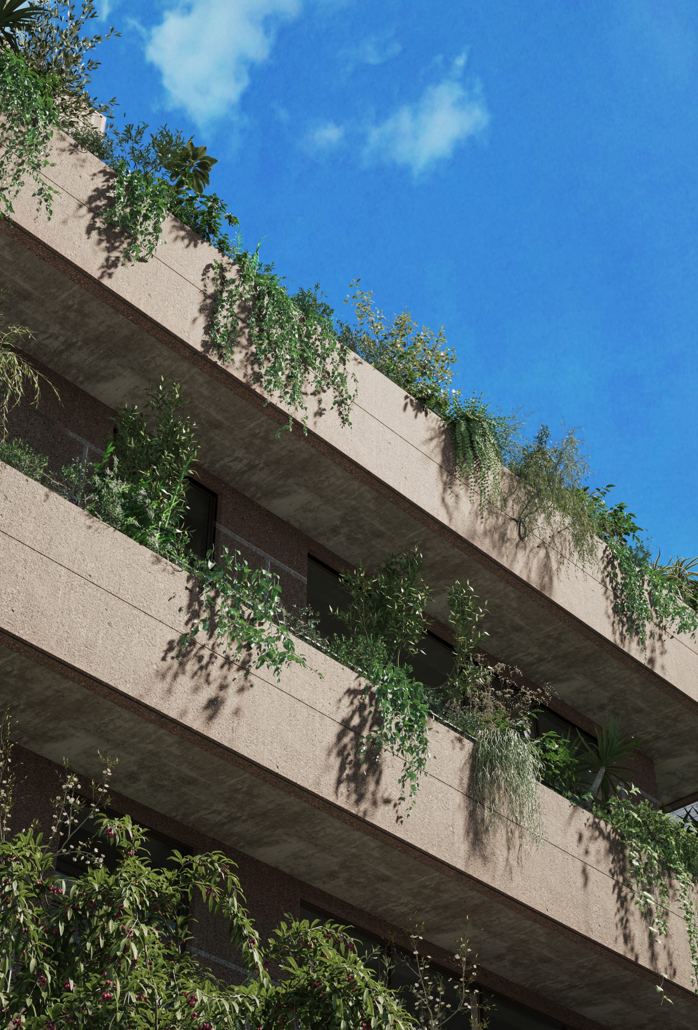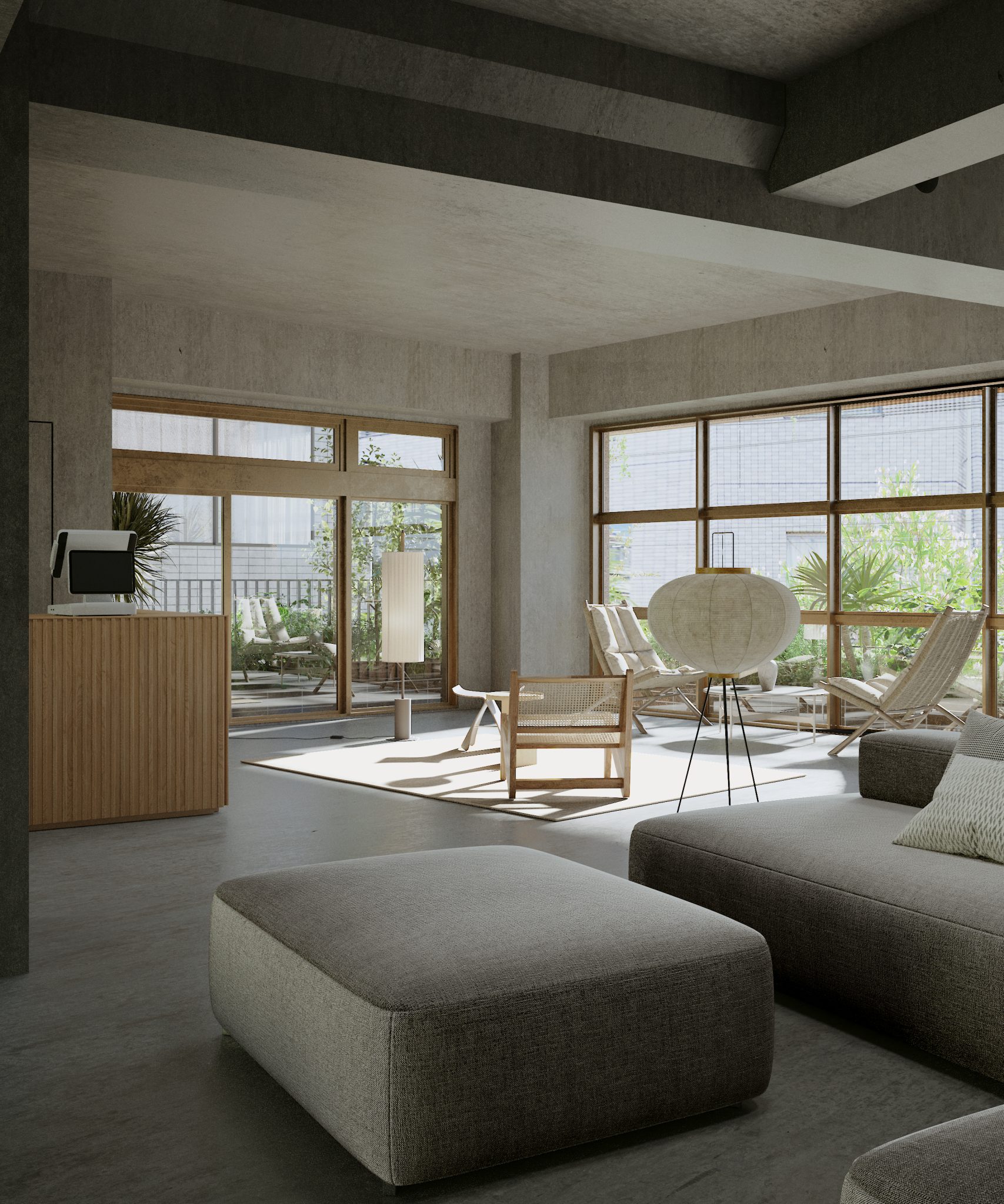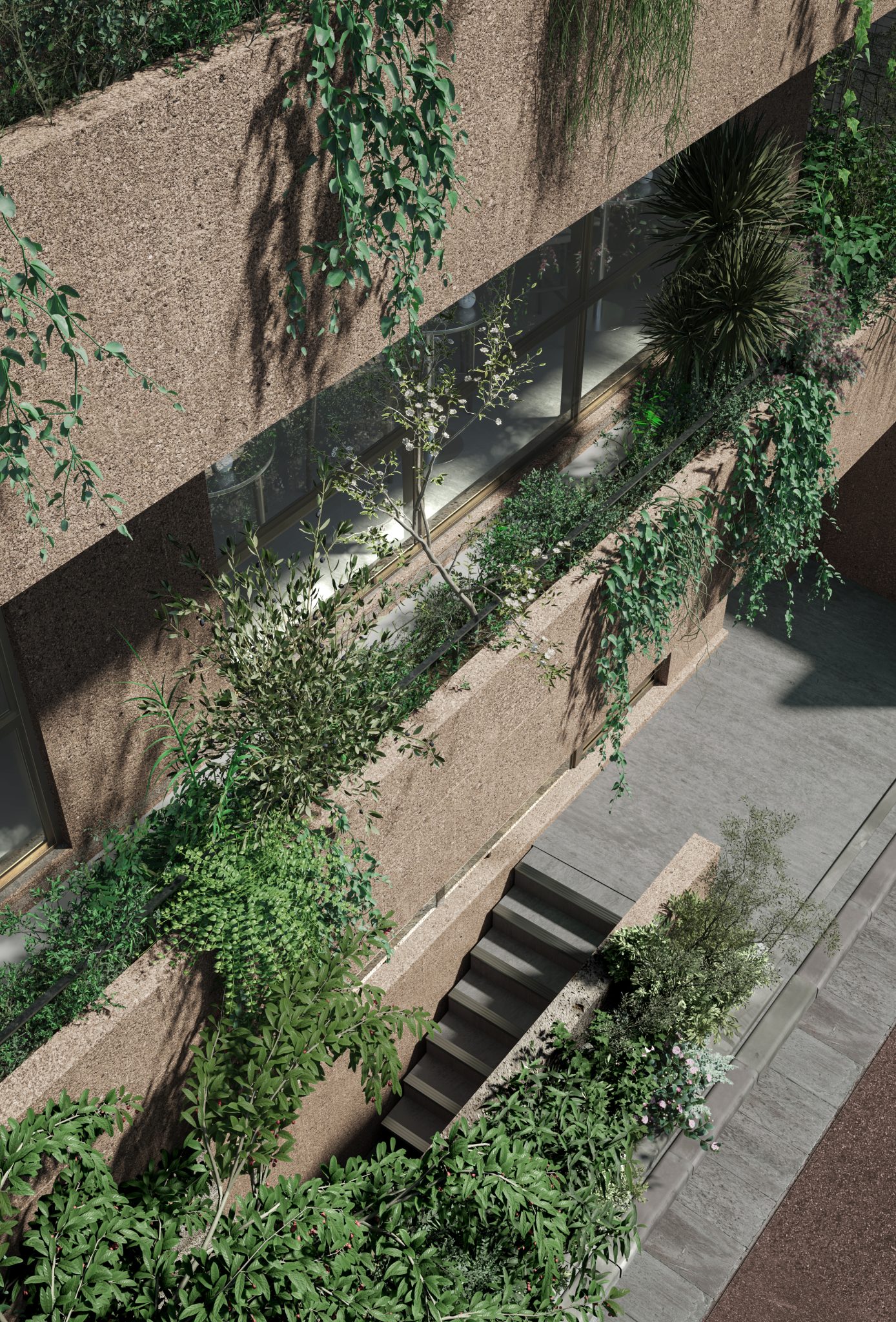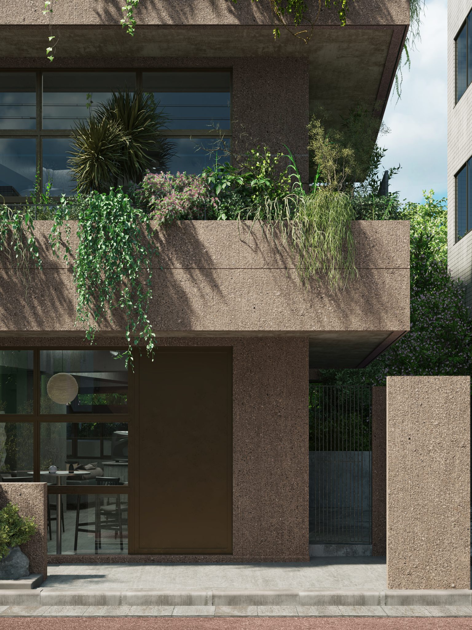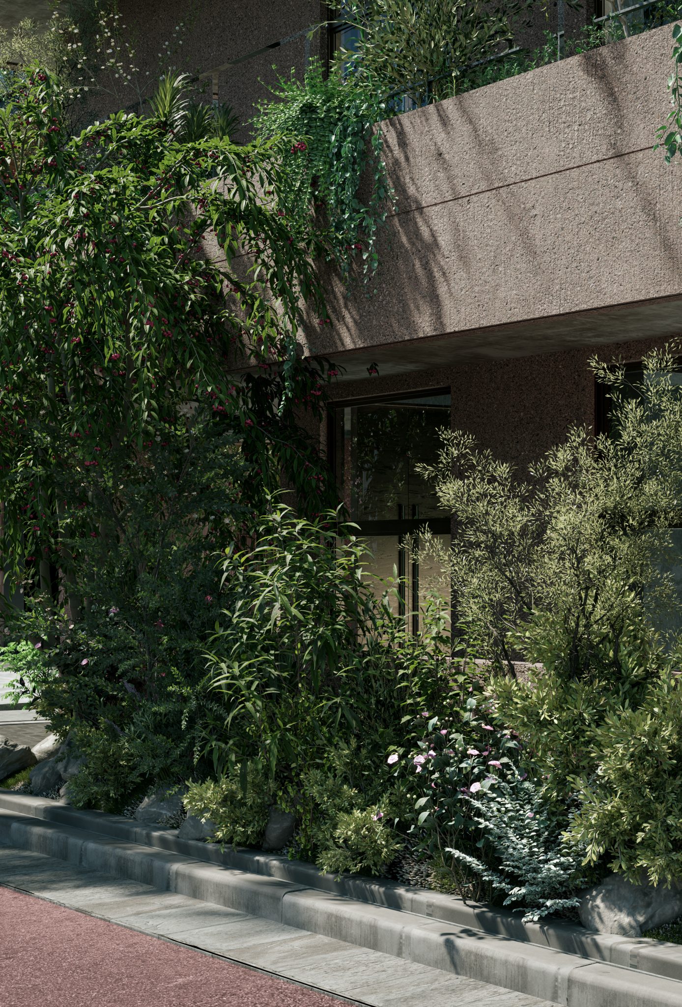 本計画は、都市の中で自然を積極的に還元し、緑豊かな環境を取り戻すことを目指しています。建築行為が都市空間に与える影響を考慮し、建物自体が自然と調和し、緑化の恩恵を街に広げるデザインを提案します。特に、街並みを変えるような緑豊かな建築を近接させることで、周囲の自然環境を尊重し、共生する空間を創出。マテリアルには、自然素材に近い質感を持つものを選定し、コンクリートでも荒いテクスチャや木目の風合いを活かして、自然を身近に感じられる建築を目指しました。