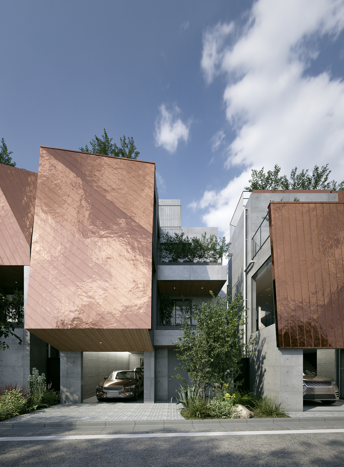 すべての建物の一部に勾配を持った銅板壁を配置しています。銅板は寺社の屋根にも昔から使われているマテリアルであり、時間とともに風合いを増していく日本的な材料です。その銅板の勾配壁と緑をランダムに敷地全体に配置することで、統一感を持ちながらも、変化のある群造形を生み出しています。銅板は時間とともに風合いを増し、緑は時間とともに成長していくことで、エージングとともにより豊かな街並みを形成しています。