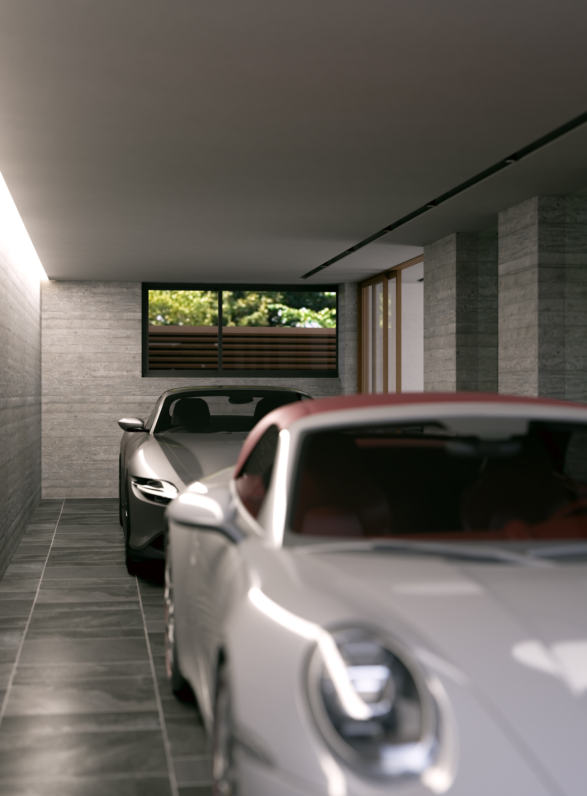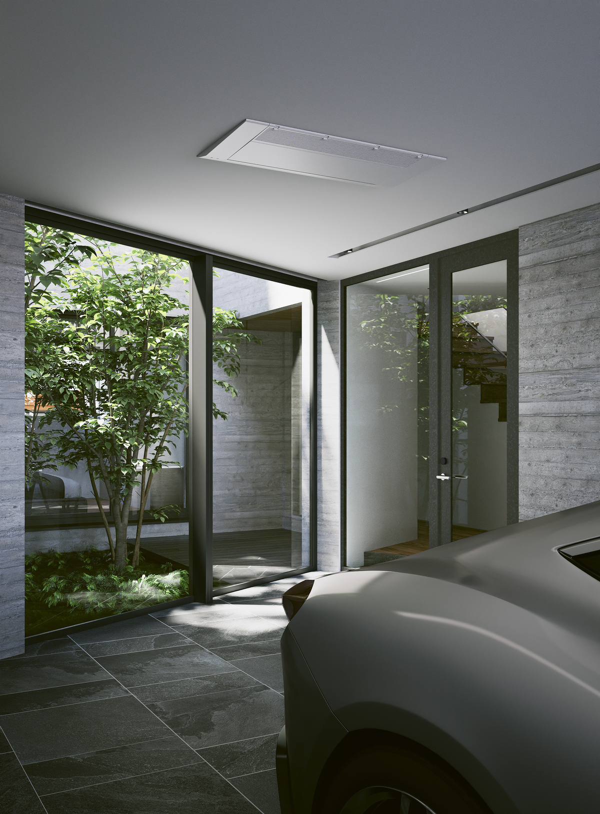 すべての建物の住戸をガレージハウス(ガレージと直結した住戸)とすることで、生活の一部として車を感じられる住戸にしています。ゲストリビングや玄関、リビングなどとガレージが連続することで、さまざまな生活のシーンの一部として車を感じ取れる空間となっています。