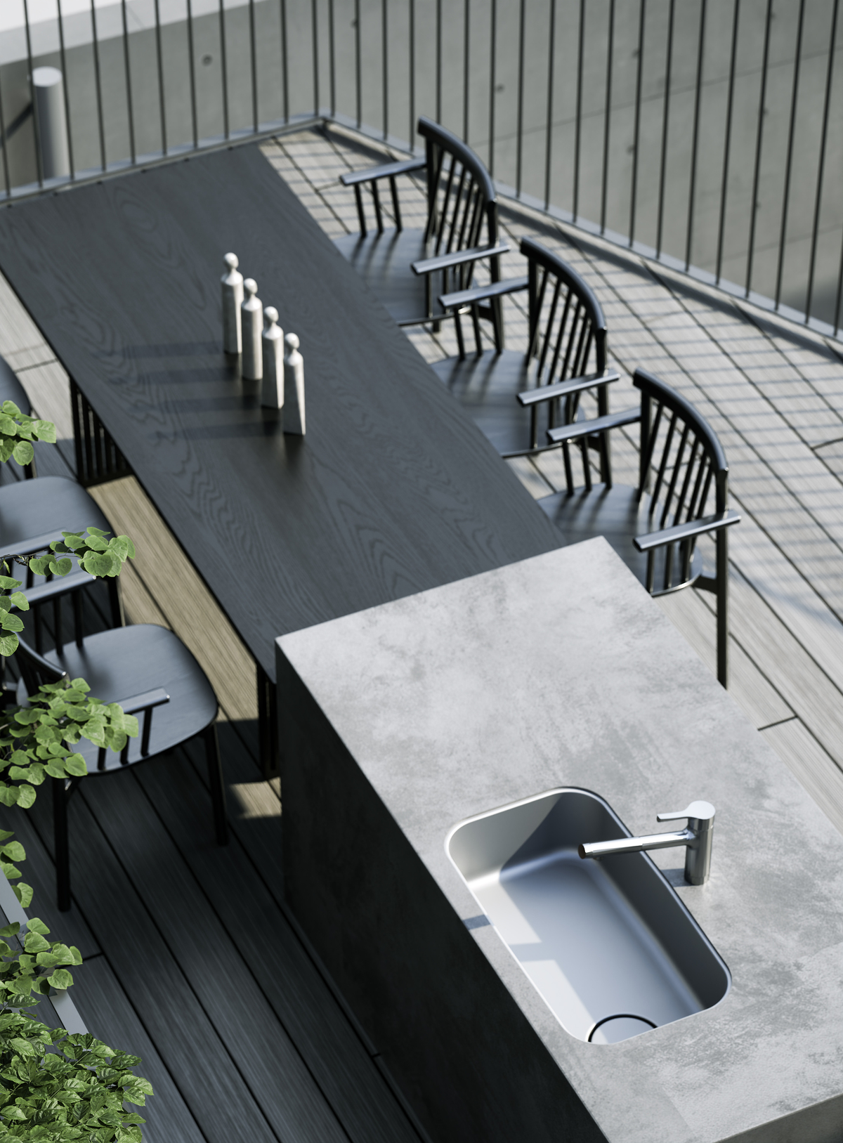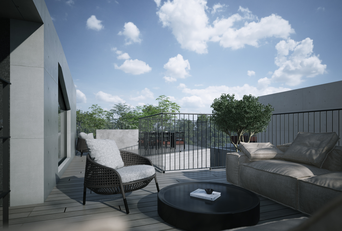 より豊かな立体的緑化街路を生み出す手法として、「点から線へ」「線から面へ」の構成を採用しています。具体的には、各敷地の緑化は「点」であり、それが街路に沿って配置されることで「線」となります。さらに、各敷地の緑化を平面的にも断面的にも雁行させ、有機的に連続させることで「立体的緑化」とし、突き当たりの羽根木公園につながることで、立体的かつ面的な緑化空間が生まれ、豊かな街路空間を創出しています。また、豊かな中間領域の創造として、テラスや屋上空間、中庭、前庭などを積極的に緑化しています。屋上にはアウトドアキッチンを配置することで、屋上からの豊かな眺望と外部空間を積極的に利用できる建物としています。