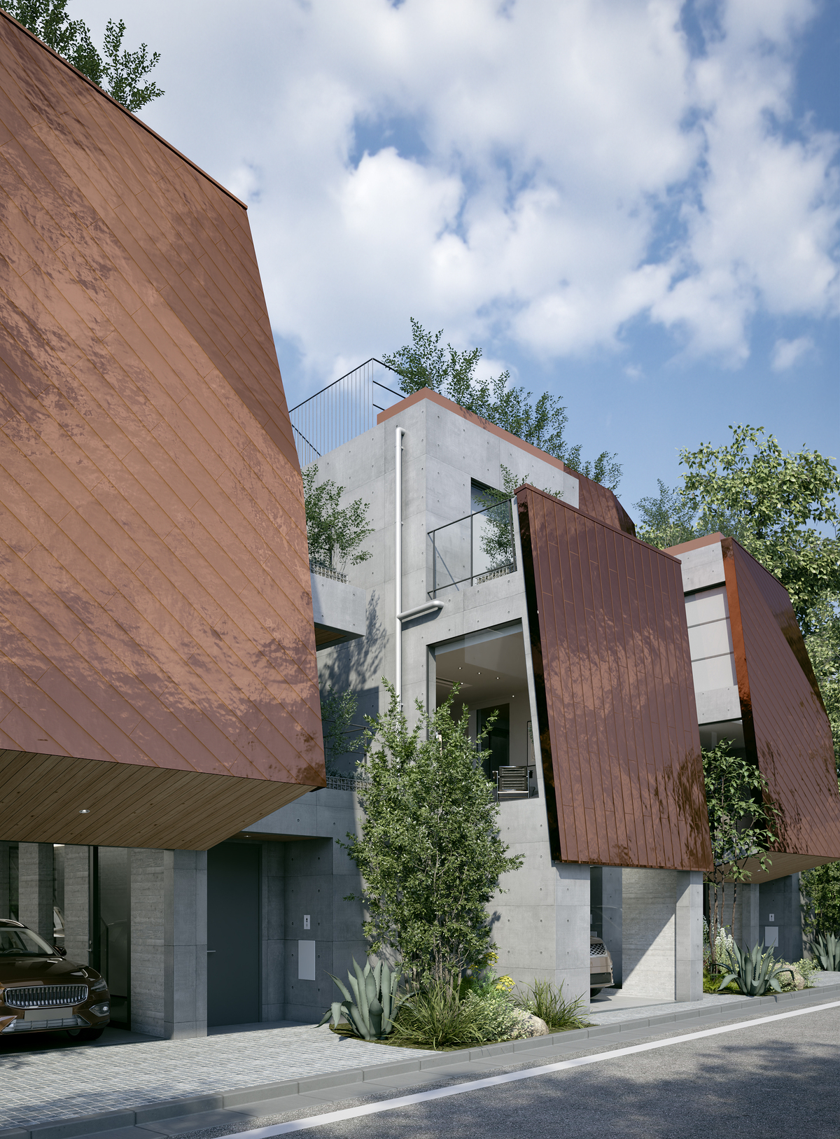 銅板と緑化によって生まれる豊かな群造形