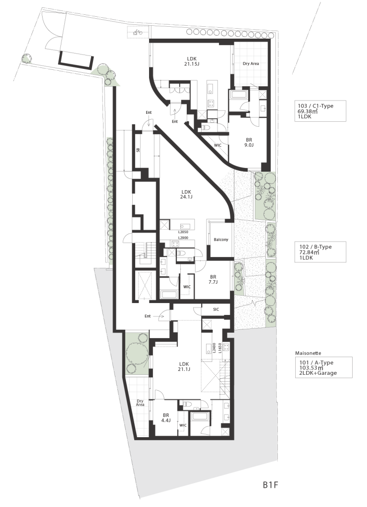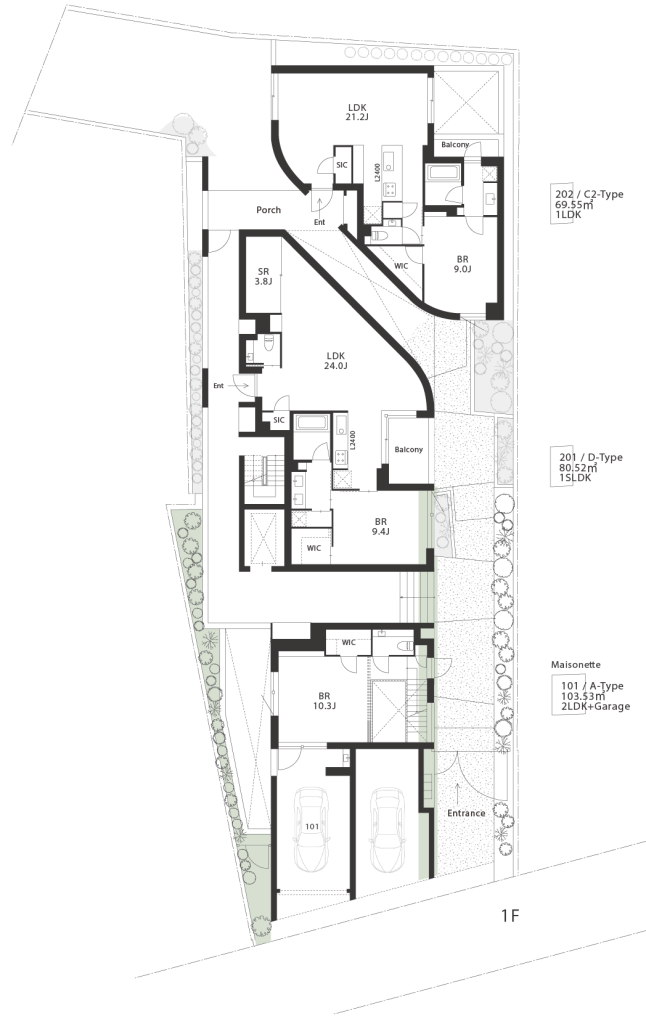 南側と西側に接する恵まれた敷地条件を活かし、歩行者が自由に通り抜けられるパスウェイを設けました。この開放的な空間が新たな動線を生み出し、周辺の散歩コースにさらなる楽しみの幅を広げます。