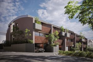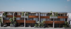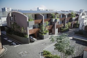 今回は、住宅地という商業地に比べて高さ方向の法律的制限(一種高度・日影規制)が厳しく、垂直方向の自由度が少ない中で、スキップフロアとヴォールト天井を駆使し、伸びやかな吹き抜けと内外が一体となる曲面天井の最上階を構想しました。これを縦割りのテラスハウス形式で展開することで、全住戸に最上階の特別感を持たせ、すべてが「ペントハウス」となる住空間を創出しました。