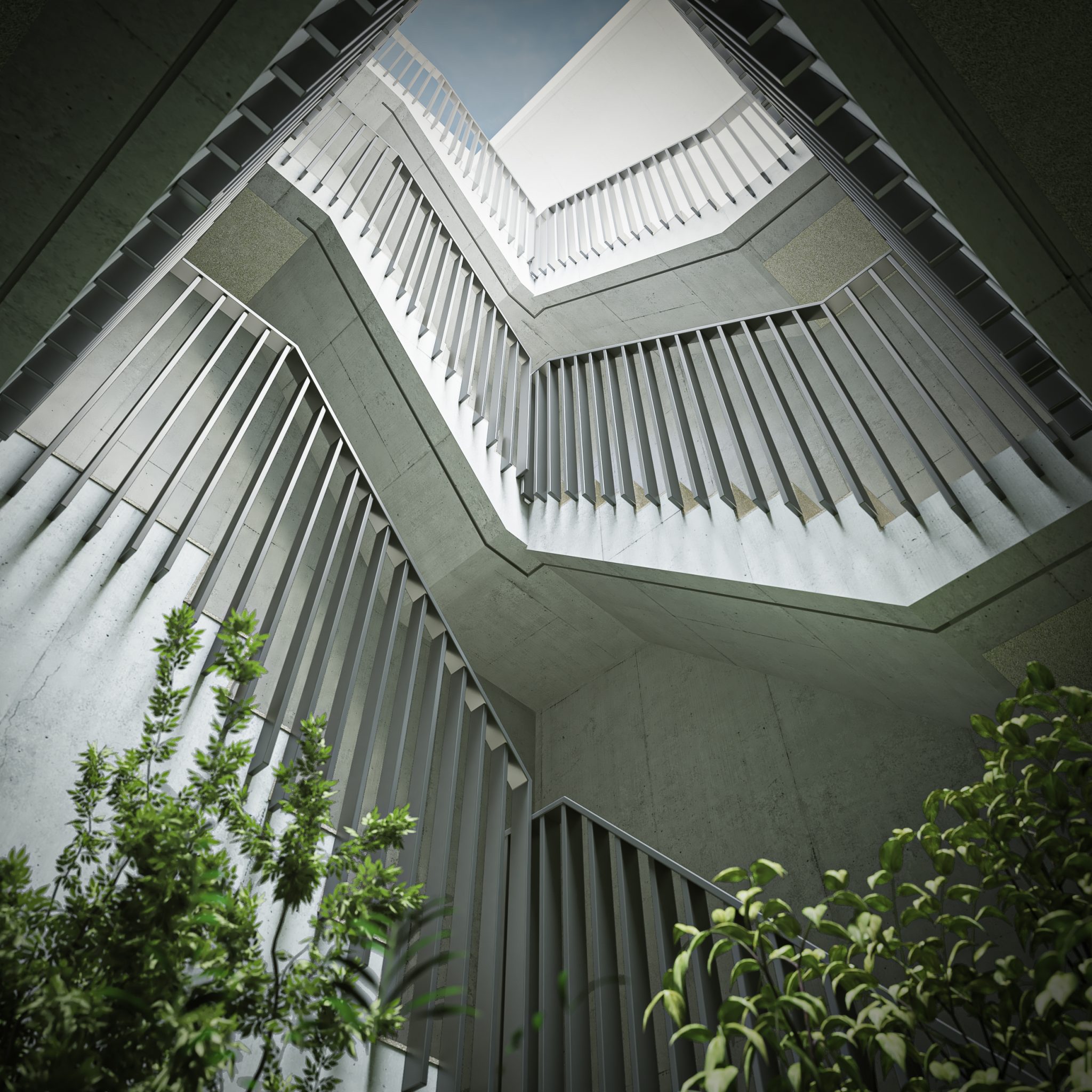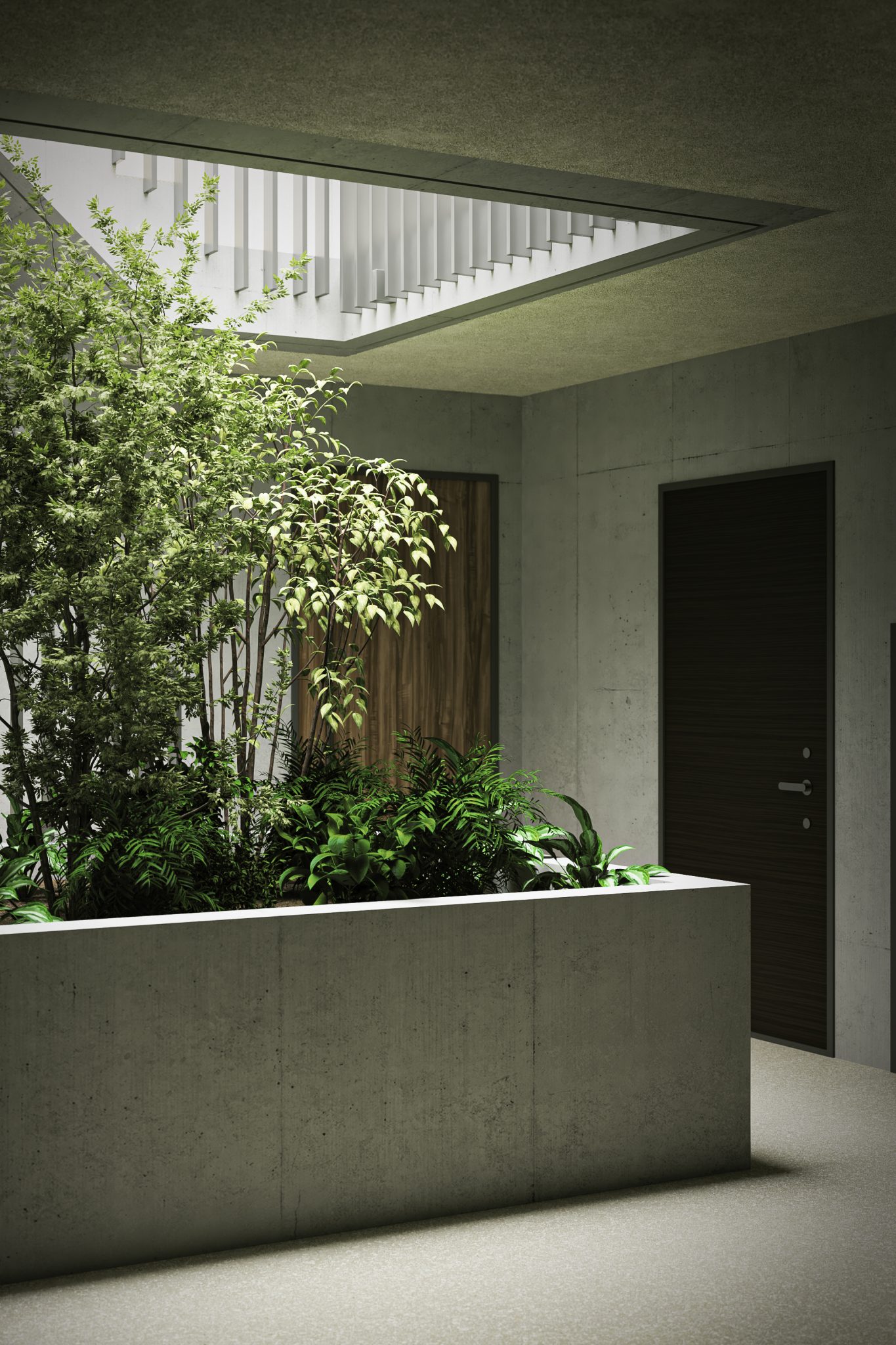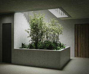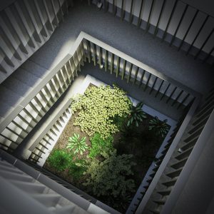 共用部の吹抜けには大きな花壇をイメージした中庭を設けました。この中庭には、光や雨が差し込み、植物の生き生きとした様子を感じられるとともに、夜はライトアップによって幻想的な空間を演出することで、入居者の日常に癒しを提供します。