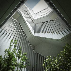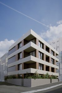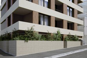 淡島通りは、古くから人の往来が多くある道で、現在でも人や車の往来が目立ちます。そんな淡島通りの人々の流れに合わせ、積層ボリュームを計画することで、建物の横ラインを強調しました。そうすることで、淡島通りと調和のとれた建築とします。