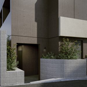 建蔽率100%の敷地であるため、まず初めに敷地いっぱいのボリュームを検討しました。その後、法的・外的要因により形状を調整しながら、特に淡島通りからの視線を意識した計画を行いました。建物のファサードと外構フェンスの一体感を創出するため、フェンスを建物本体に組み込み、その上層にデザイン性の高いパネルを設置しています。これにより、外構フェンスと一体となった統一感のあるファサードを形成し、淡島通りに対してしっかりと顔を向けた印象的な外観を形成しています。