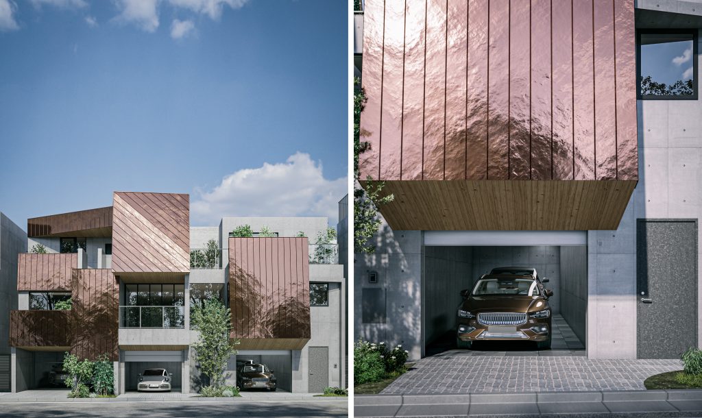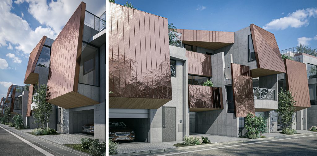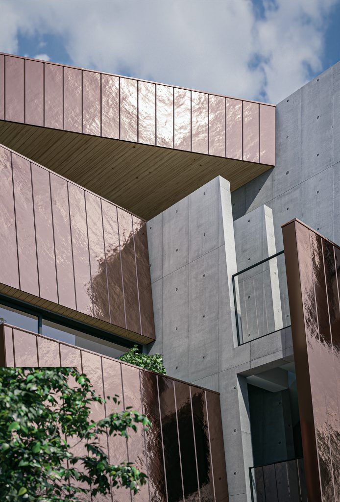 すべての建物の一部に勾配を持った銅板壁を配置しています。銅板は寺社の屋根にも昔から使われている仕上げであり、時間とともに風合いを増していく日本的な材料です。その銅板の勾配壁と緑を無作為に敷地全体へ配置することで、統一感を持ちながらも、変化のある群造形を生み出しています。銅板は時間とともに風合いを増し、緑は時間とともに成長していくことで、より豊かな街並みを形成していきます。