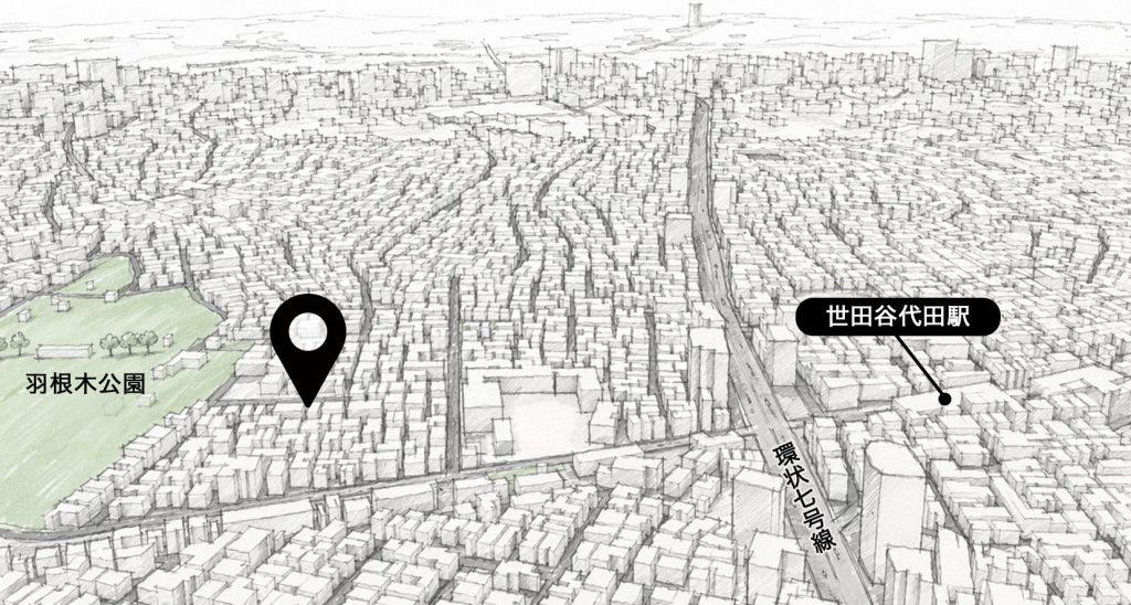 敷地は羽根木公園の東側に位置し、世田谷代田駅まで徒歩約6分、環状七号線からは約200m離れた閑静な住宅街の中にあります。敷地の特徴として、戸建てや集合住宅の7つの敷地を合わせて約90mの長さがあり、西側の突き当たりには羽根木公園の大きな緑地がつながっています。開発敷地全体を考慮すると、建築単体の開発ではなく、長さ90mの新しい街並みを開発していることになります。良好な新しい街並みを作り出すことが、この計画の主要な命題と言えます。