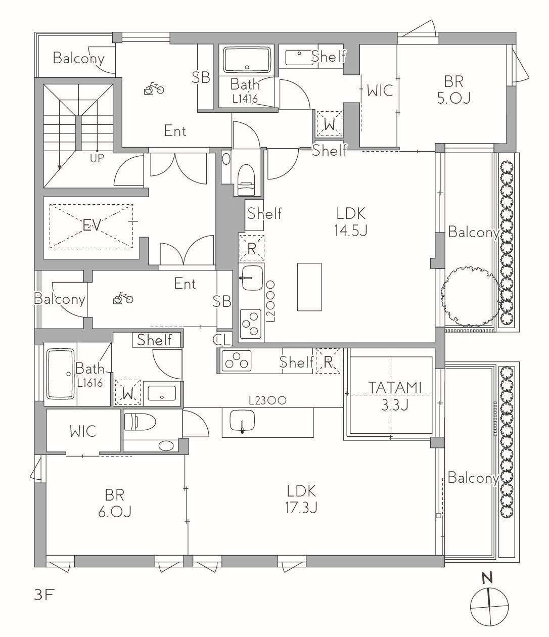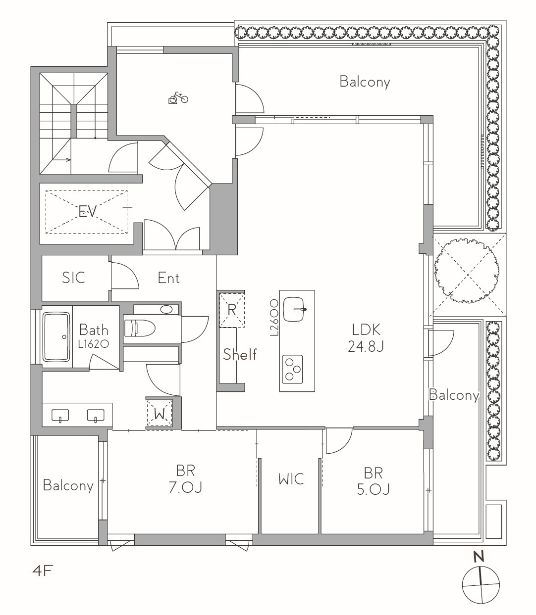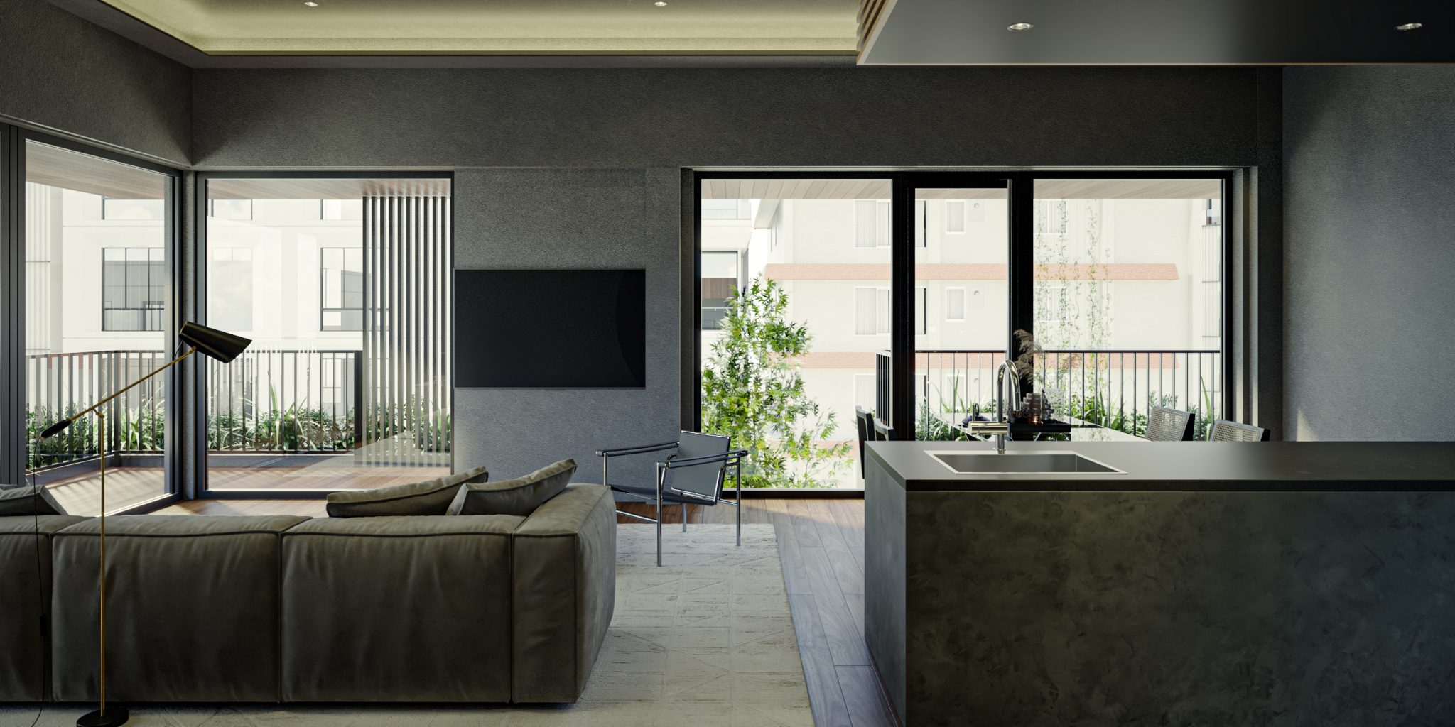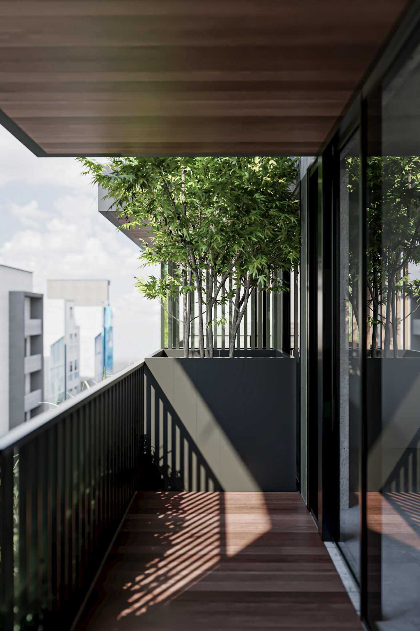 バルコニーに設けた植栽スクリーンやルーバー、シンボルツリーは、都市の喧騒や視線を和らげ、居住空間との間に多層的な距離感を生み出します。
