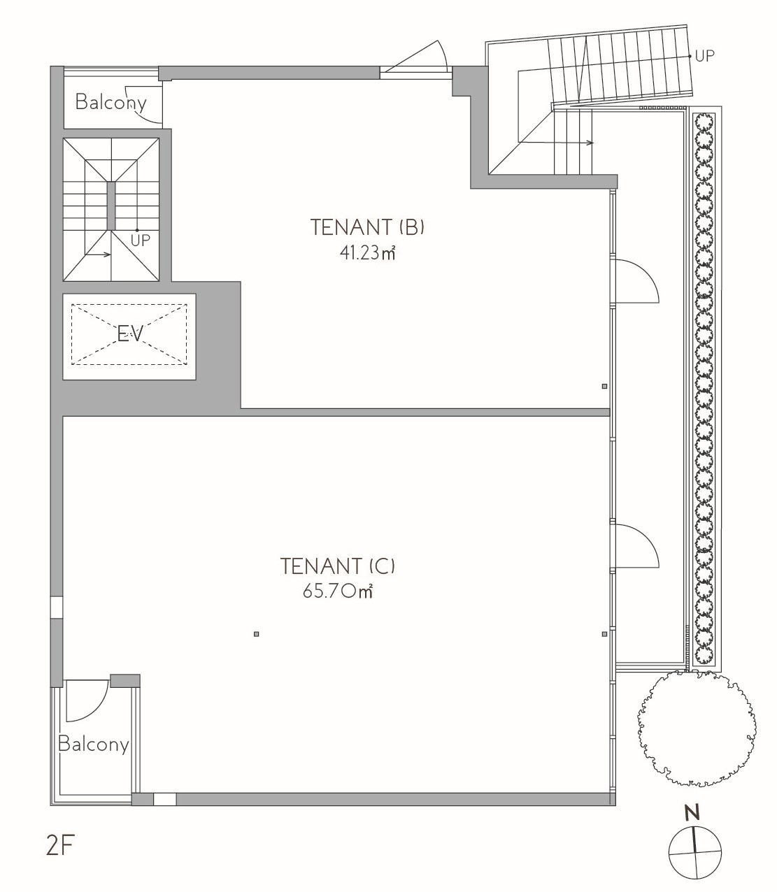 賑やかな街並みに馴染むよう、整然とした佇まいではなく、軽やかでリズムのあるファサードを目指しました。スラブと低木による水平ラインをずらすことで動きを生み出し、バルコニー先端にはルーバー、植栽スクリーン、シンボルツリーを配置。シンボルツリーは遠景からのアイストップとなり、植栽スクリーンは潤いを、木板張りの軒裏は温かみを添えています。
