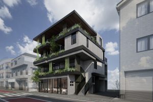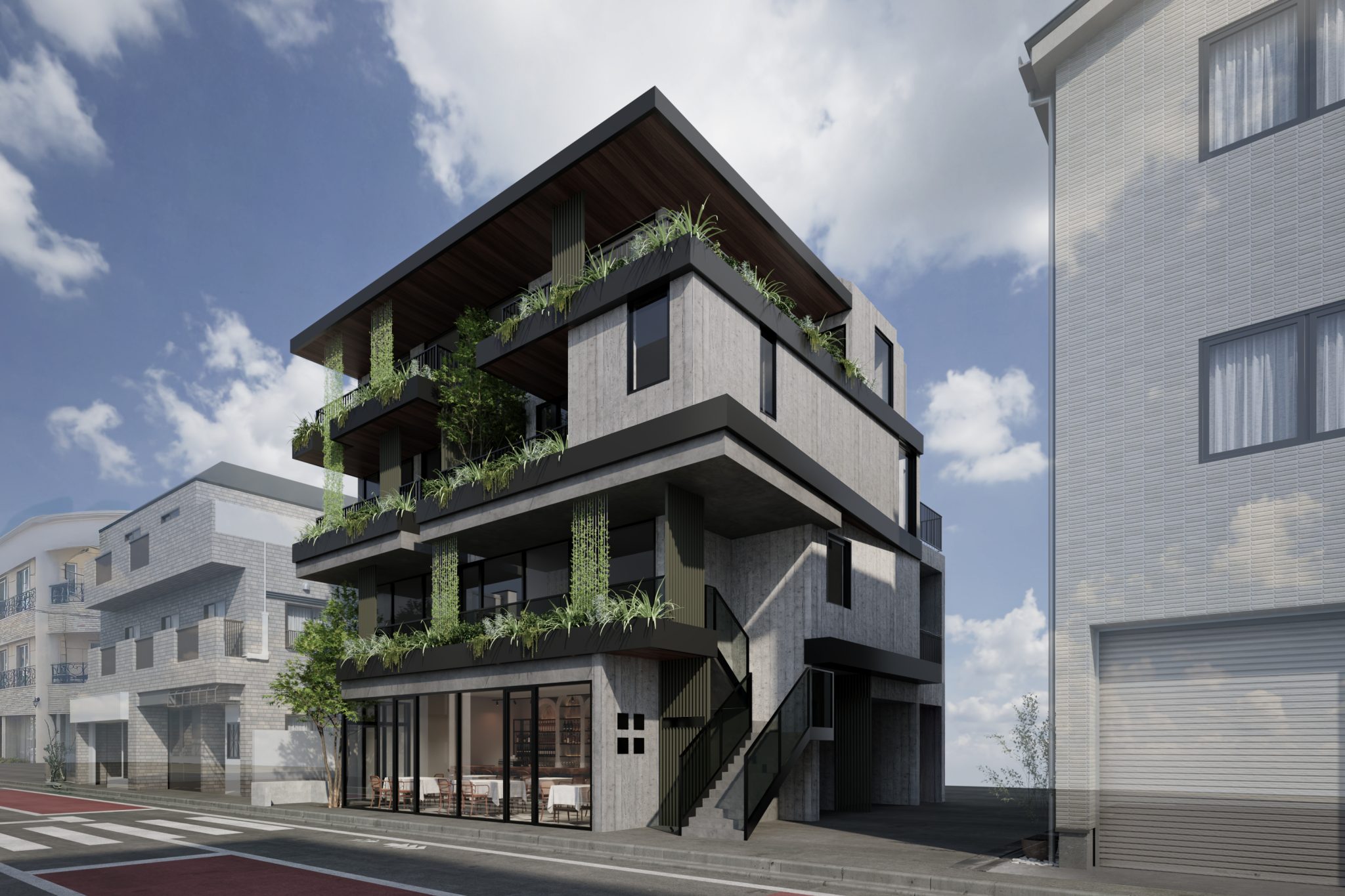 本計画は、学芸大学駅から徒歩3分、店舗と住居が混在する人通りの多い賑やかなエリアに位置します。街に活気をもたらしながらも、落ち着いた住環境が得られる都市型の商住複合建築です。バルコニーには緑やルーバーによるスクリーンを施し、街と生活との適度な距離感を保つバッファーゾーンとして機能させています。また、アスファルトが広がる雑多な都市空間において、建築に取り込まれた緑は人を惹きつけるランドマークとなり、街に対する建築からのギフトとも言える存在になります。建築と街が互いの魅力を引き出し、共に豊かさを享受し合う、そんな関係性の実現を目指して計画を進めました。