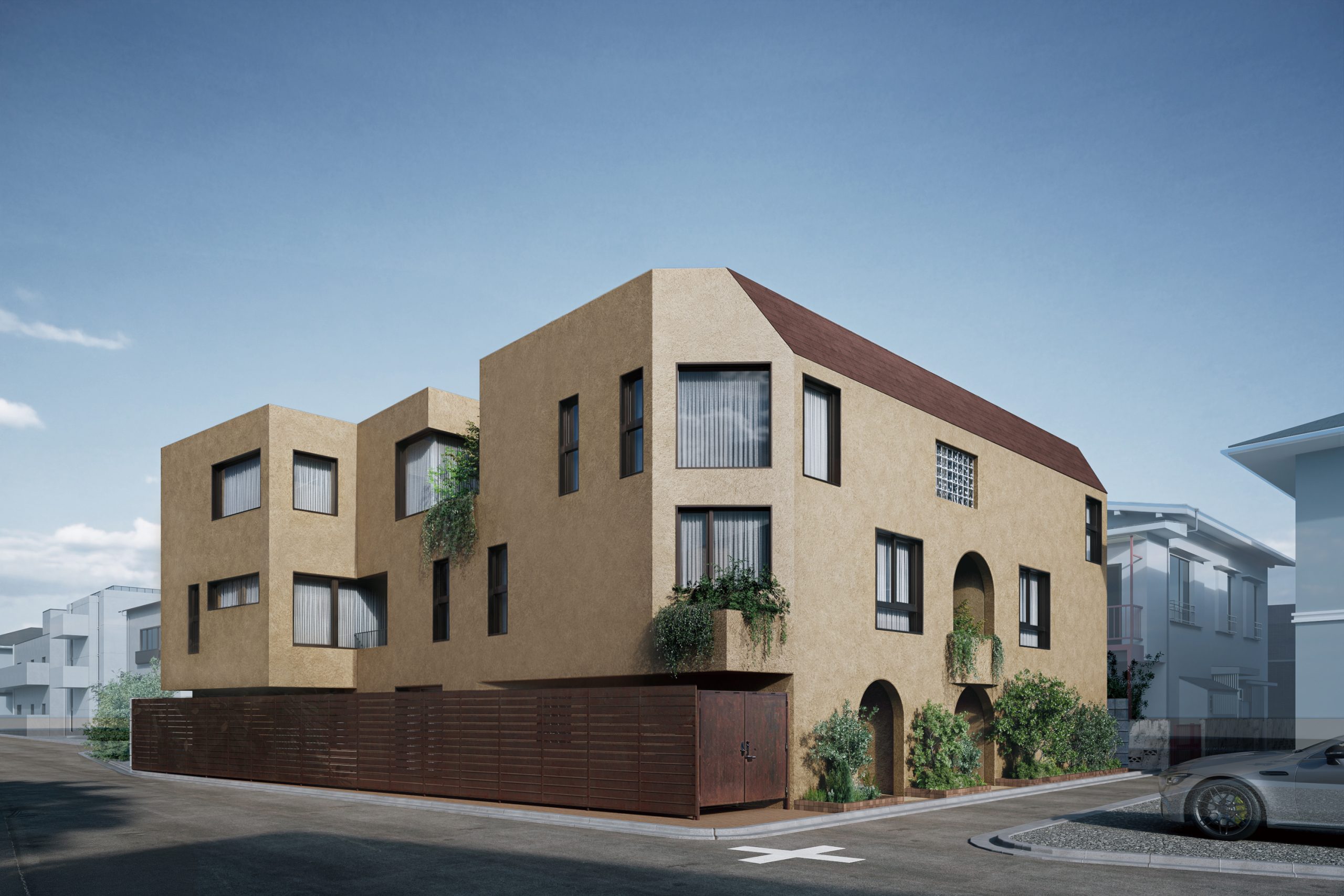 異なる素材の表情が重なり合うことで、街並みに溶け込みながらも、ひときわ目を引く存在感を放ちます。