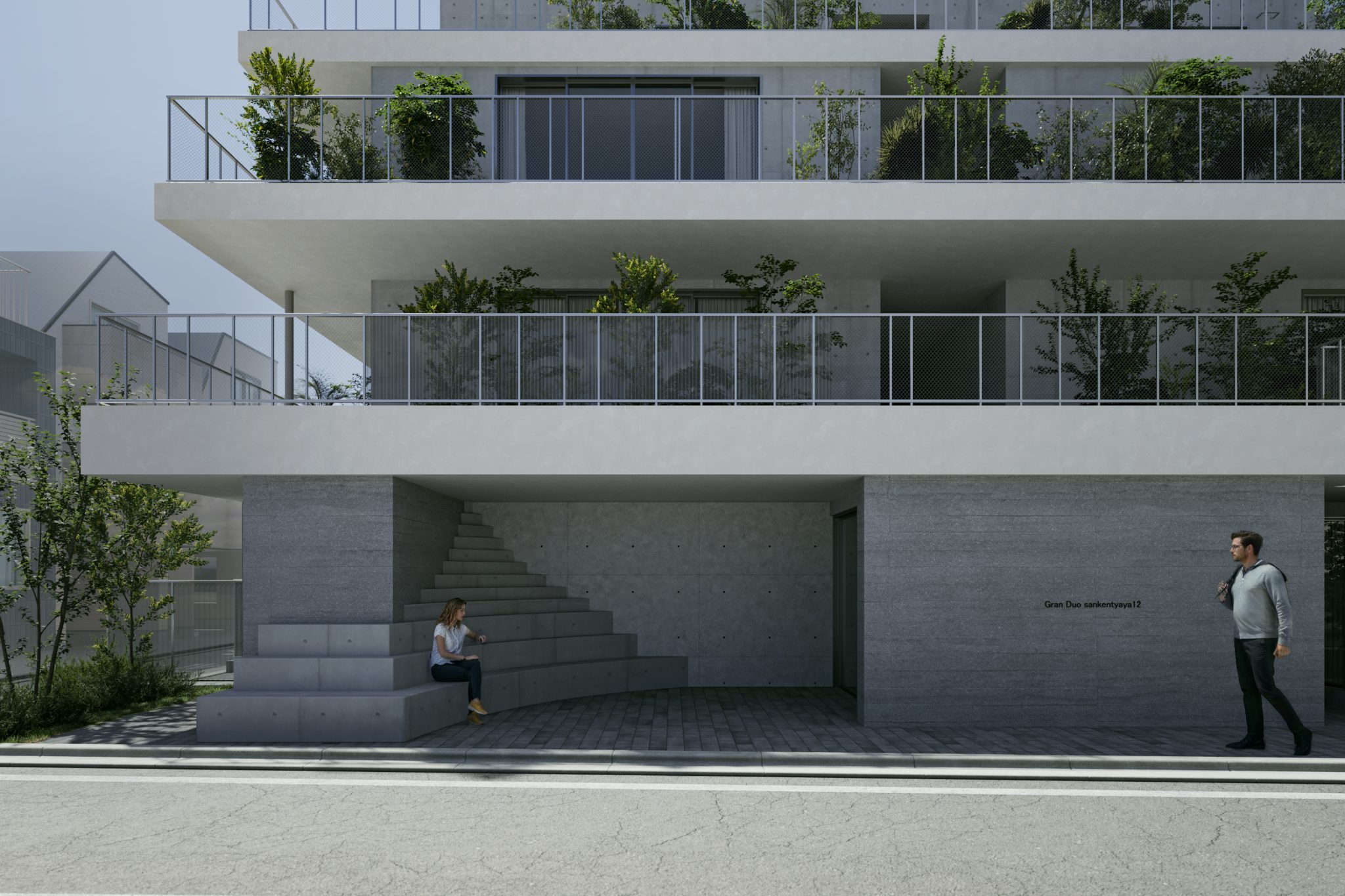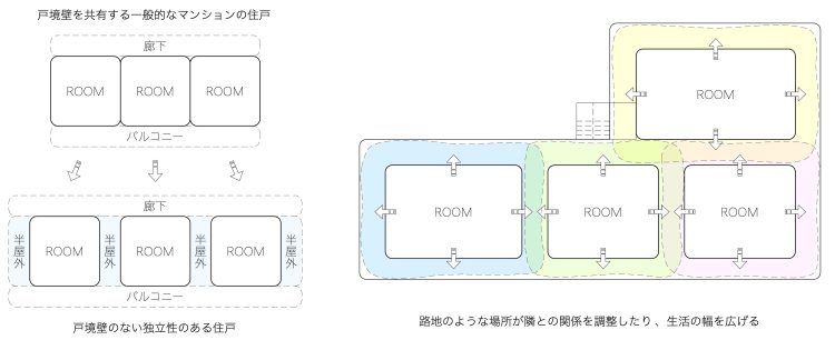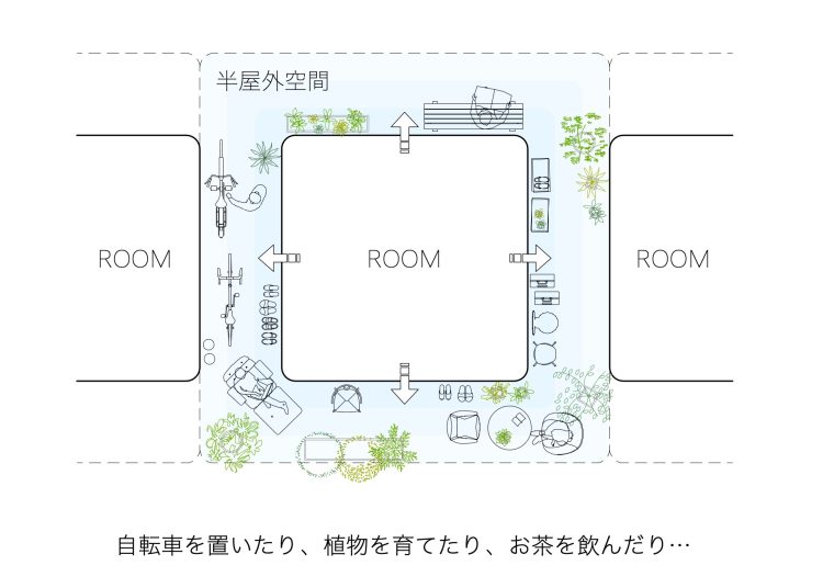 住戸を囲う中間領域=半屋外空間が、暮らしの幅を広げていく住まいの提案です。グラデーショナルに自分たちの領域が広がる空間をつくり、半屋外空間へ生活が拡張していきます。