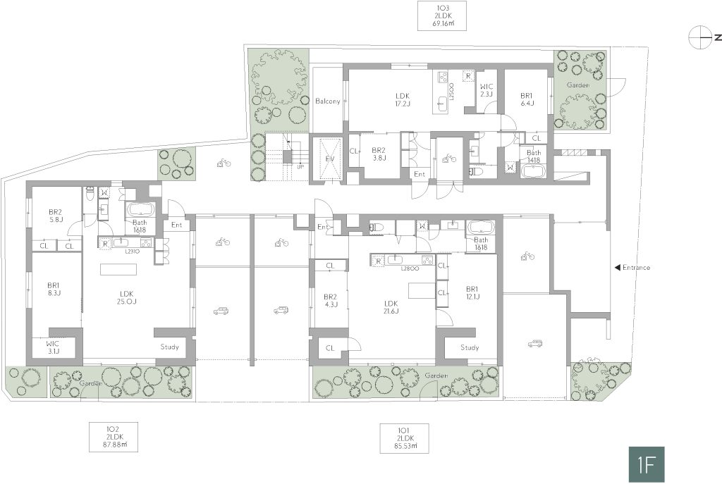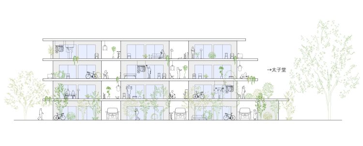 濡縁のような半屋外空間=中間領域が家の周りをぐるりと囲む住まいの提案です。中間領域に自分たちの暮らしが自然に広がり、生活が外の空間へと拡張していきます。それぞれの住戸は戸建住宅のように独立性を持ちながら、中間領域を介して暮らしの幅を広げ、緩やかにつながっていきます。駐輪スペースや家庭菜園、園芸、趣味など多様な使い方が可能で、住戸ごとの個性がにじみ出すことで、親密で豊かな街並みを形成します。