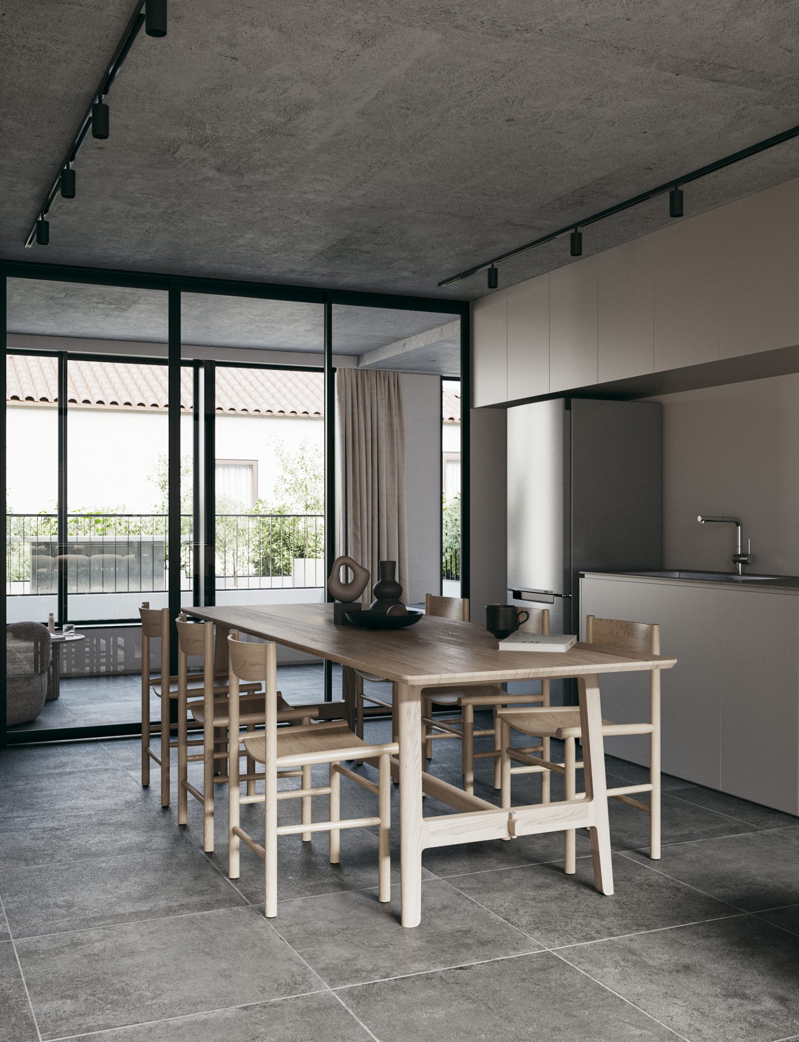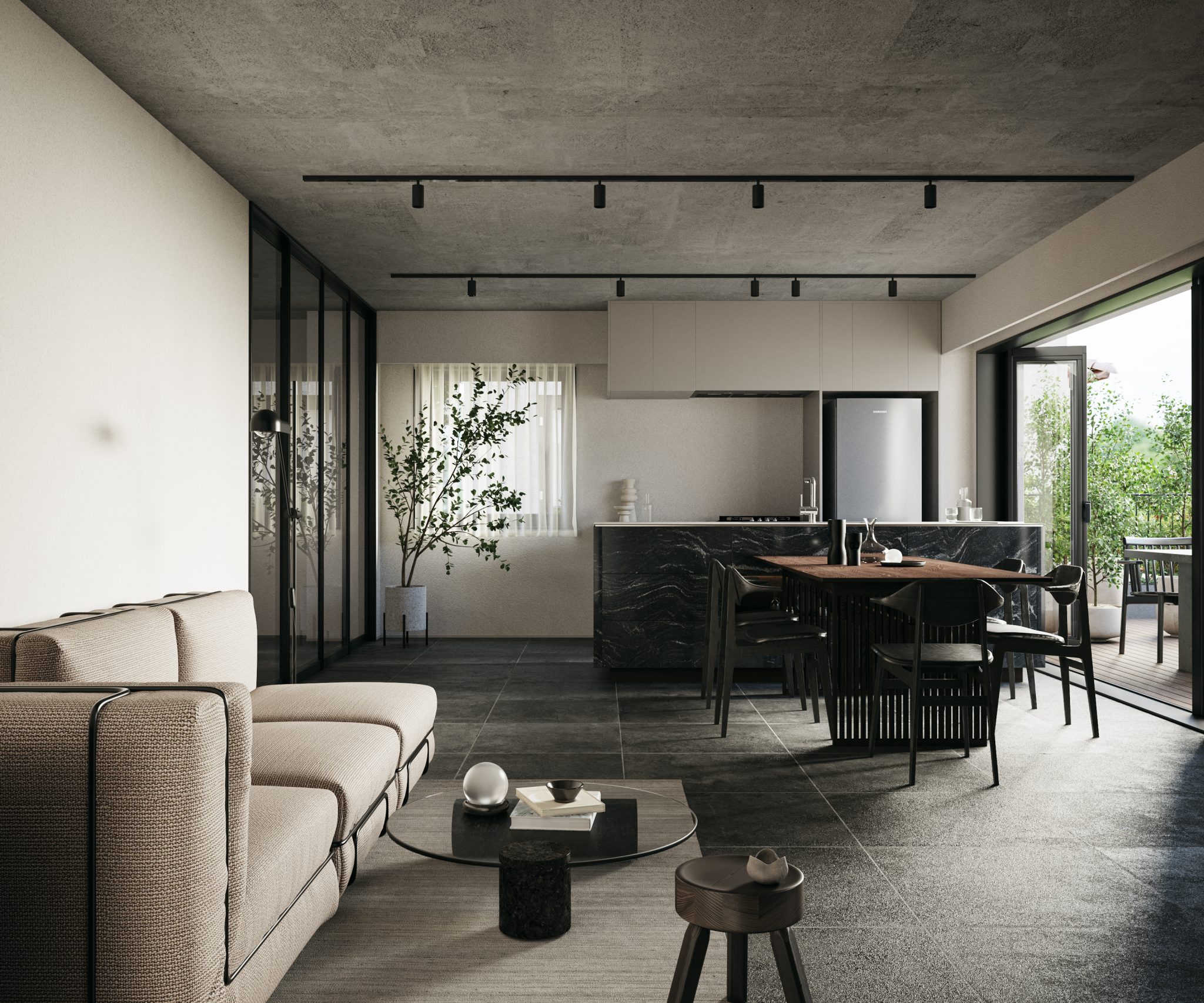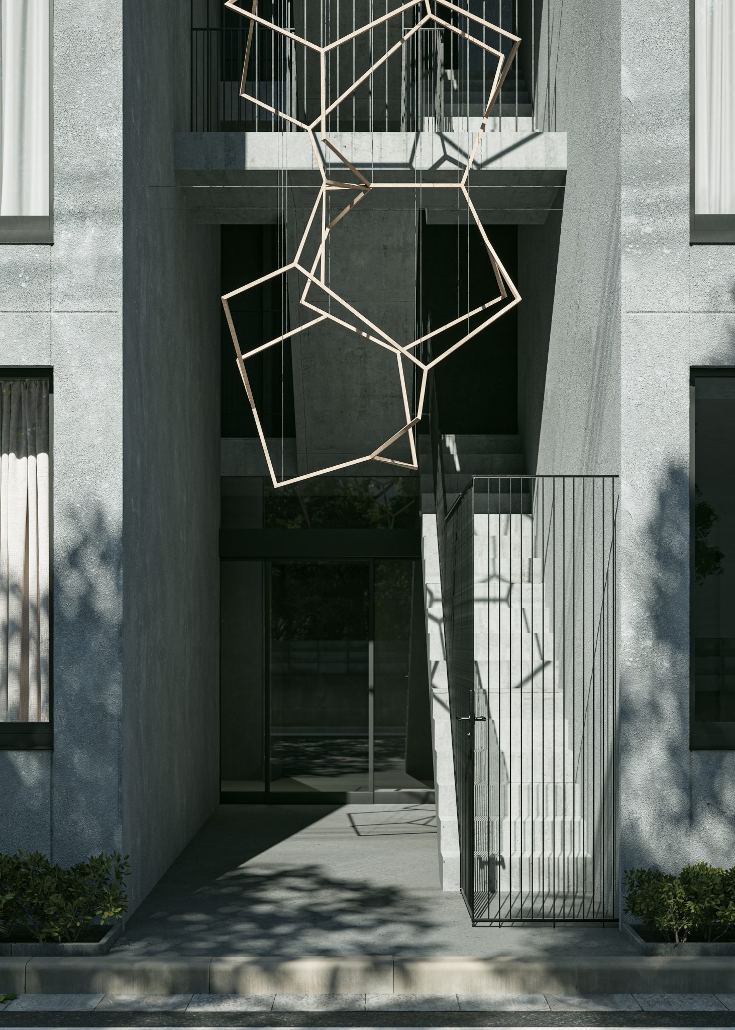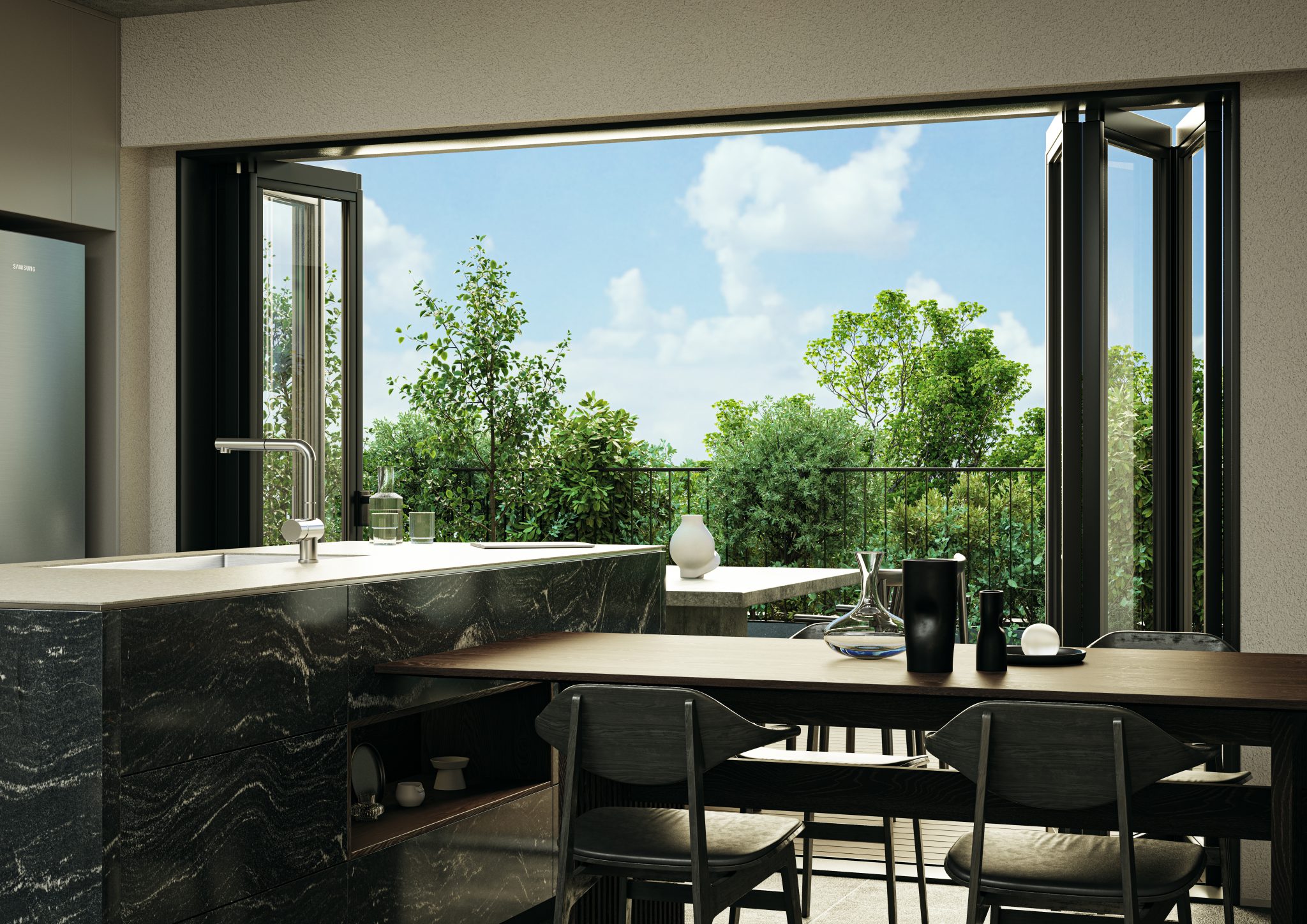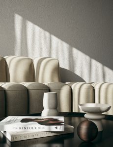 6戸に限定された多様なプランの住戸は全て多方向に開口部を有しています。うつろう陽の光や風の流れをしっかりと感じることができ、内壁は自然素材である漆喰が採用され、身体の芯から豊かさを感じられる住空間です。さらにドライエリアと連続するビルトインガレージ、リビングやダイニング、ベッドルームから延長された緑あふれるルーフトップテラスなど、内/外の連続性を楽しむ生活が展開できます。高さ11mのエントランスホールには新進気鋭のアーティストによる作品が常設展示されます。