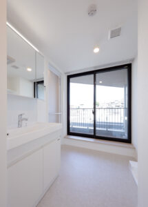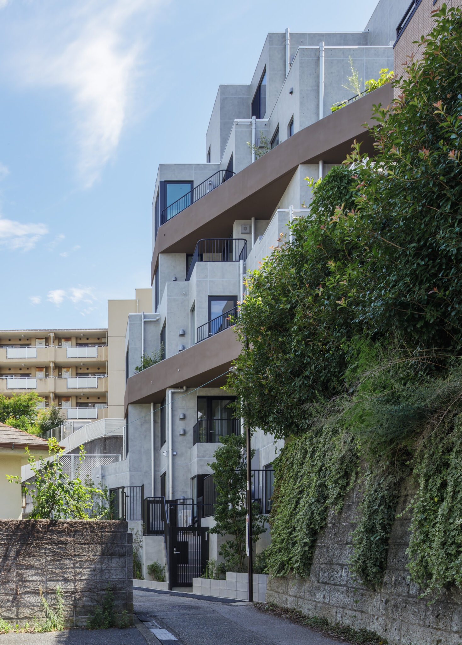 周辺の緑豊かな景観に呼応するように、植物を育むテラスを設け、上階でも自然を感じる住まいとなっています。
