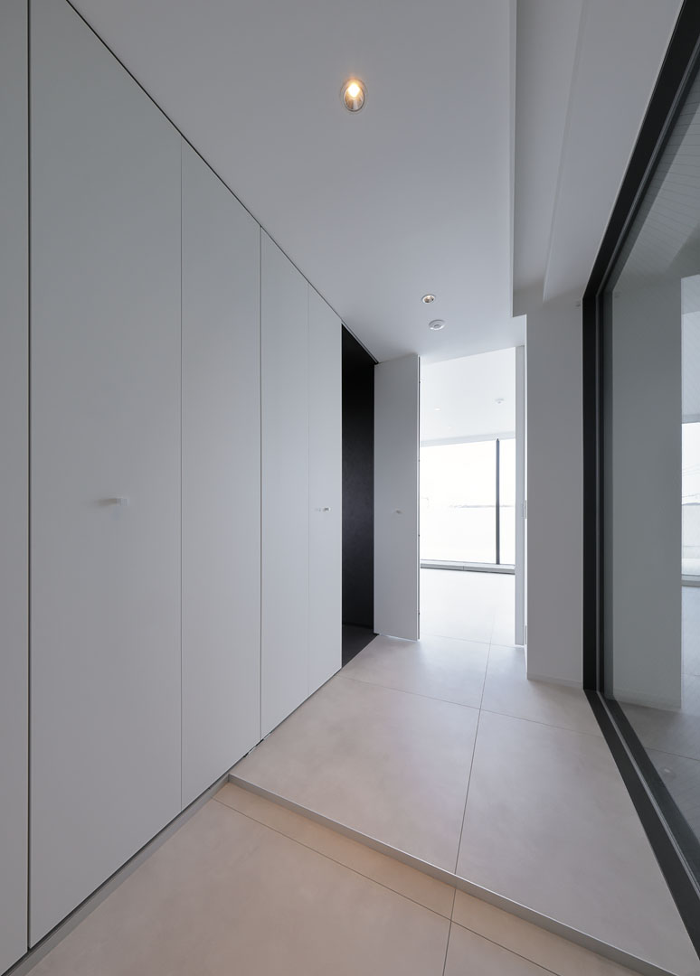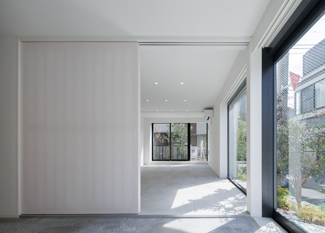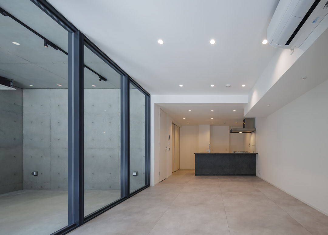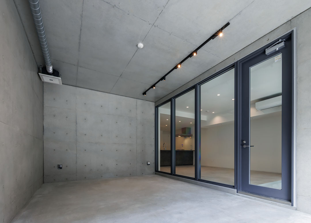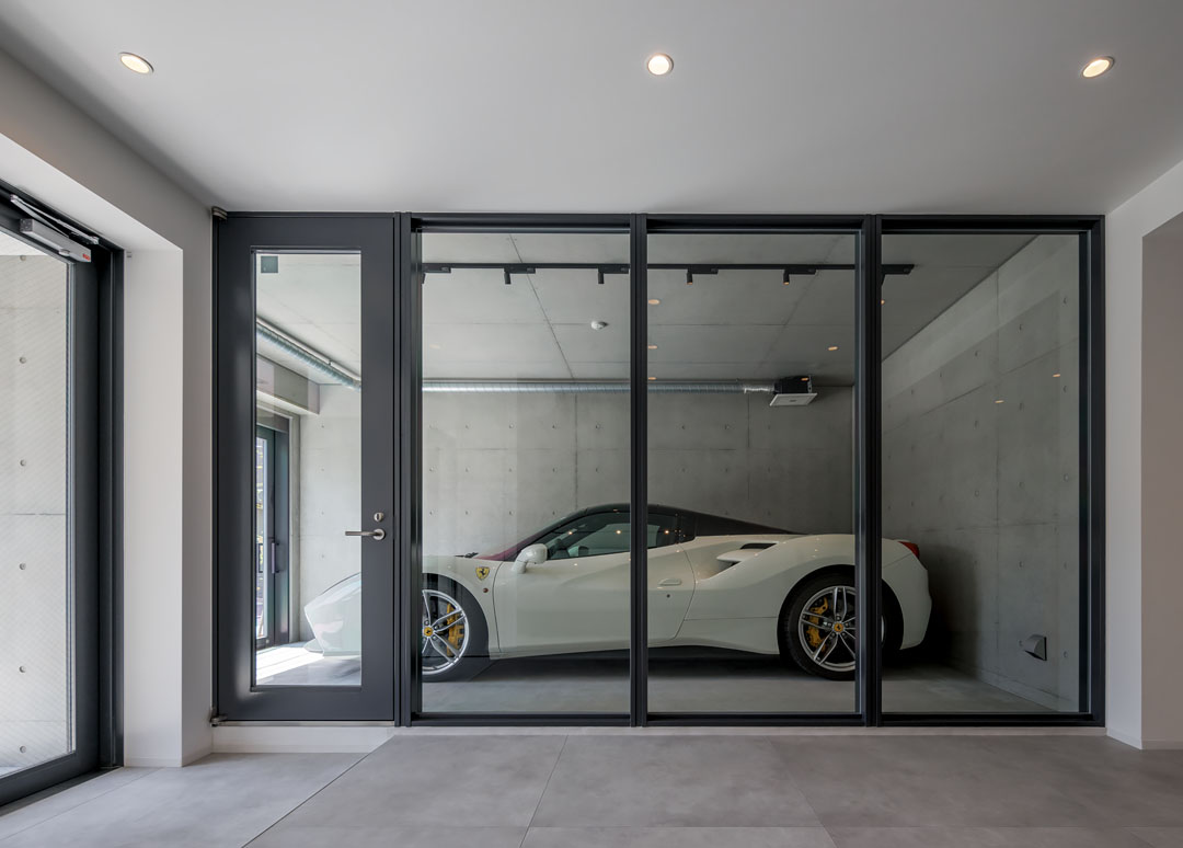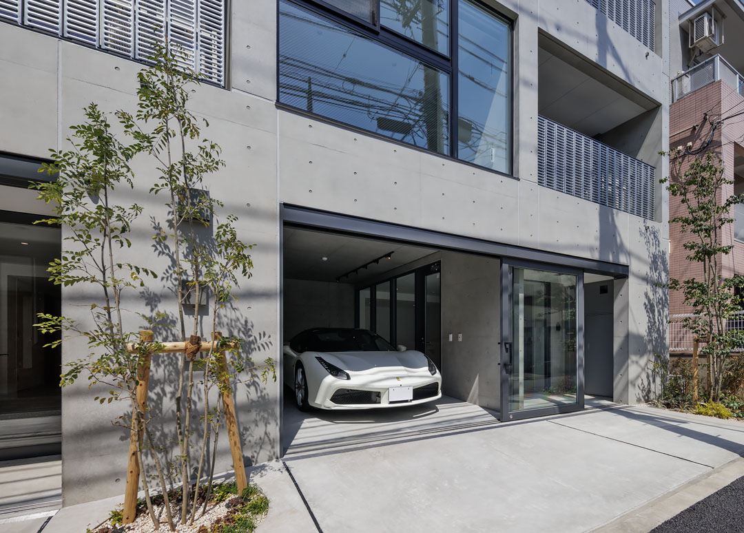 また、道路に面した1階はガレージ付き住宅。シャッターではなくガラス引き戸を採用することで、ガレージ内部が視認できるデザインとなっています。リビングとの仕切りもガラスを使用し、ガレージと玄関を土間で繋ぐことで、車の存在を自然に感じられる空間を演出。多様な使い方を可能にしました。