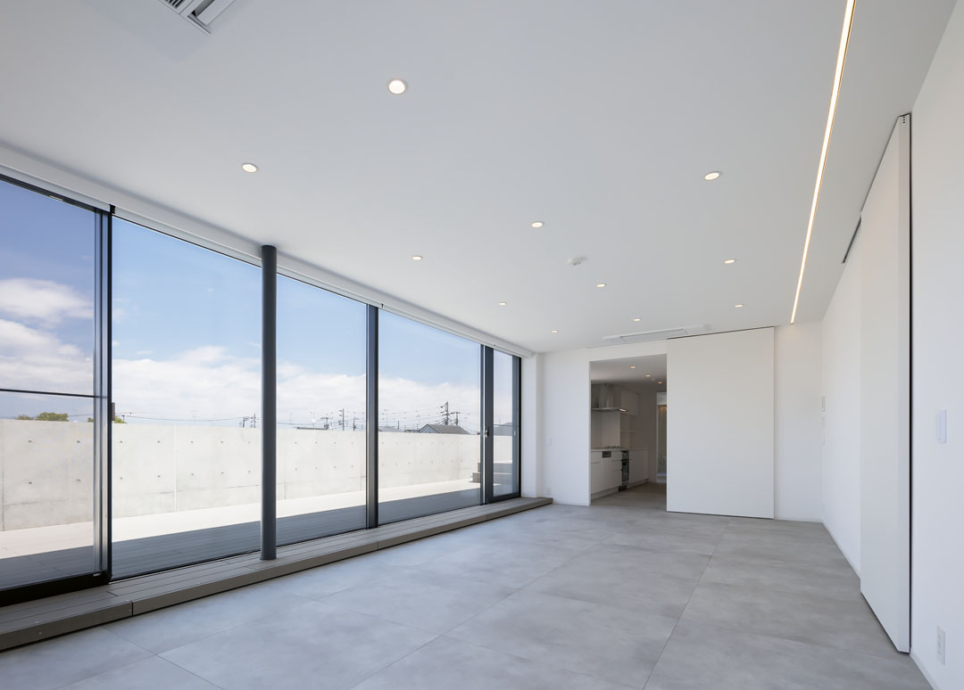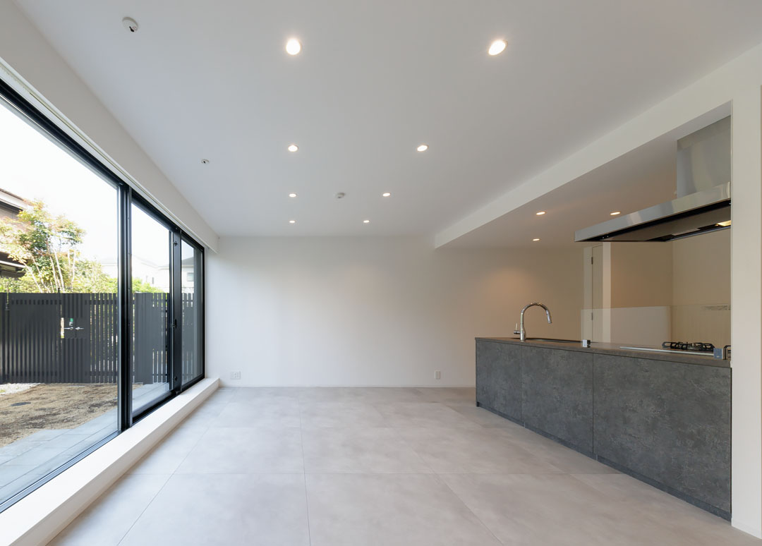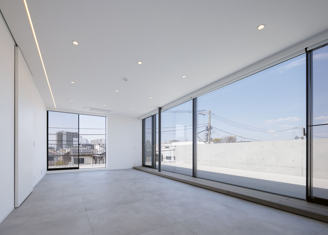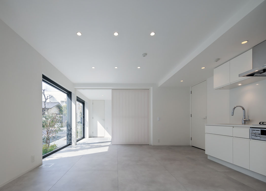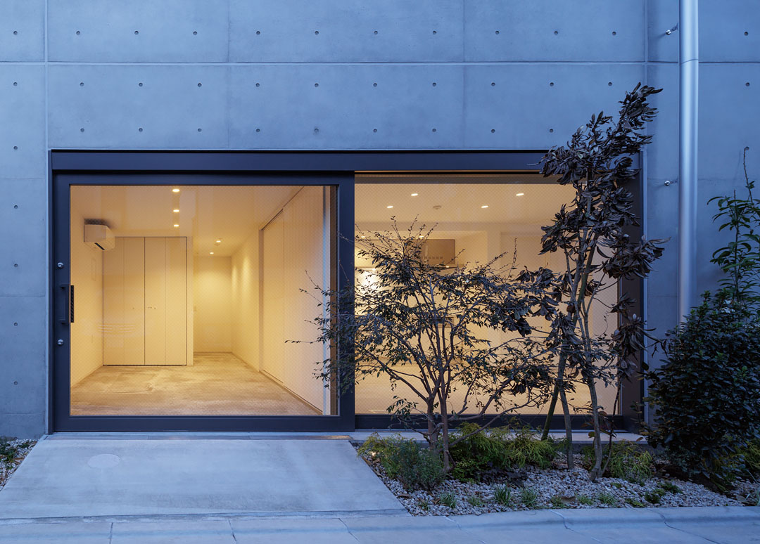 また、道路に面した1階はガレージ付き住宅。シャッターではなくガラス引き戸を採用することで、ガレージ内部が視認できるデザインとなっています。リビングとの仕切りもガラスを使用し、ガレージと玄関を土間で繋ぐことで、車の存在を自然に感じられる空間を演出。多様な使い方を可能にしました。