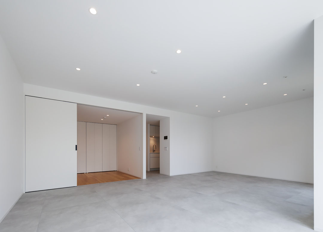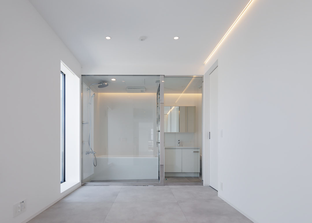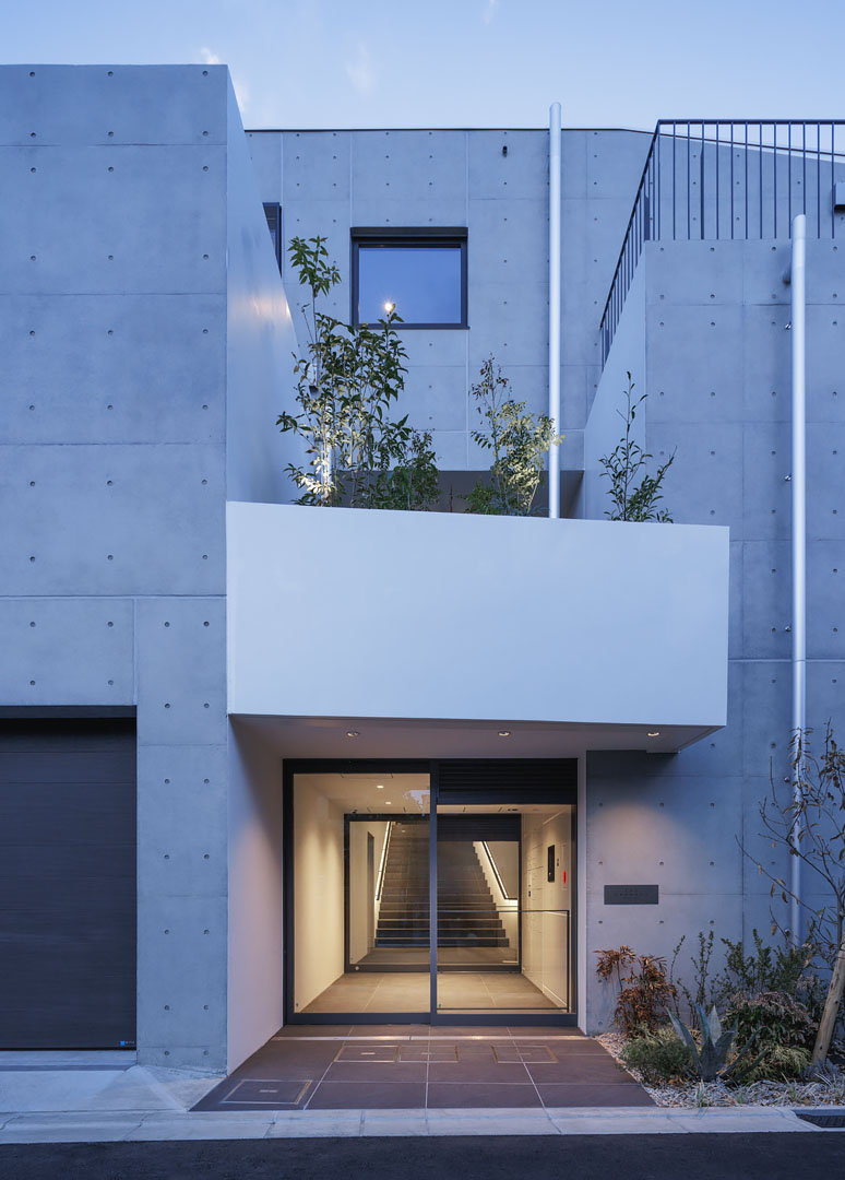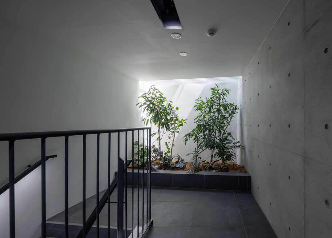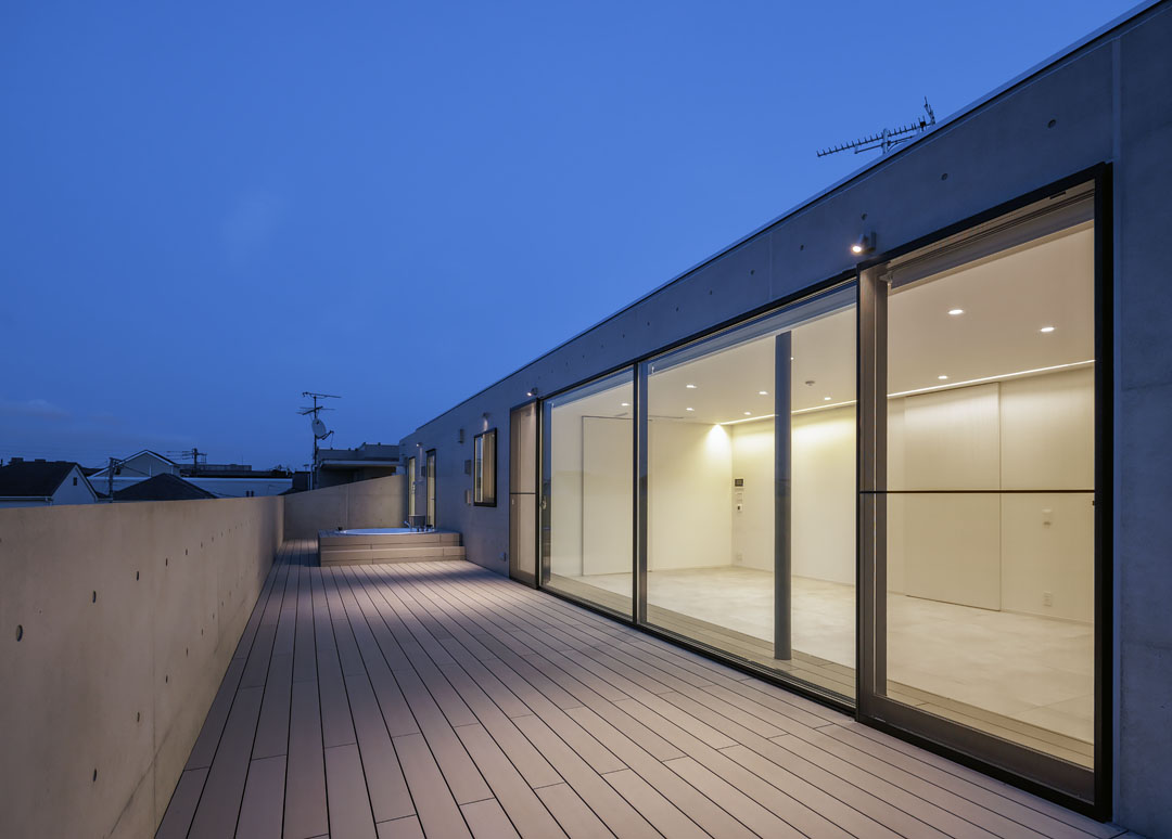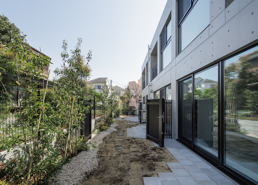 また、道路に面した1階はガレージ付き住宅。シャッターではなくガラス引き戸を採用することで、ガレージ内部が視認できるデザインとなっています。リビングとの仕切りもガラスを使用し、ガレージと玄関を土間で繋ぐことで、車の存在を自然に感じられる空間を演出。多様な使い方を可能にしました。