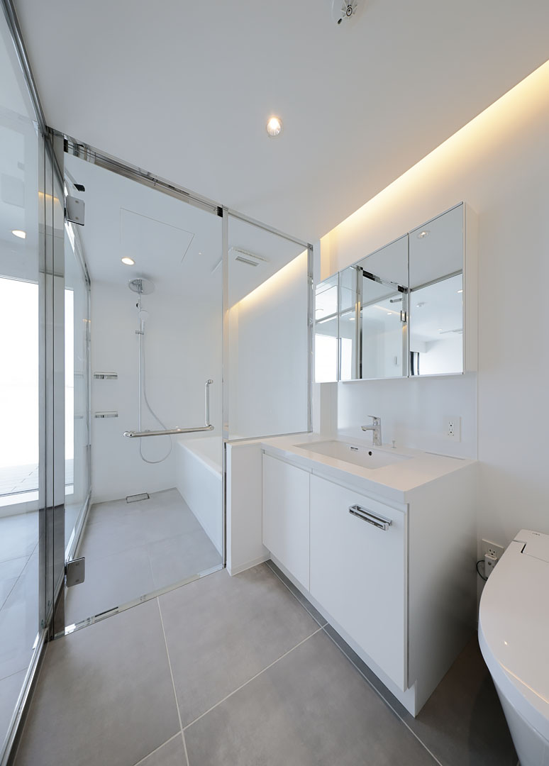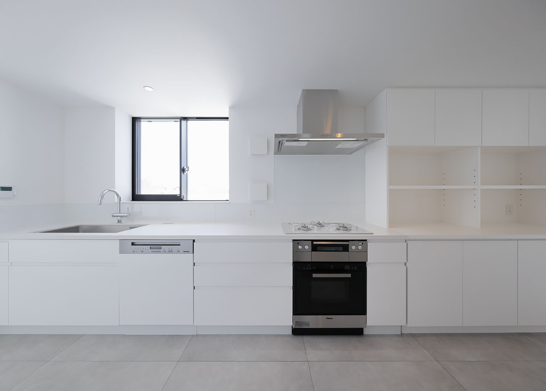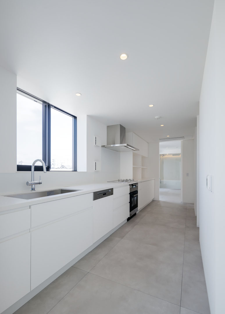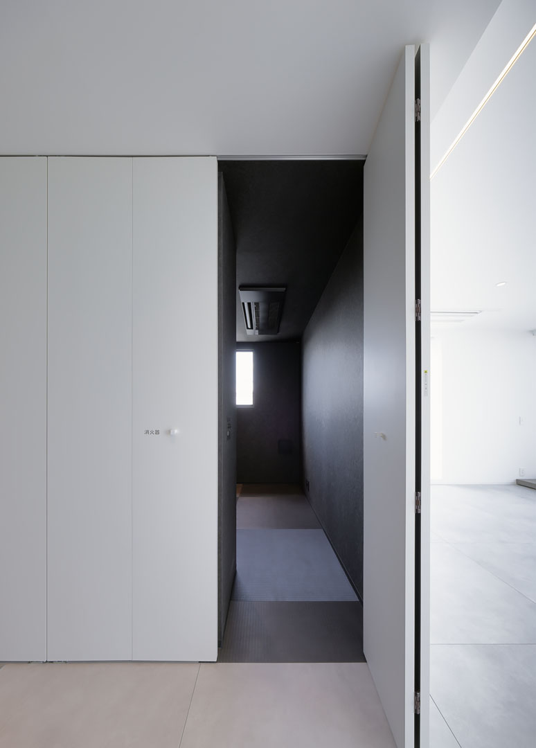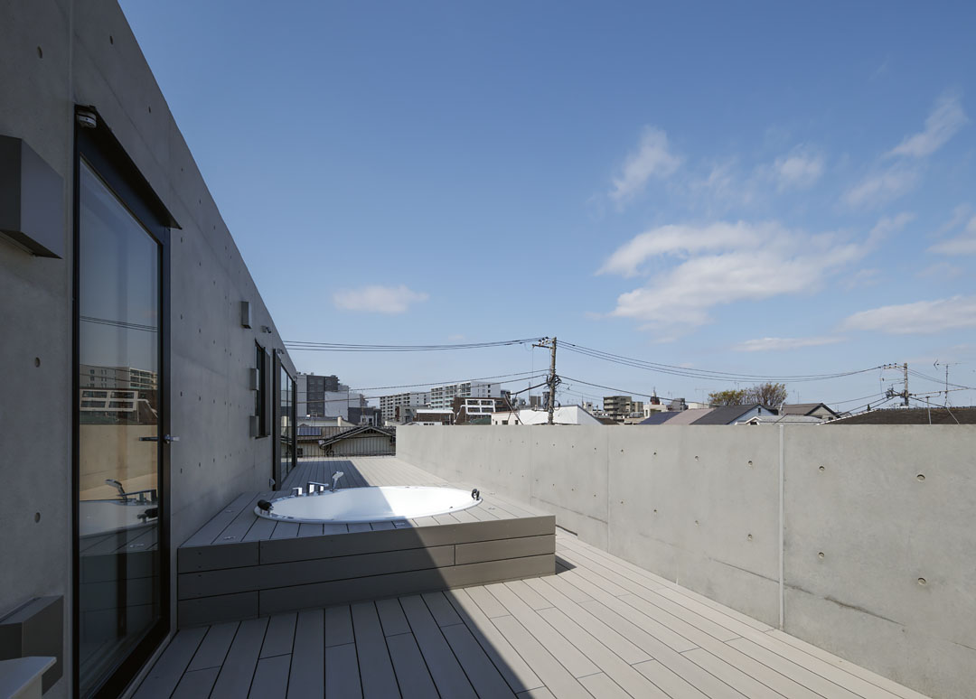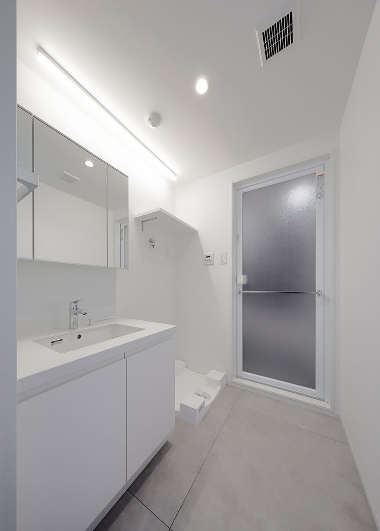 また、道路に面した1階はガレージ付き住宅。シャッターではなくガラス引き戸を採用することで、ガレージ内部が視認できるデザインとなっています。リビングとの仕切りもガラスを使用し、ガレージと玄関を土間で繋ぐことで、車の存在を自然に感じられる空間を演出。多様な使い方を可能にしました。