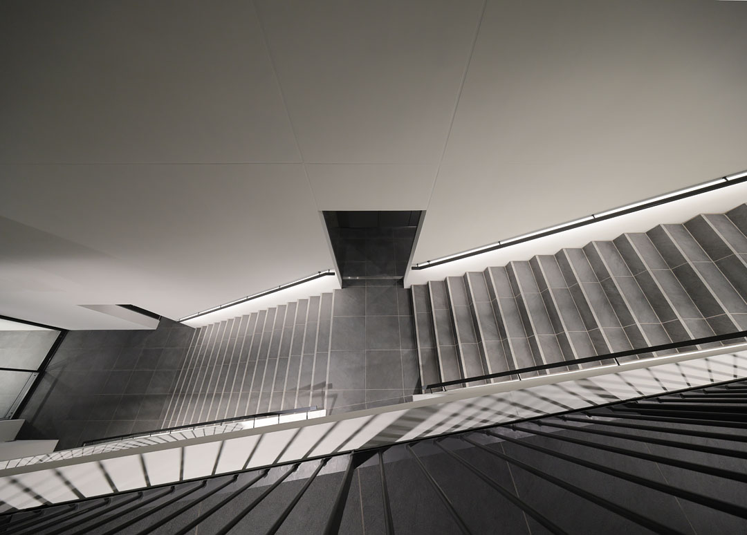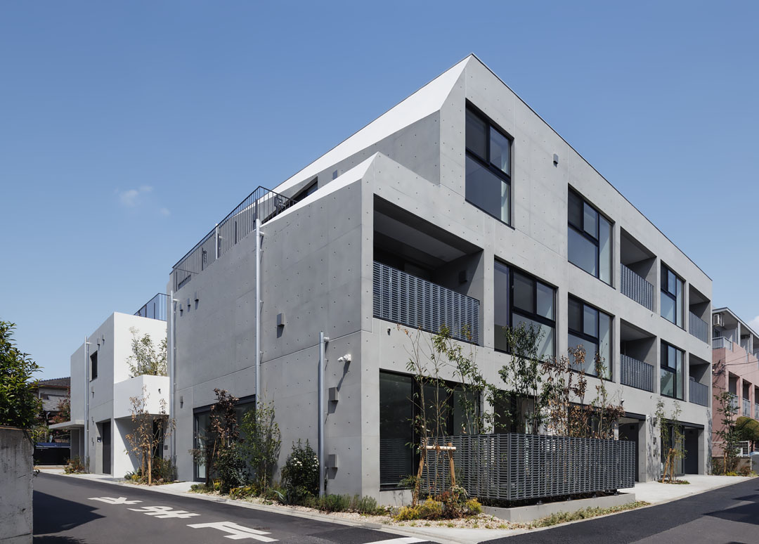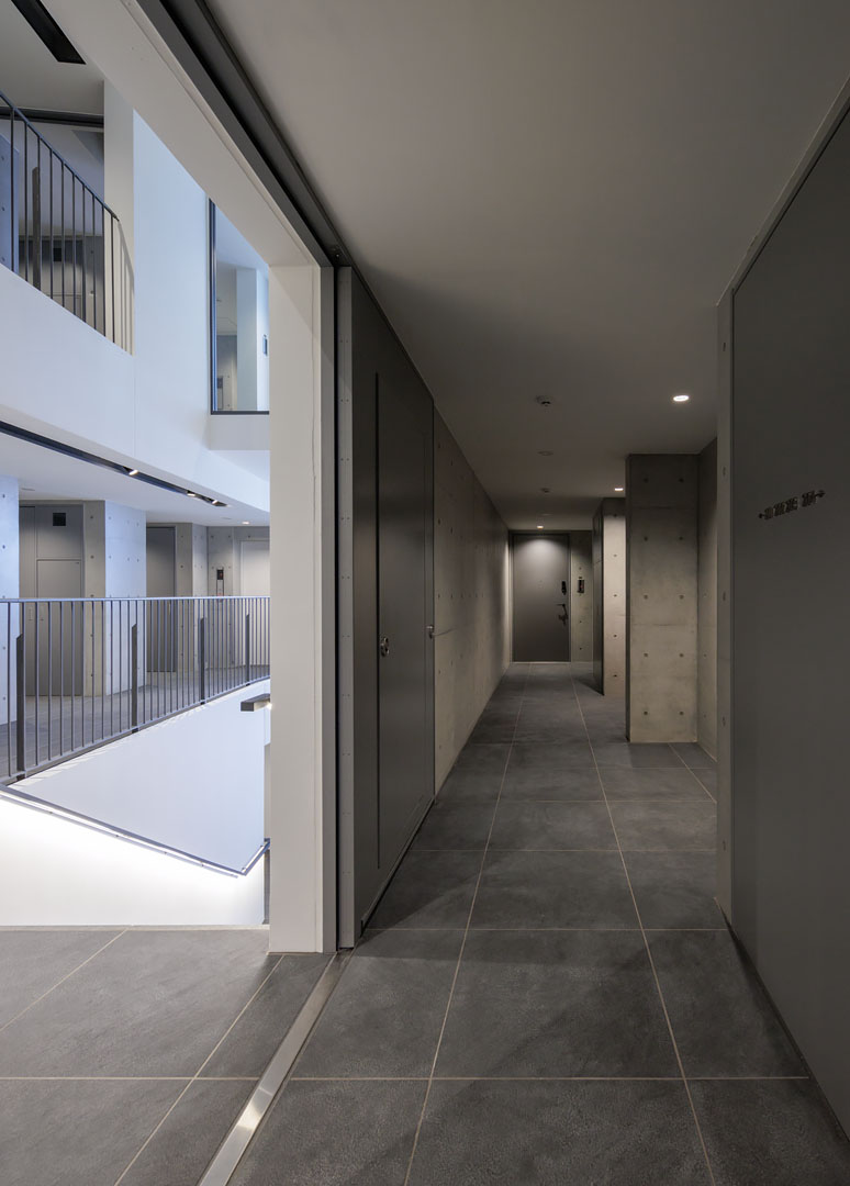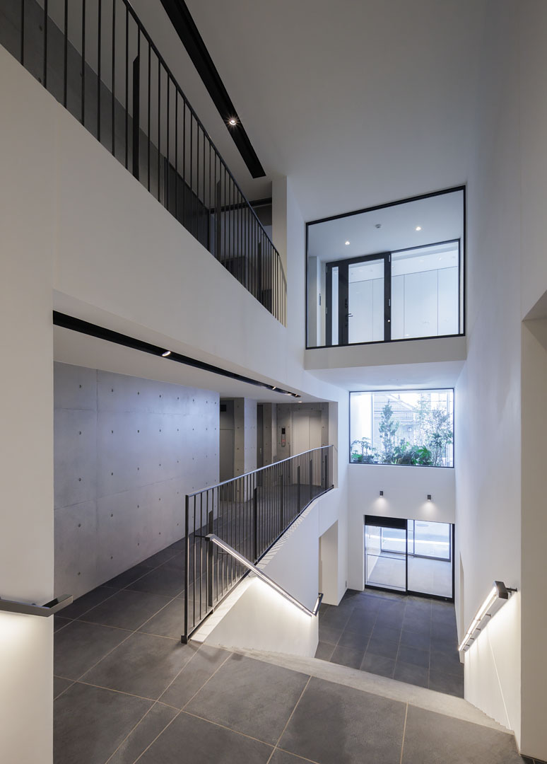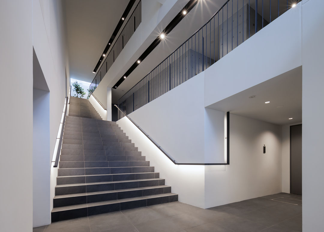 駅から少し離れた閑静な住宅街に位置する「THE GRANDUO CHITOFUNA」。大きなボリュームのファサードの中を覗くと、街のシンボルとなる3層吹抜けの大階段がお目見え。大階段にはトップライトや植栽を配置することで入居者にとってお気に入りの場所になることはもちろん、地域にとっても親しみやすい建物になるよう設計しました。