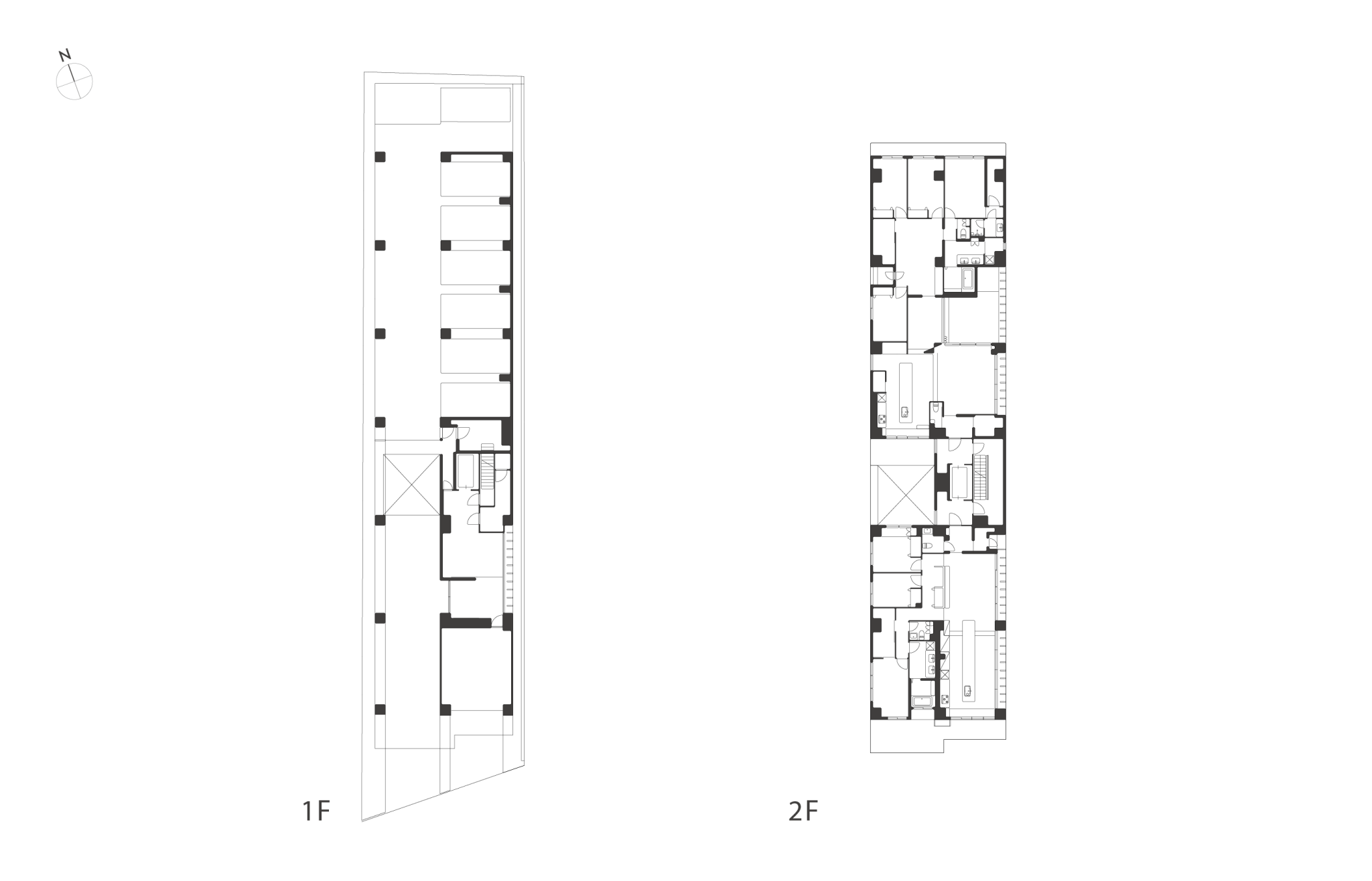 長さ50mの敷地形状を生かした、距離感をテーマとした建物
