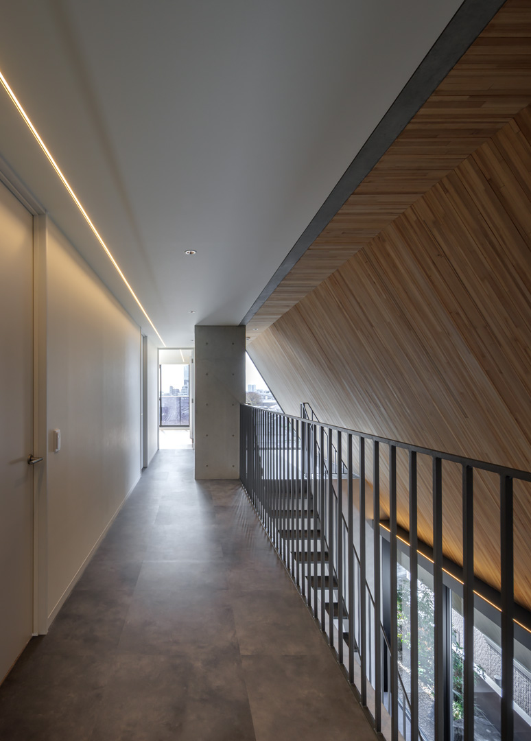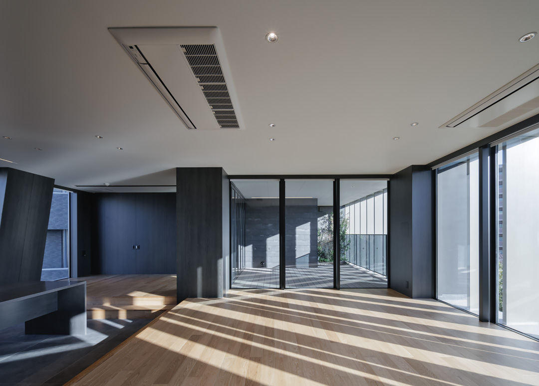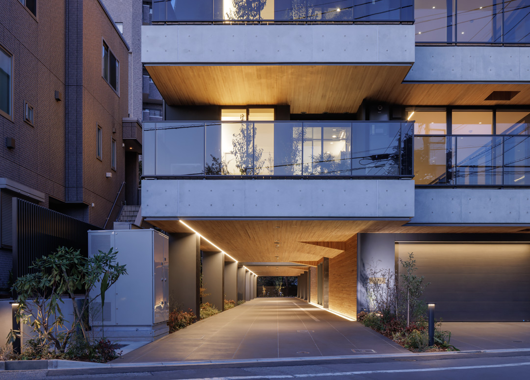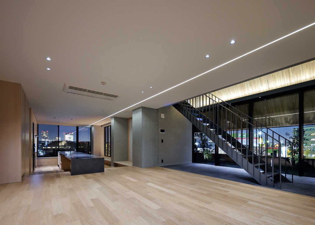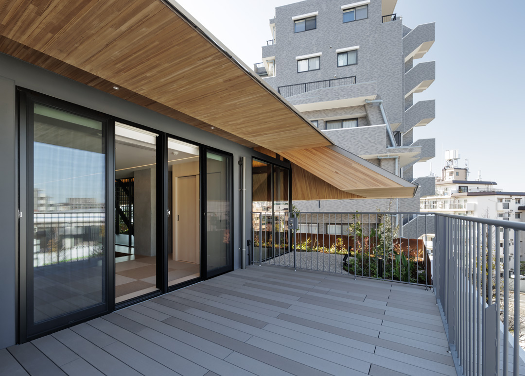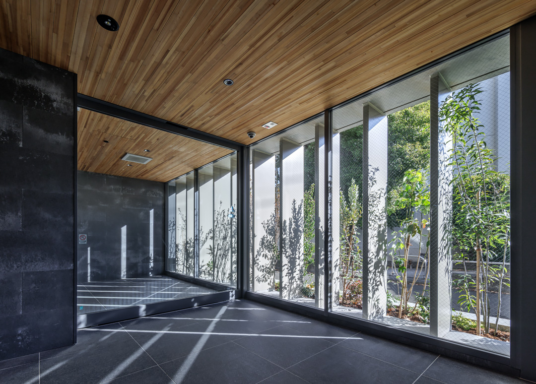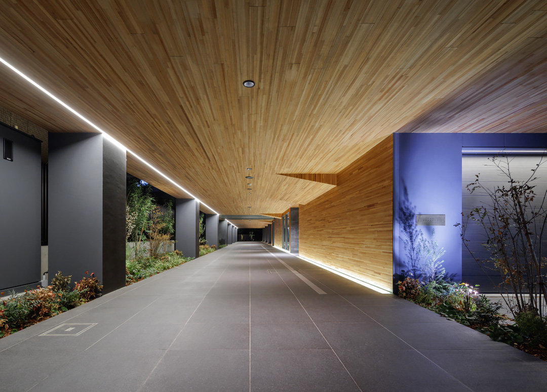 細長い敷地ならではのプロポーションを生かし、「長さ」と「奥性」を建築のテーマとした「THE GRANDUO YOGA」。住戸は、敷地形状を素直に反映した直線的なプランと、視覚的・動線的な連なりによって奥行きを感じさせるプランの2つの基準階を用意。リビング・ダイニングからギャラリー、アウトドアリビング、坪庭までを内外一体で有機的につなぎ、段差やガラス越しの連続によって、光や風を感じながら空間の広がりを楽しめるシーケンシャルな構成としました。また、二層メゾネットとし、高度斜線によって生まれる斜めの空間を生かした吹抜けにより「高さ」を強調。吹抜けに沿って日本庭園を配置し、板張り勾配屋根の軒先が切り取る印象的なシーンを演出しました。