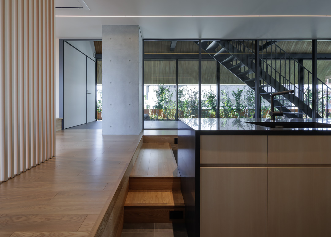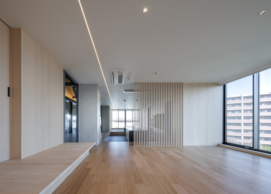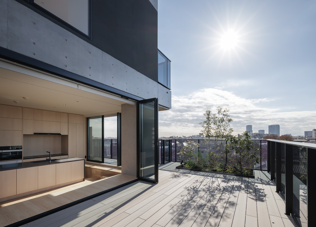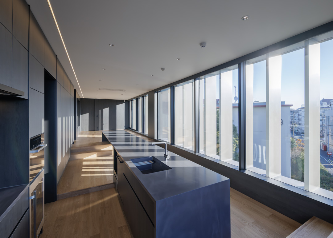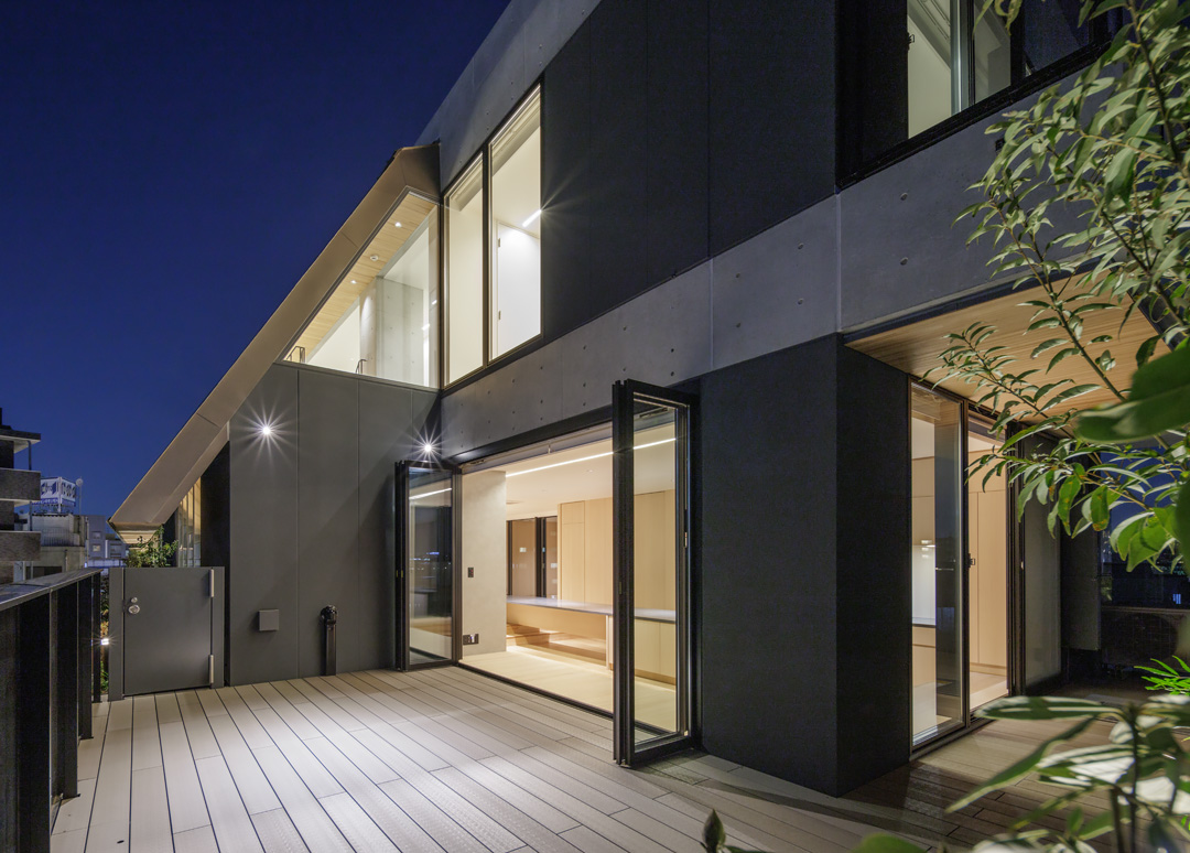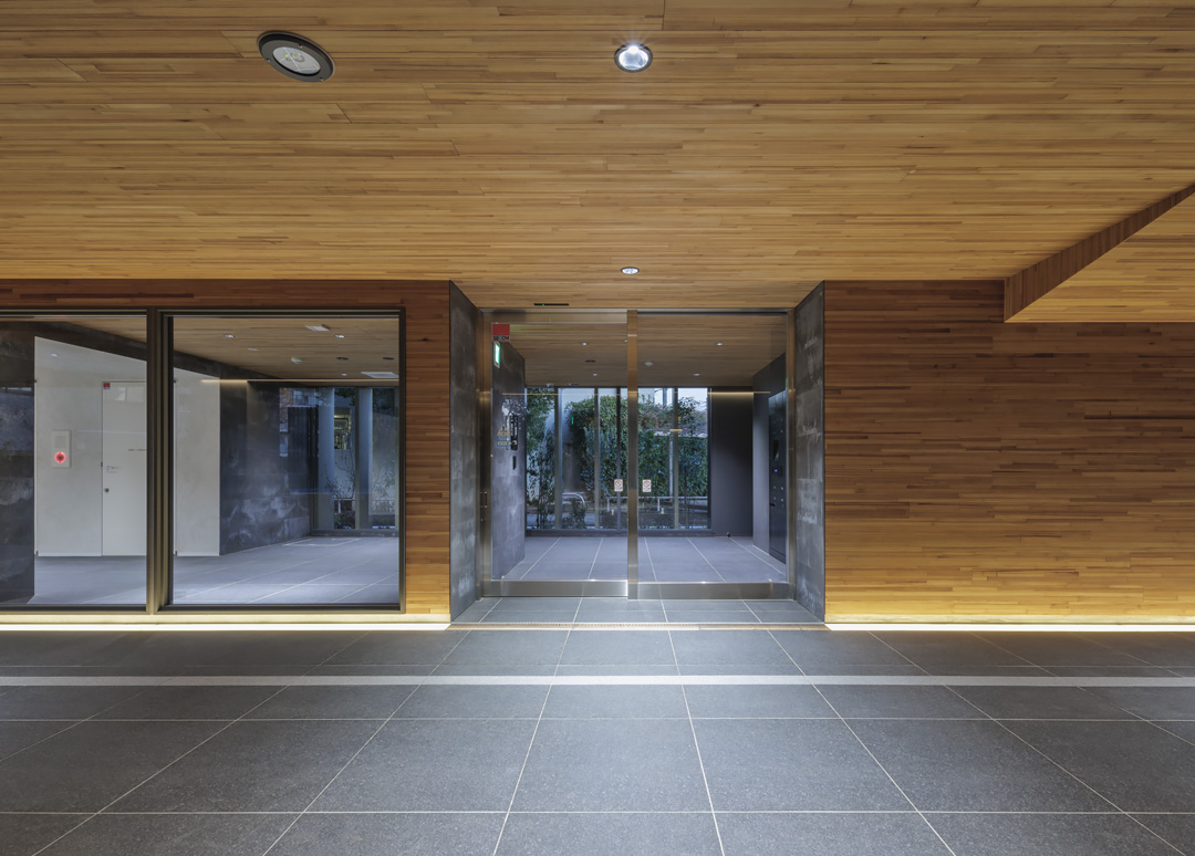 細長い敷地ならではのプロポーションを生かし、「長さ」と「奥性」を建築のテーマとした「THE GRANDUO YOGA」。住戸は、敷地形状を素直に反映した直線的なプランと、視覚的・動線的な連なりによって奥行きを感じさせるプランの2つの基準階を用意。リビング・ダイニングからギャラリー、アウトドアリビング、坪庭までを内外一体で有機的につなぎ、段差やガラス越しの連続によって、光や風を感じながら空間の広がりを楽しめるシーケンシャルな構成としました。また、二層メゾネットとし、高度斜線によって生まれる斜めの空間を生かした吹抜けにより「高さ」を強調。吹抜けに沿って日本庭園を配置し、板張り勾配屋根の軒先が切り取る印象的なシーンを演出しました。