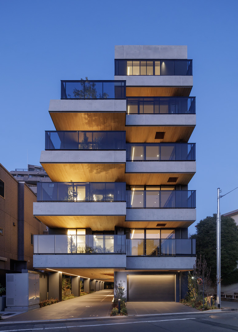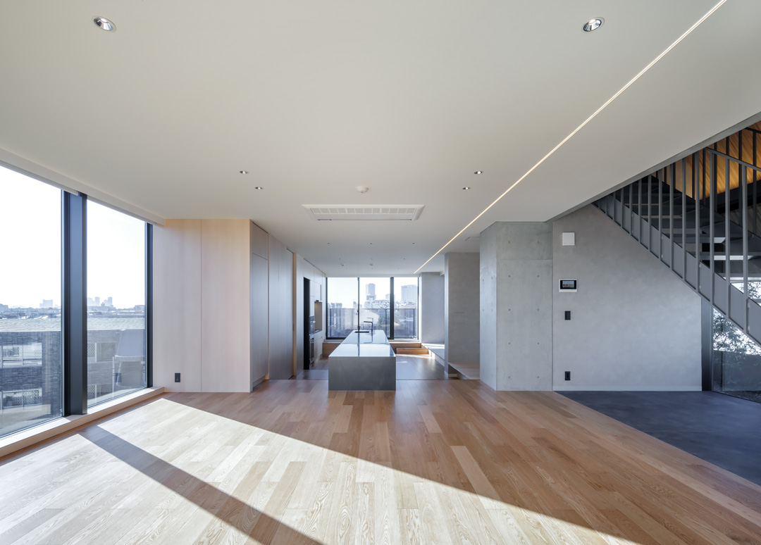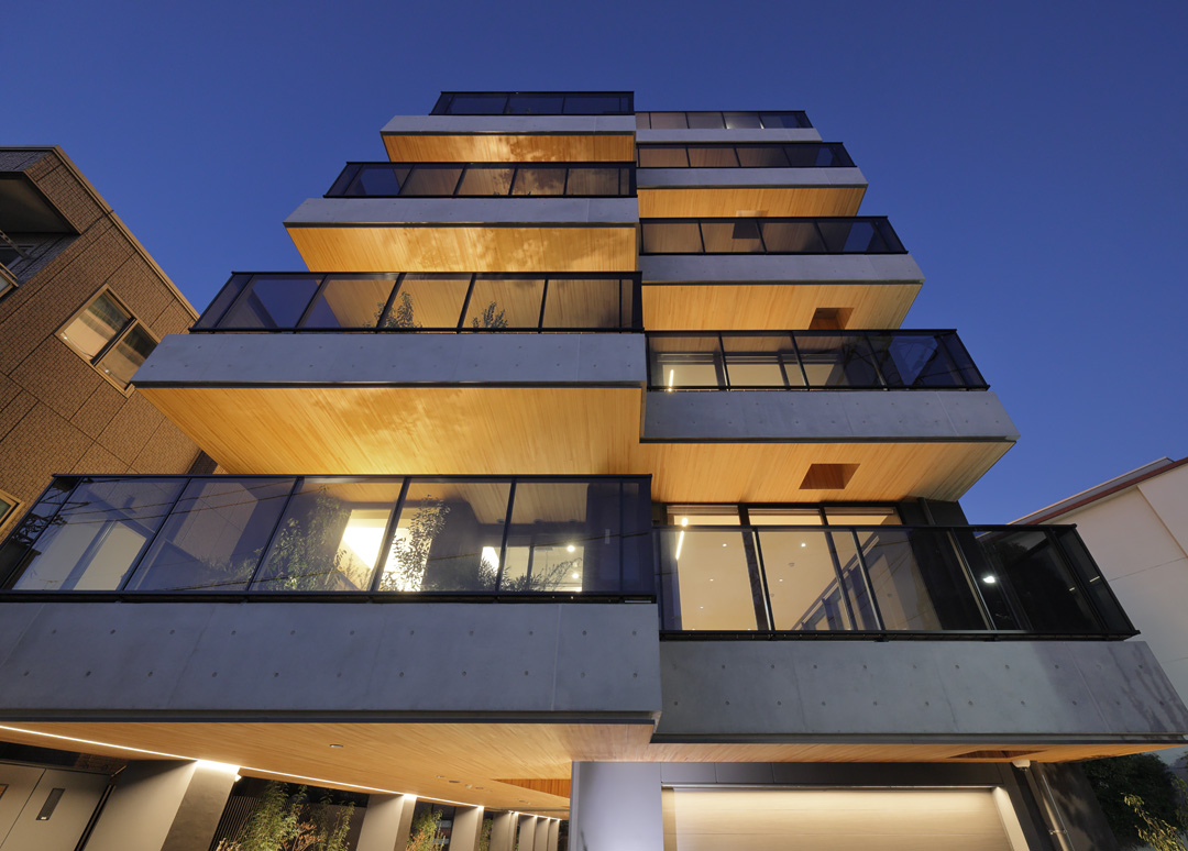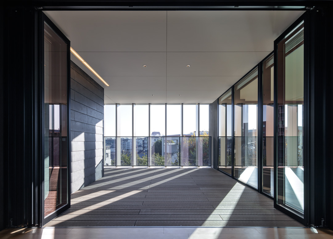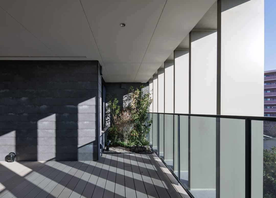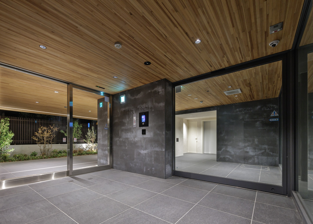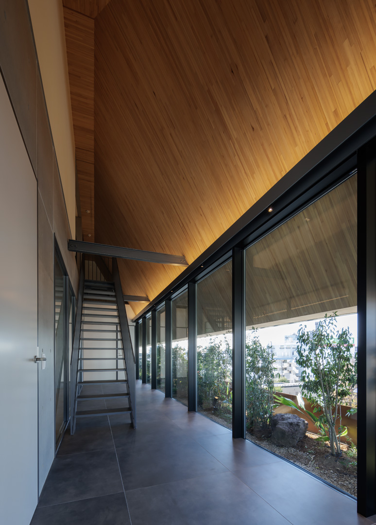 細長い敷地ならではのプロポーションを生かし、「長さ」と「奥性」を建築のテーマとした「THE GRANDUO YOGA」。住戸は、敷地形状を素直に反映した直線的なプランと、視覚的・動線的な連なりによって奥行きを感じさせるプランの2つの基準階を用意。リビング・ダイニングからギャラリー、アウトドアリビング、坪庭までを内外一体で有機的につなぎ、段差やガラス越しの連続によって、光や風を感じながら空間の広がりを楽しめるシーケンシャルな構成としました。また、二層メゾネットとし、高度斜線によって生まれる斜めの空間を生かした吹抜けにより「高さ」を強調。吹抜けに沿って日本庭園を配置し、板張り勾配屋根の軒先が切り取る印象的なシーンを演出しました。