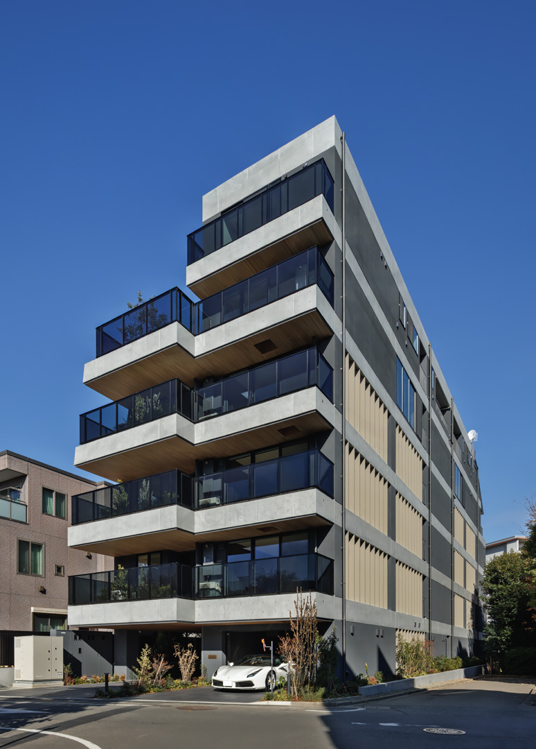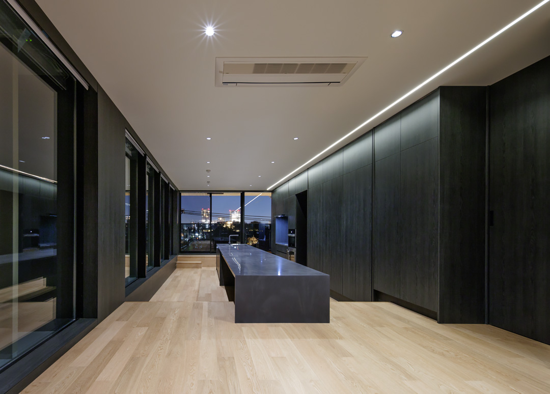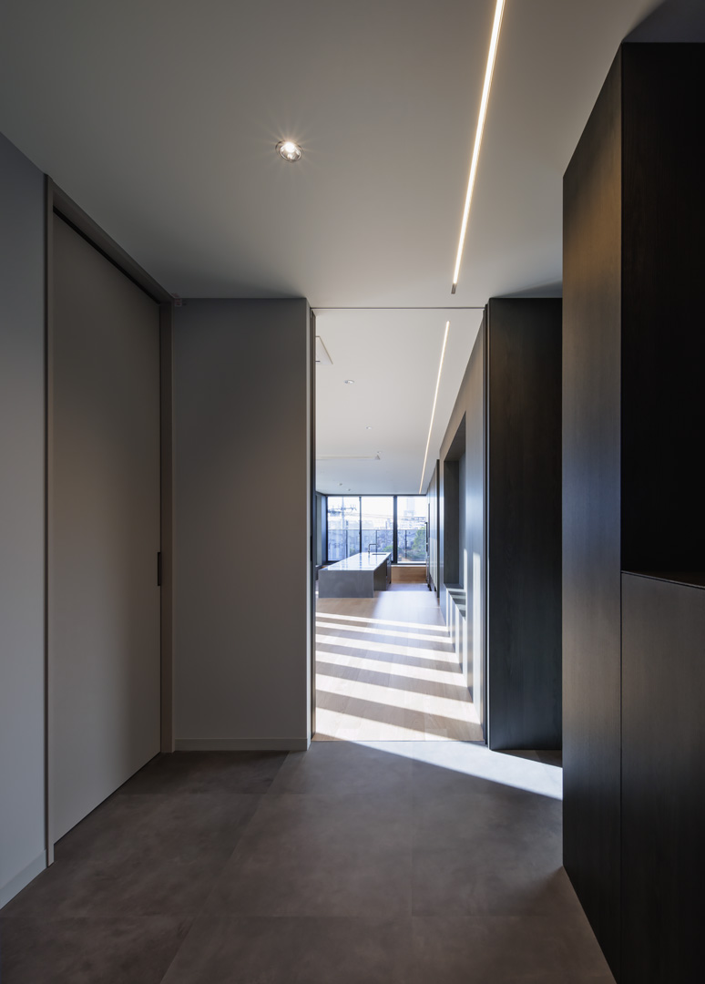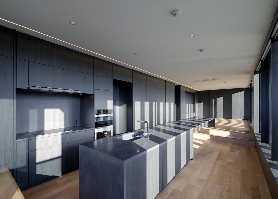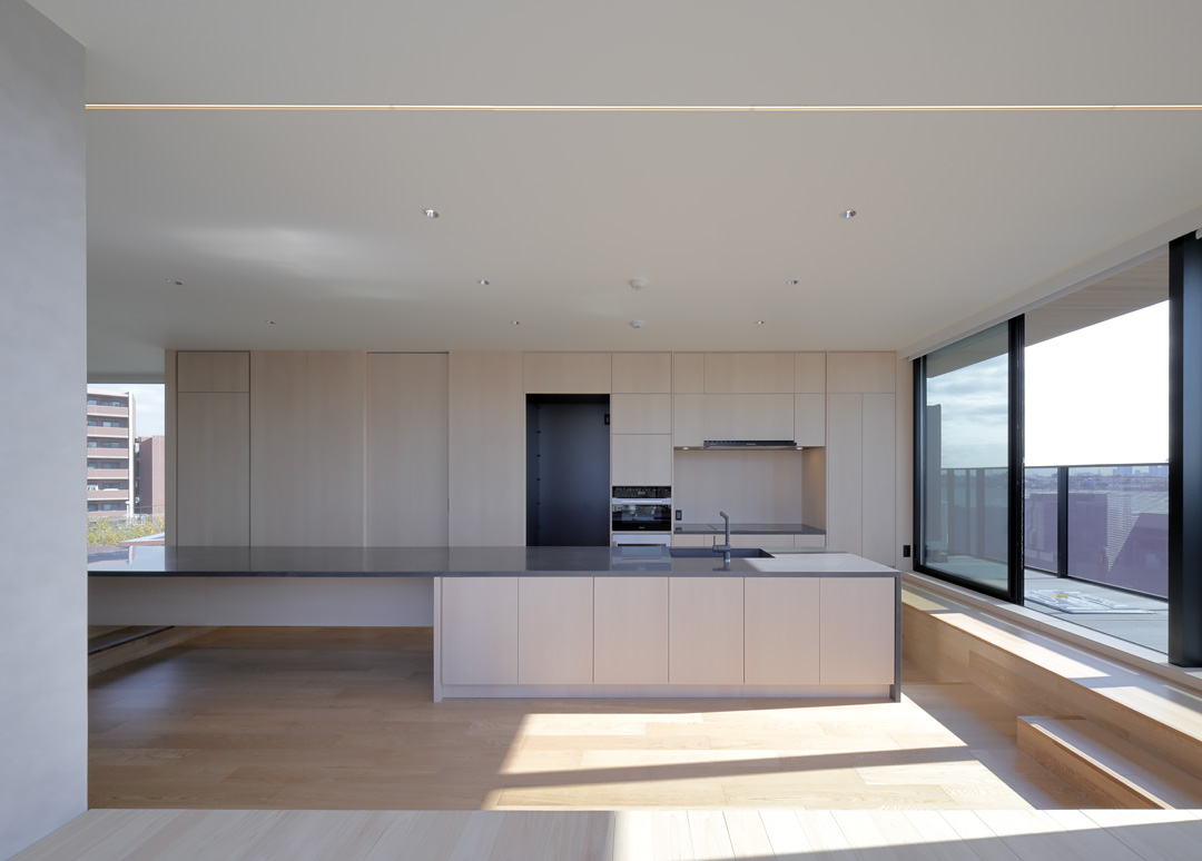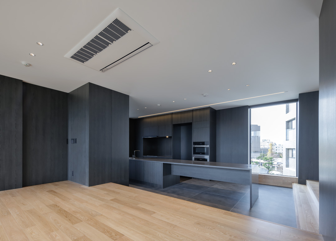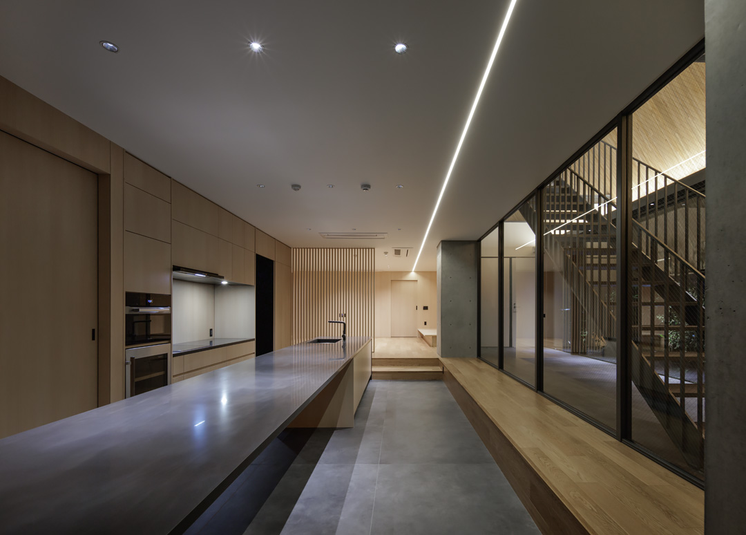 細長い敷地ならではのプロポーションを生かし、「長さ」と「奥性」を建築のテーマとした「THE GRANDUO YOGA」。住戸は、敷地形状を素直に反映した直線的なプランと、視覚的・動線的な連なりによって奥行きを感じさせるプランの2つの基準階を用意。リビング・ダイニングからギャラリー、アウトドアリビング、坪庭までを内外一体で有機的につなぎ、段差やガラス越しの連続によって、光や風を感じながら空間の広がりを楽しめるシーケンシャルな構成としました。また、二層メゾネットとし、高度斜線によって生まれる斜めの空間を生かした吹抜けにより「高さ」を強調。吹抜けに沿って日本庭園を配置し、板張り勾配屋根の軒先が切り取る印象的なシーンを演出しました。