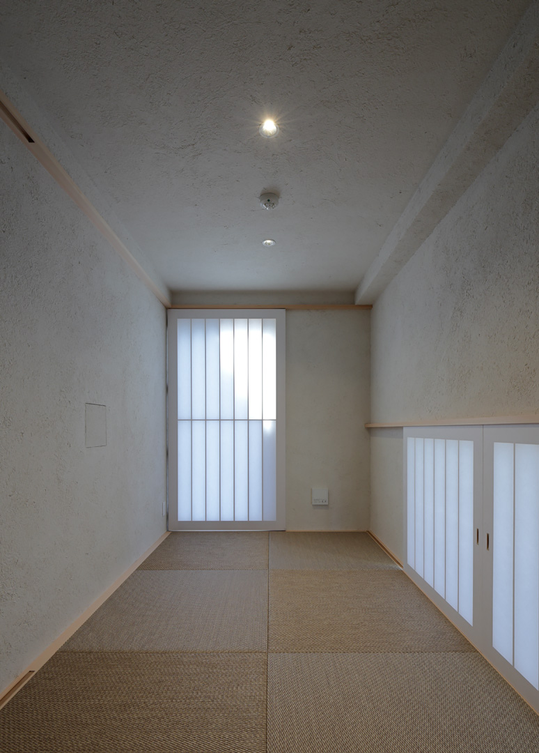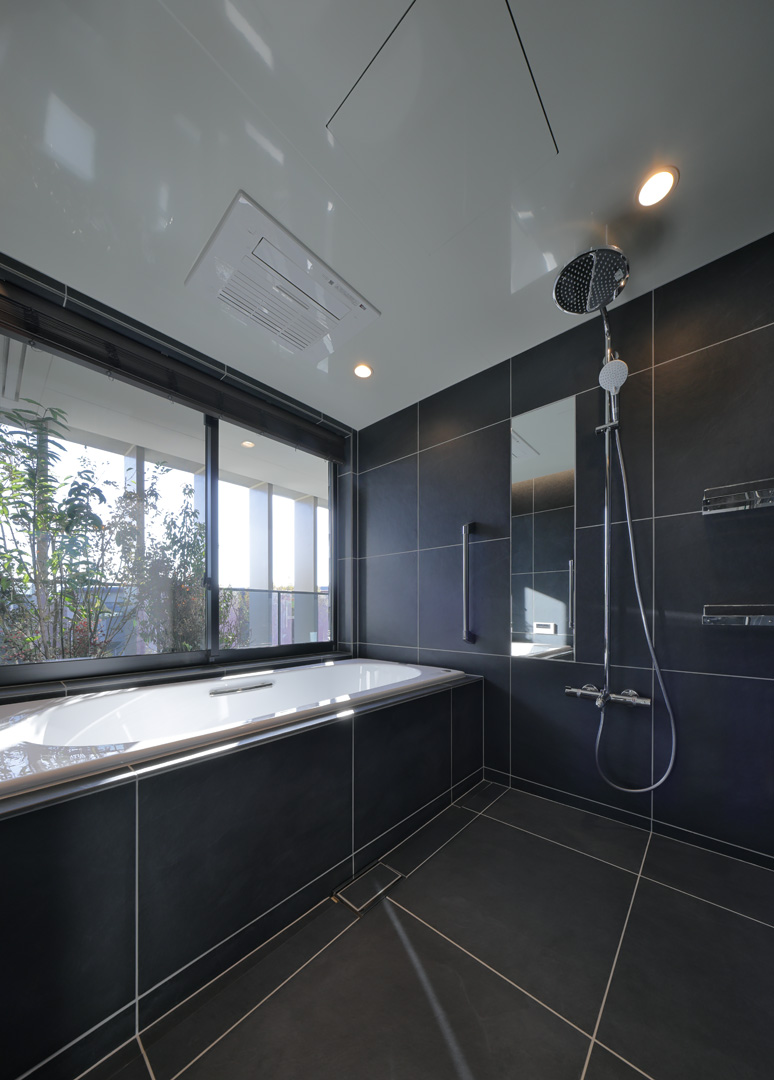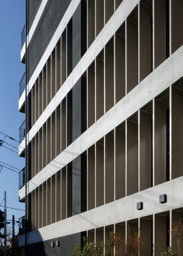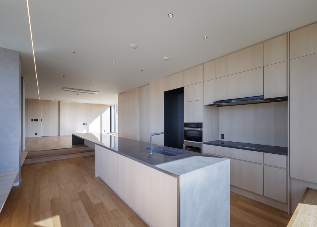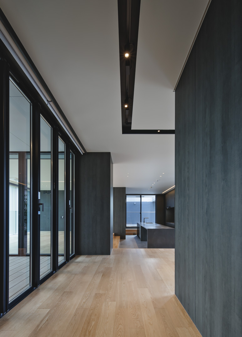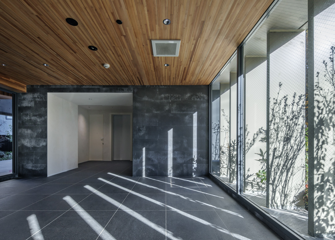 細長い敷地ならではのプロポーションを生かし、「長さ」と「奥性」を建築のテーマとした「THE GRANDUO YOGA」。住戸は、敷地形状を素直に反映した直線的なプランと、視覚的・動線的な連なりによって奥行きを感じさせるプランの2つの基準階を用意。リビング・ダイニングからギャラリー、アウトドアリビング、坪庭までを内外一体で有機的につなぎ、段差やガラス越しの連続によって、光や風を感じながら空間の広がりを楽しめるシーケンシャルな構成としました。また、二層メゾネットとし、高度斜線によって生まれる斜めの空間を生かした吹抜けにより「高さ」を強調。吹抜けに沿って日本庭園を配置し、板張り勾配屋根の軒先が切り取る印象的なシーンを演出しました。
