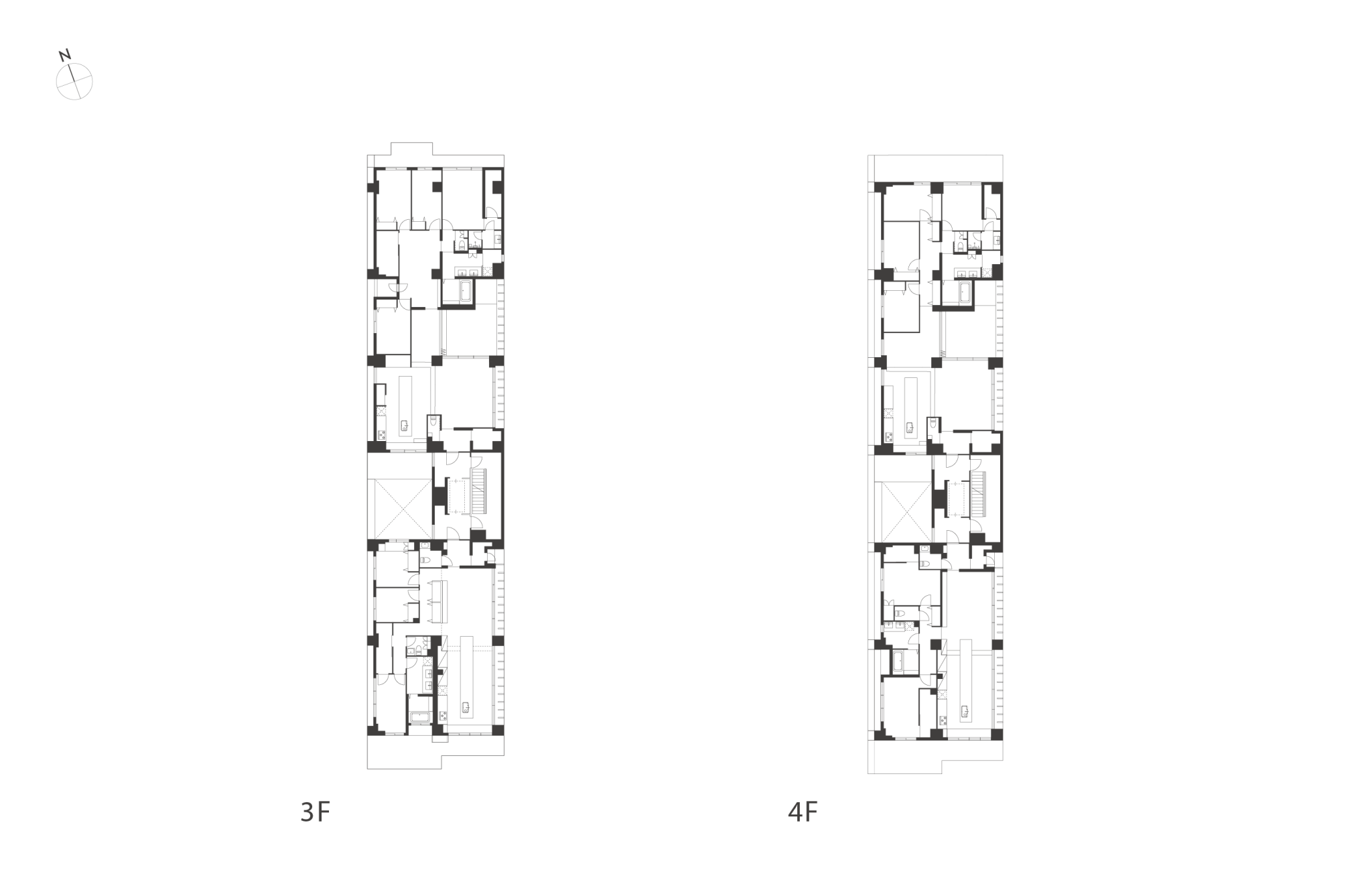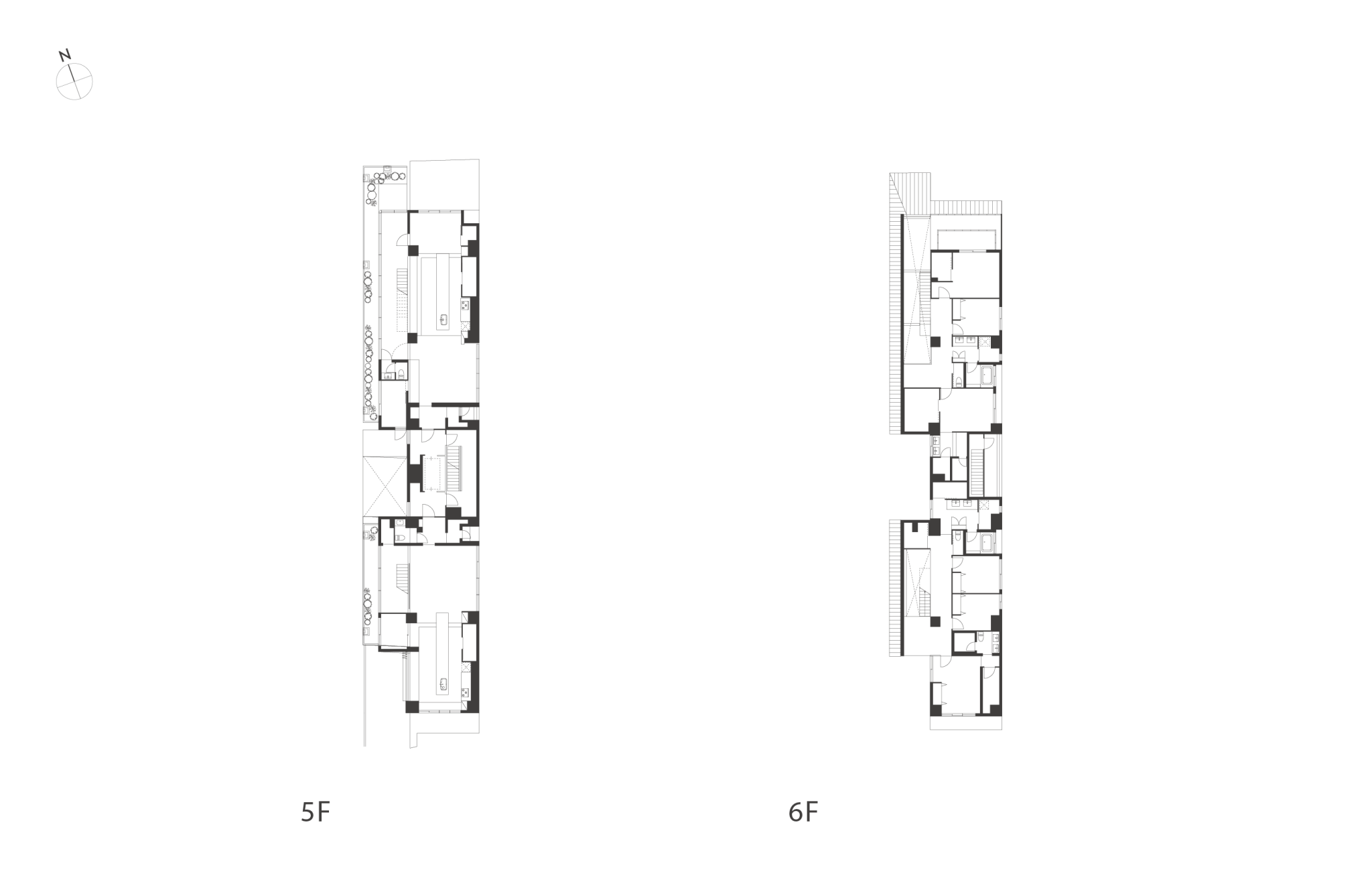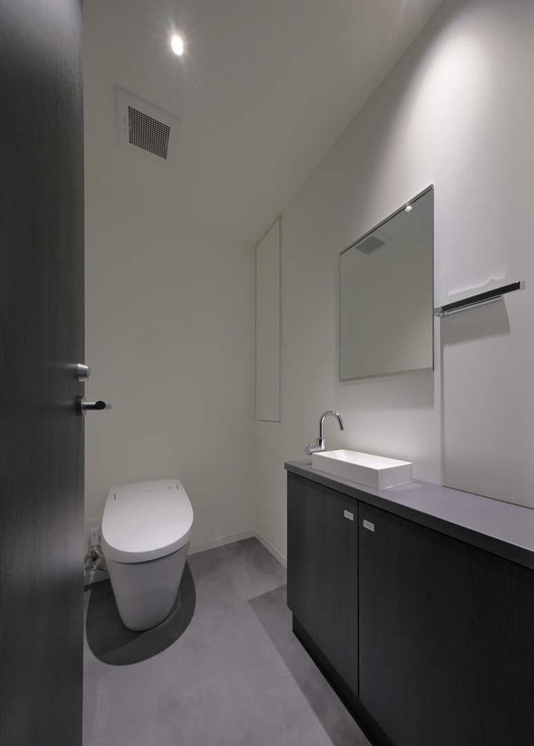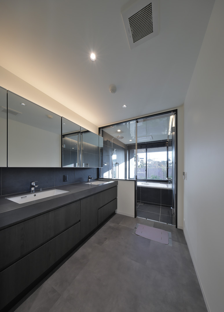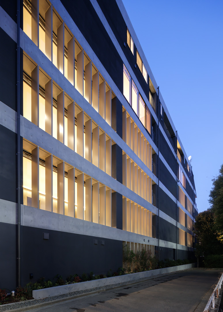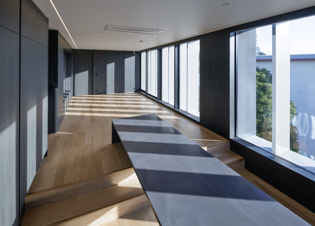 細長い敷地ならではのプロポーションを生かし、「長さ」と「奥性」を建築のテーマとした「THE GRANDUO YOGA」。住戸は、敷地形状を素直に反映した直線的なプランと、視覚的・動線的な連なりによって奥行きを感じさせるプランの2つの基準階を用意。リビング・ダイニングからギャラリー、アウトドアリビング、坪庭までを内外一体で有機的につなぎ、段差やガラス越しの連続によって、光や風を感じながら空間の広がりを楽しめるシーケンシャルな構成としました。また、二層メゾネットとし、高度斜線によって生まれる斜めの空間を生かした吹抜けにより「高さ」を強調。吹抜けに沿って日本庭園を配置し、板張り勾配屋根の軒先が切り取る印象的なシーンを演出しました。