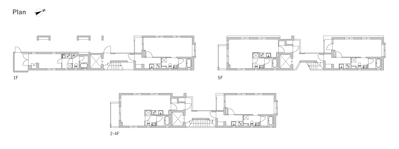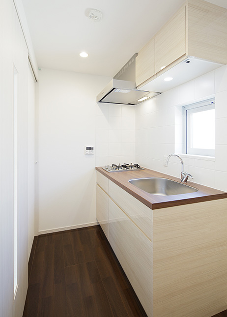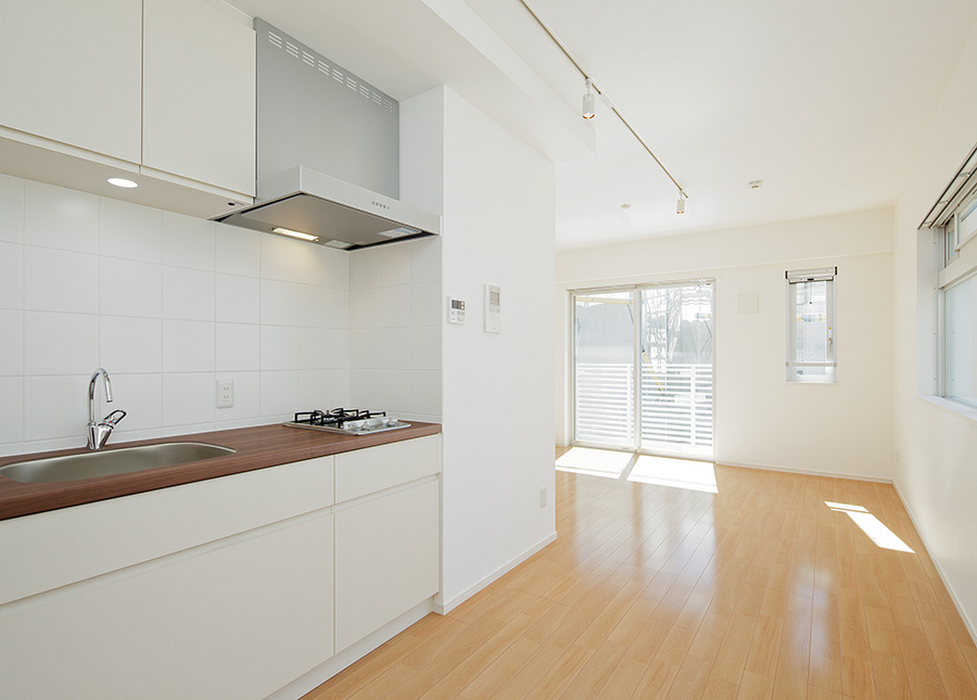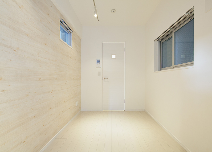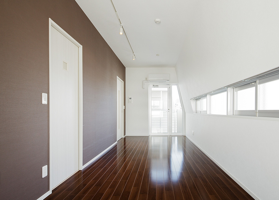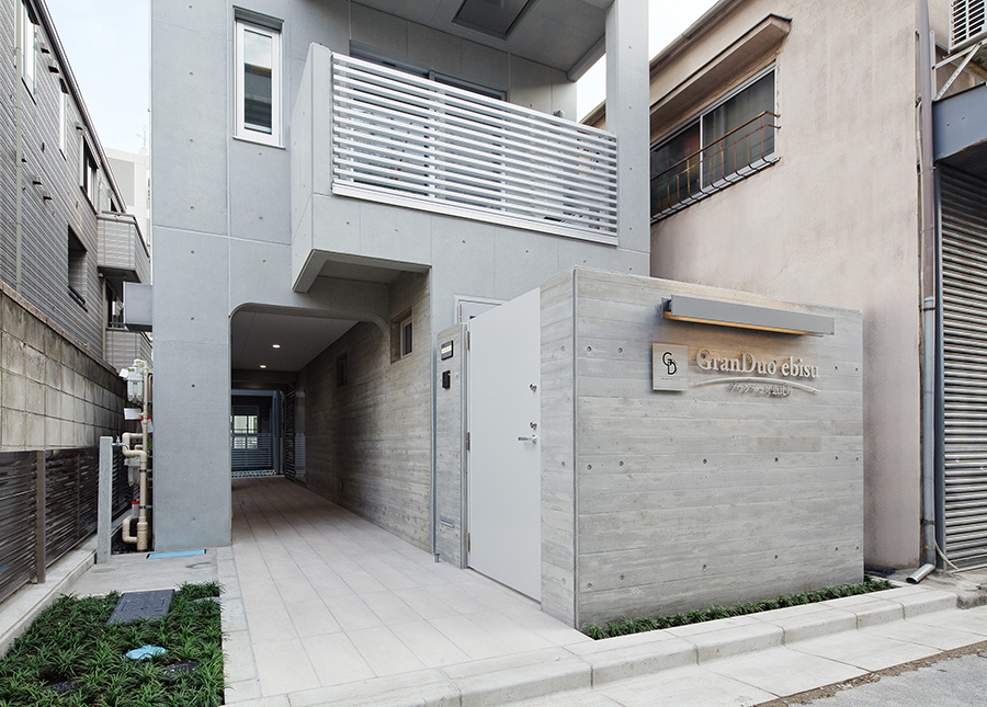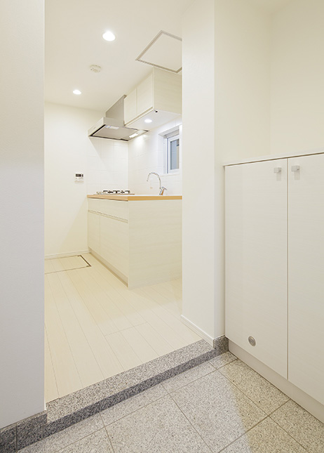 エントランスのアプローチは杉板コンクリートの壁、淡い木調のタイルの床とし、ゆるやかに木目を感じられる空間としました。南側の住戸は南面の採光を最大限取り入れられる広いワンルームのプランとしました。