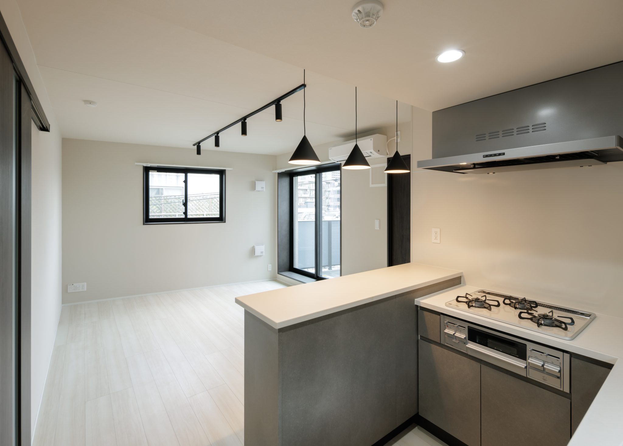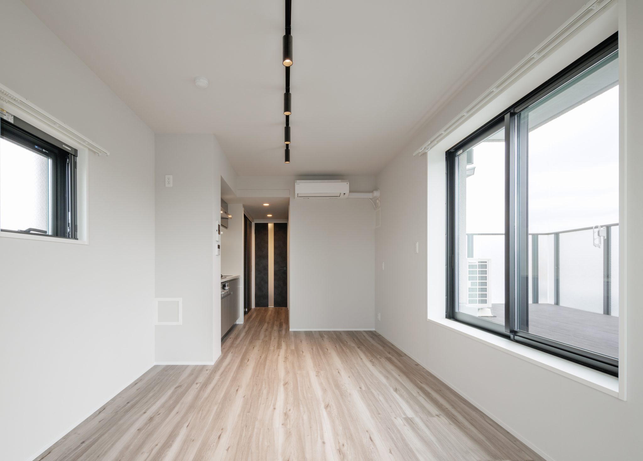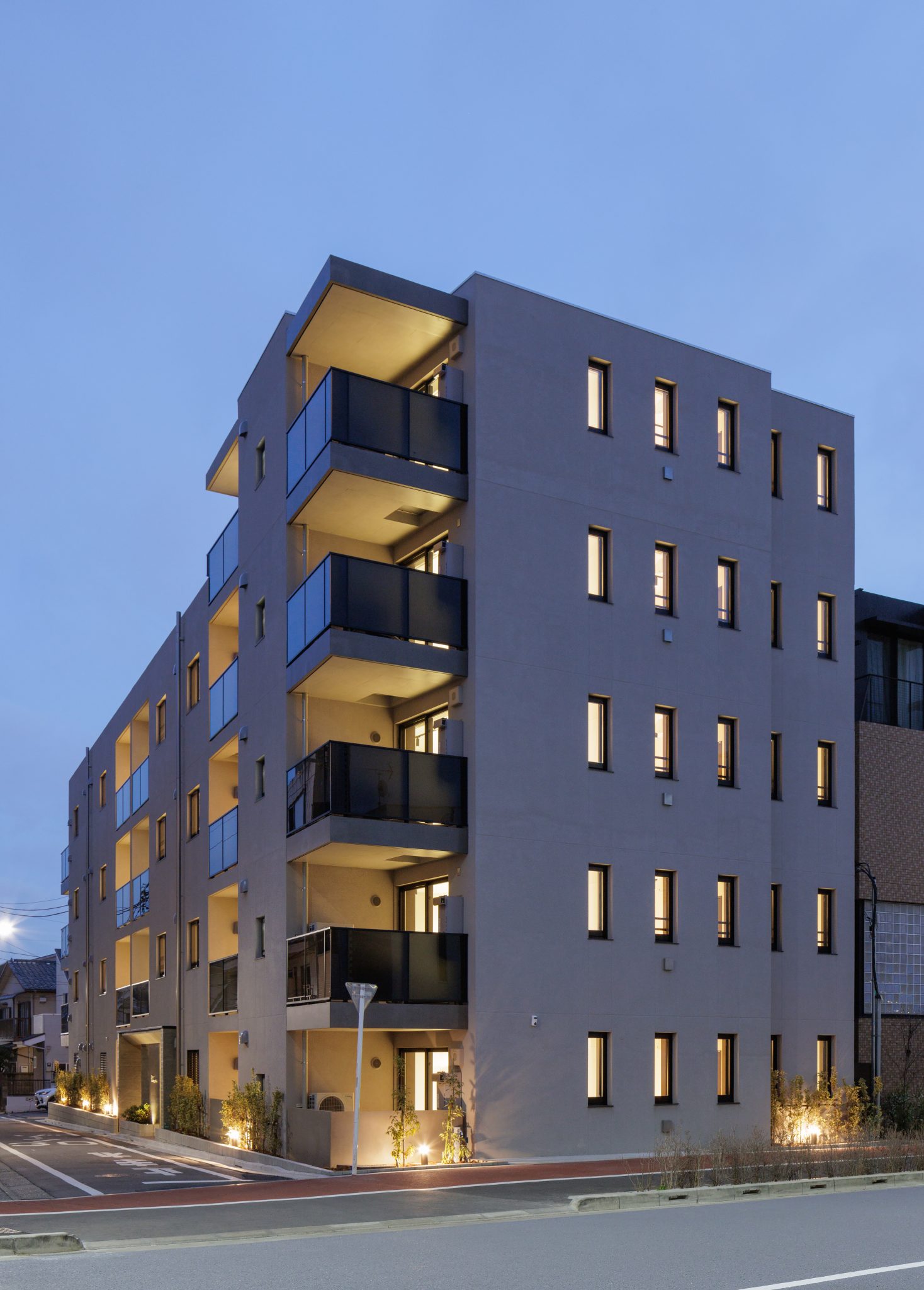 本計画地の武蔵小山では、再開発が進む商業施設がある一方で、一歩足を踏み入れれば、アーケード型商店街「パルム商店街など老舗の名店と感度の高い新店が200店舗以上と、都心らしさと昔ながらのゆったりとした空気感が味わえる街です。設計の特徴としては、街並みの変化に対応するべく、最大限の容積を活かした計画としています。三方が道路に面しており、南側には隣家が近接していることから、プライバシー確保のためバルコニーの手すり部分に曇りガラスを採用しています。これにより、外部からの視線を抑えながらも大開口を設けることができ、十分な採光を確保しています。また、梁を上階の床側に配置する「逆梁」を可能な限り採用することで、天井をフラットに仕上げています。この工夫により、構造的な安定性を確保しながら開放感のある空間を実現しています。