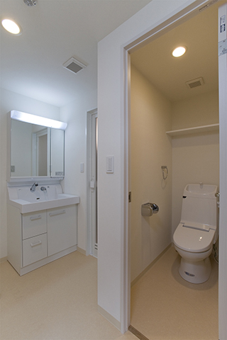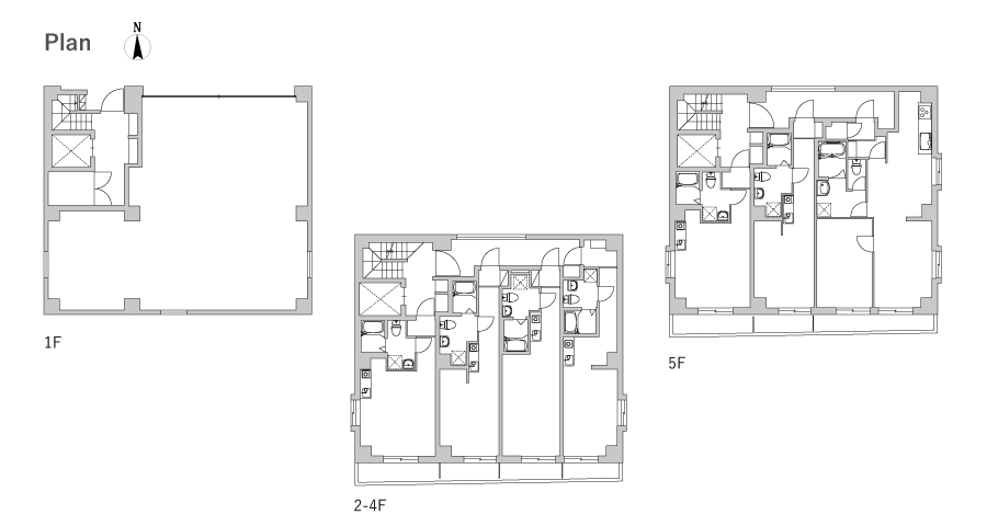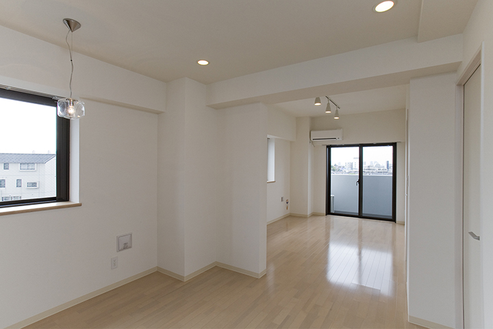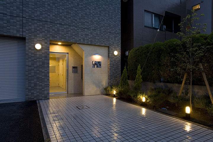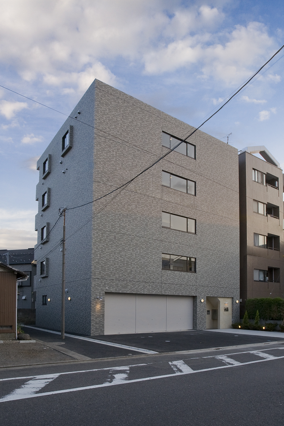 GranDuo 田園調布は、自由ヶ丘と田園調布の中間に位置し、1階は店舗、2〜5階はワンルーム14戸、最上階に1LDKが1戸の建物です。前面道路は都市計画道路のため、6mほど後退した配置となりました。外観はグレーのタイル貼り。正面は各階一か所、両袖引き窓を中央に配置し、対称的な外観としました。内装は白を基調とし、明るくナチュラルな印象で、南に開けたバルコニーからは、田園調布の街並みを見ることができます。また、クローゼットは、可動式のものとし、入居者が自由に配置することができます。